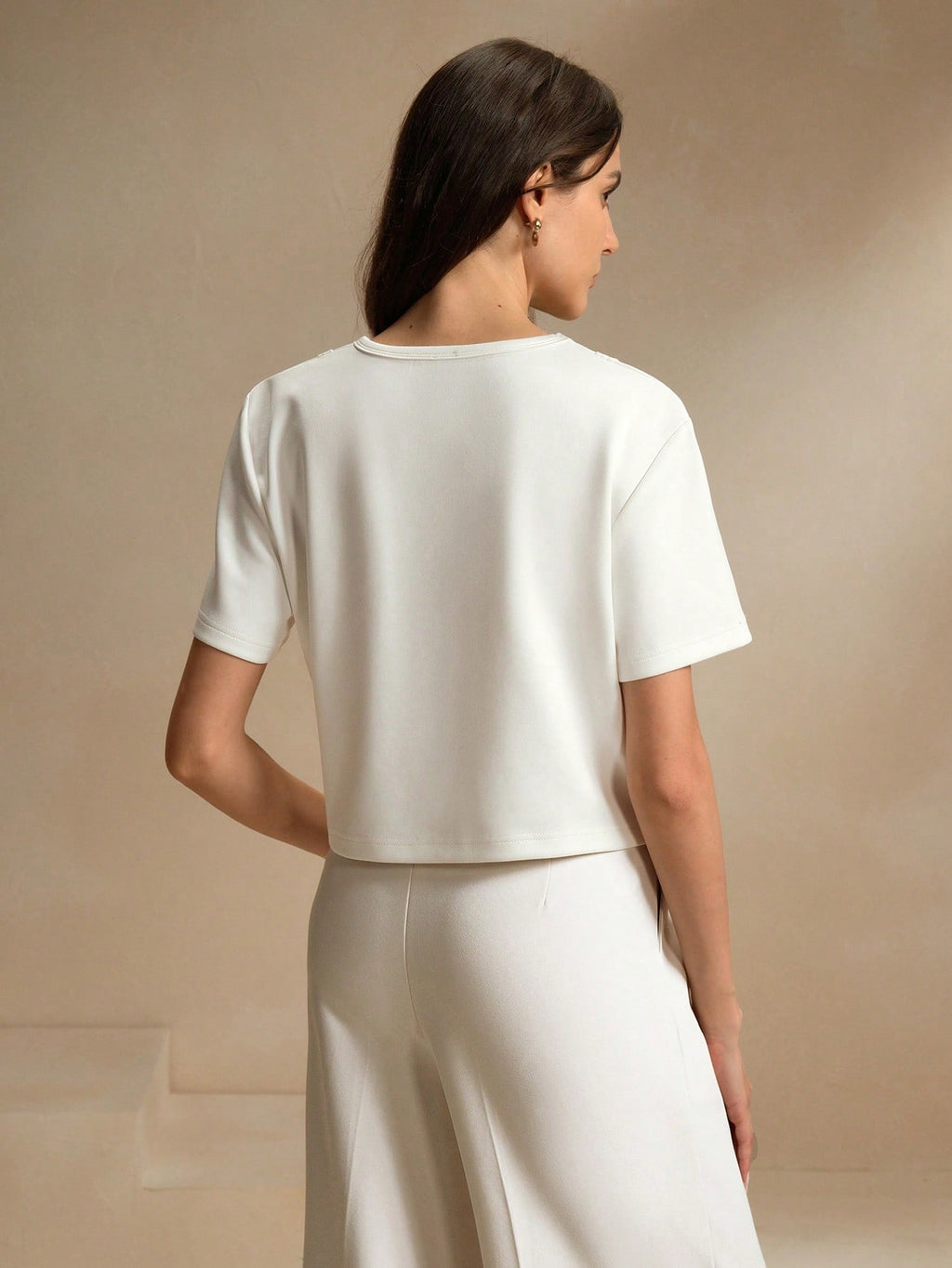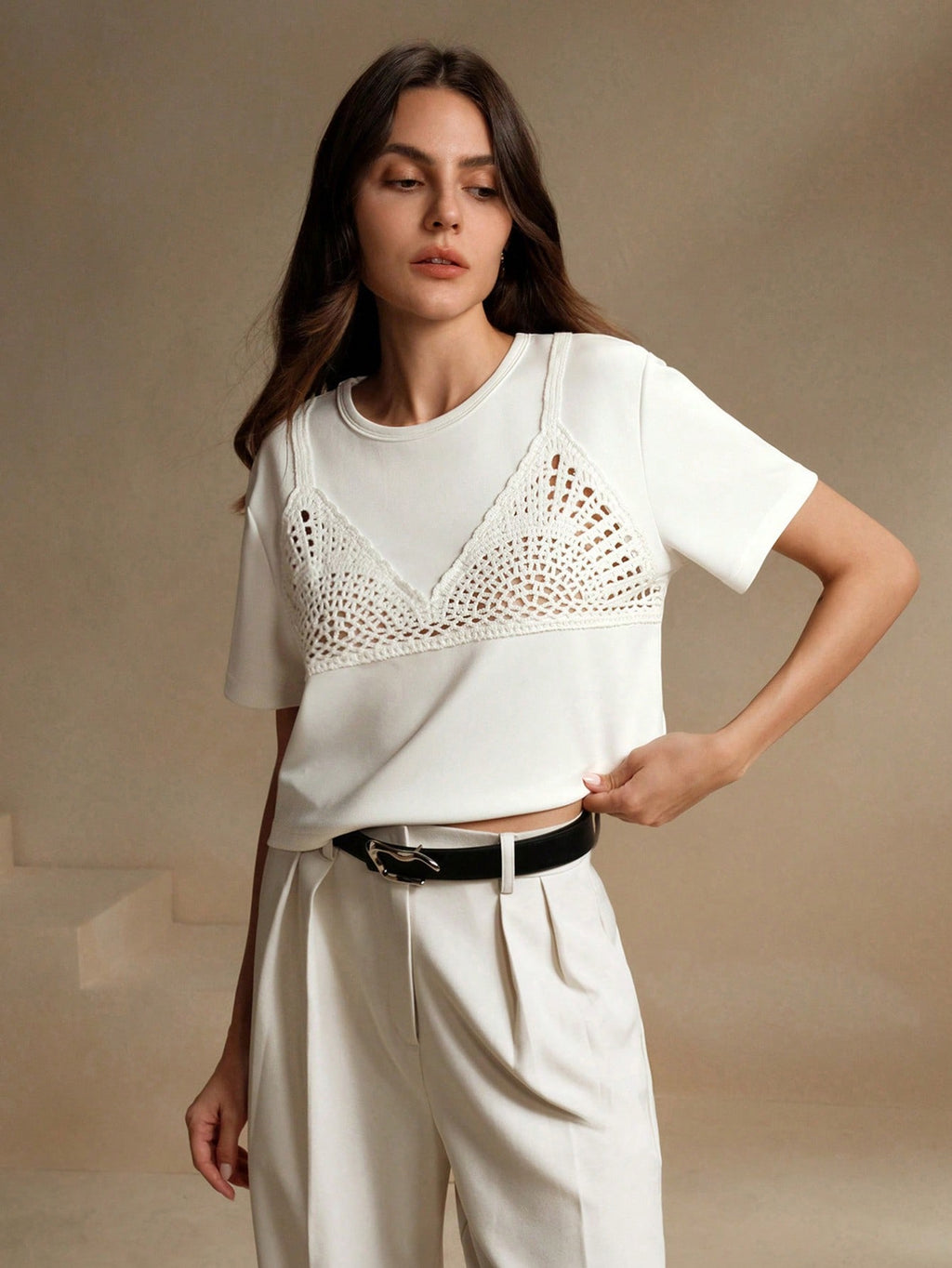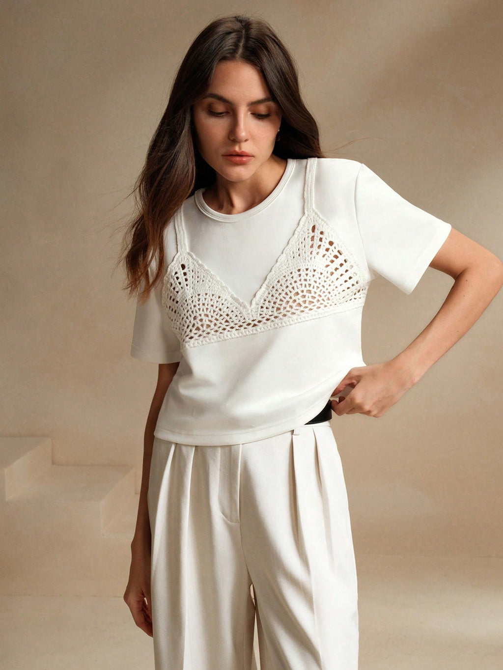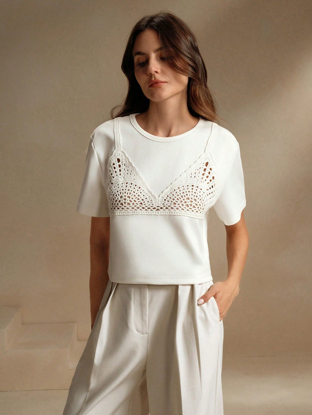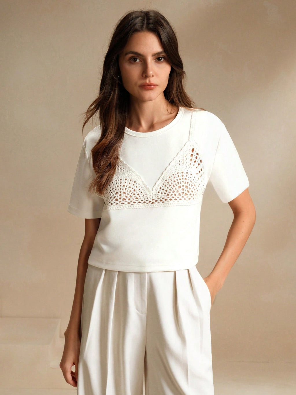 MIU Women's Round Neck Short Sleeve Lace Patchwork Loose Crop Top, Summer