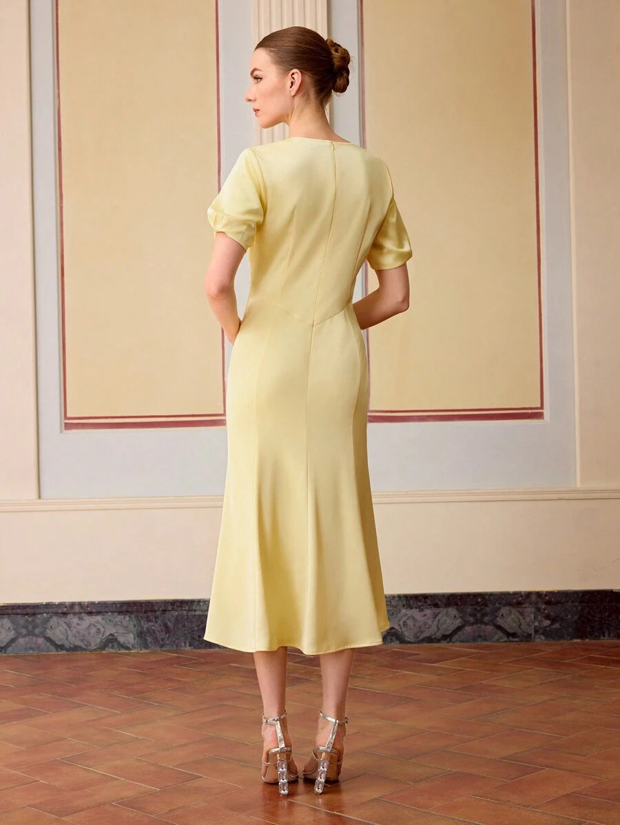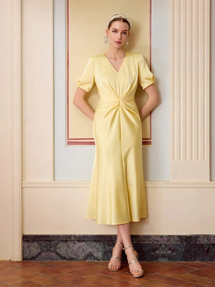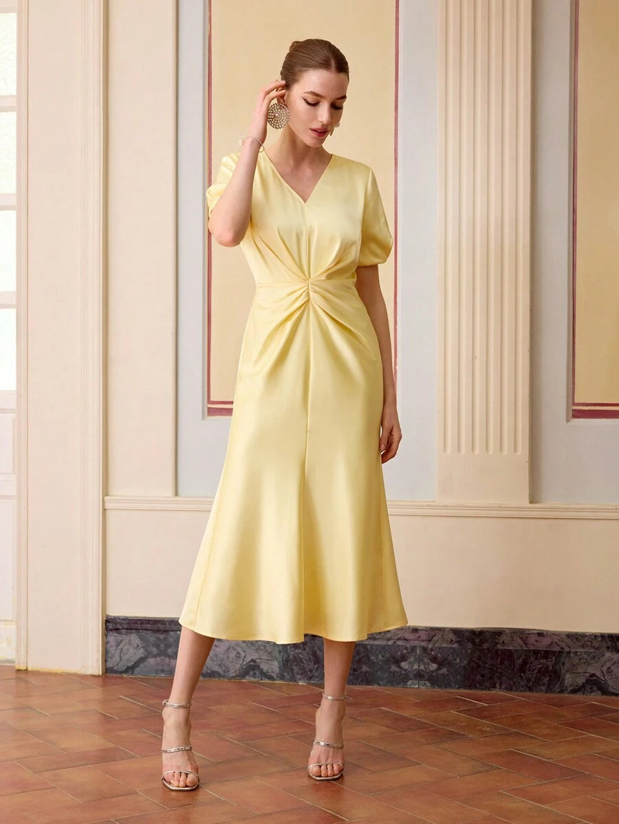 MIU WOMEN'S RUCHED PUFF SLEEVE BIAS CUT MIDI DRESS, SPRING SATIN DRESS, V Neck