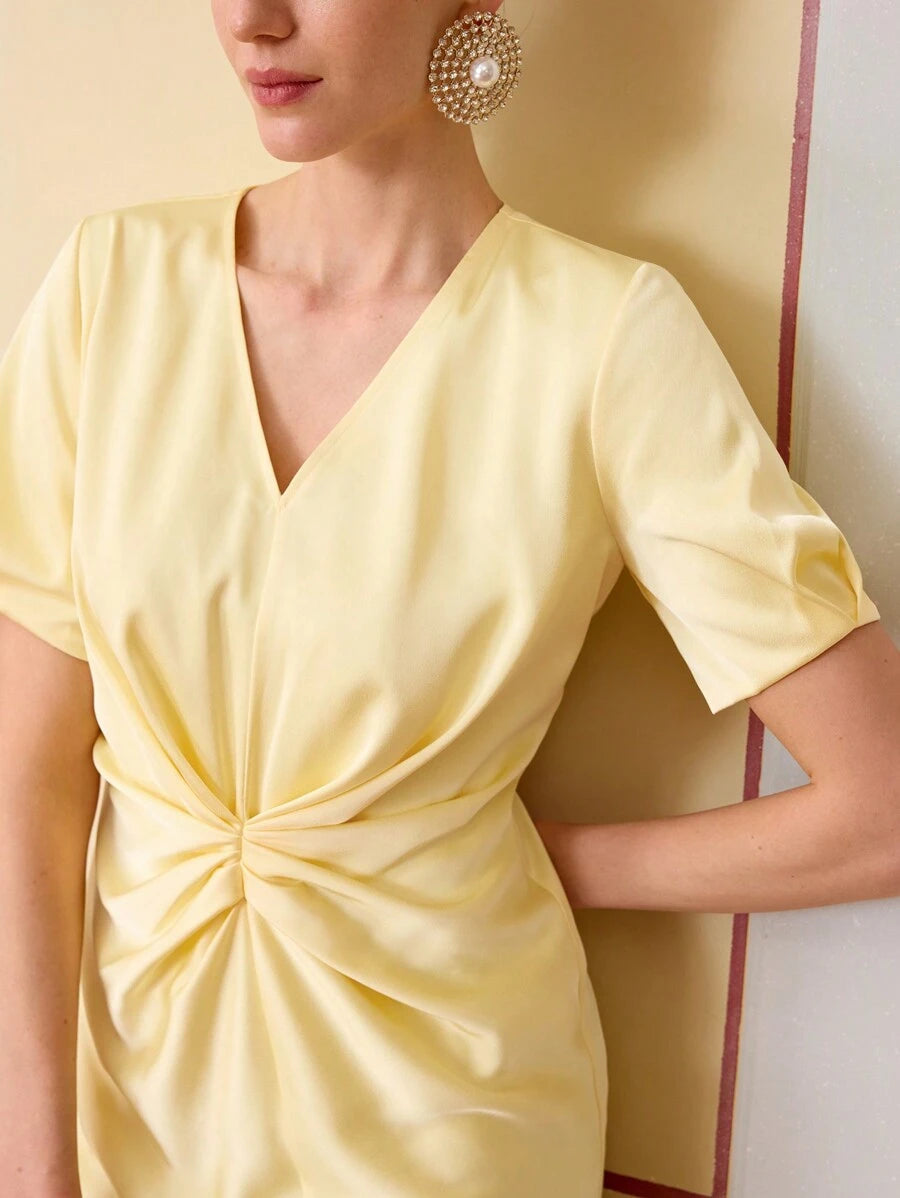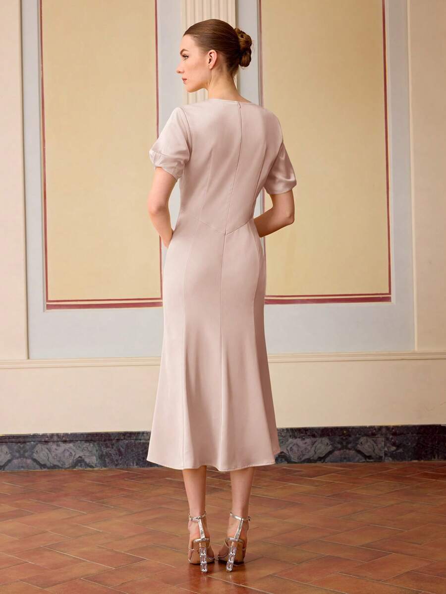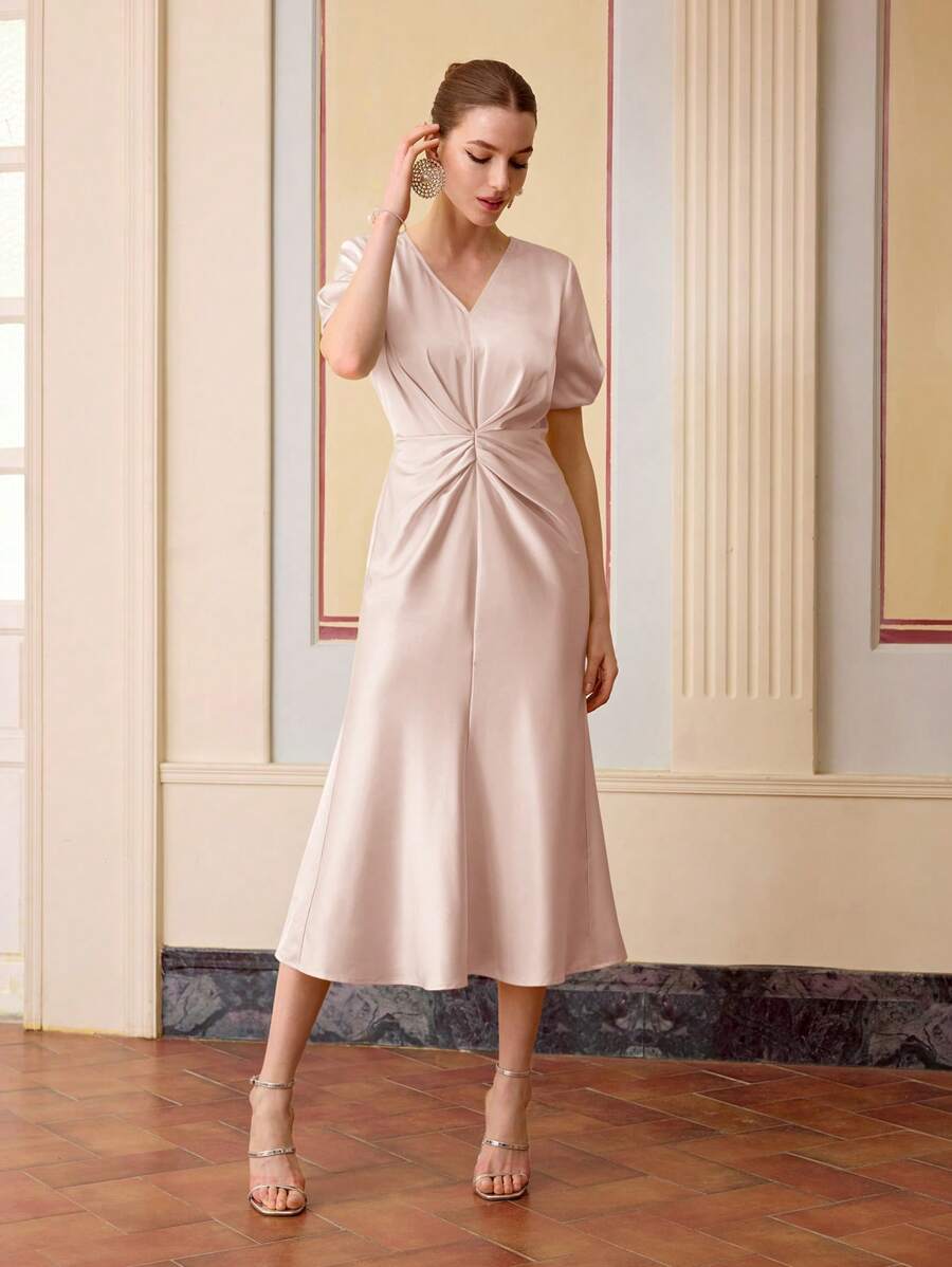MIU WOMEN'S RUCHED PUFF SLEEVE BIAS CUT MIDI DRESS, SPRING SATIN DRESS, V Neck