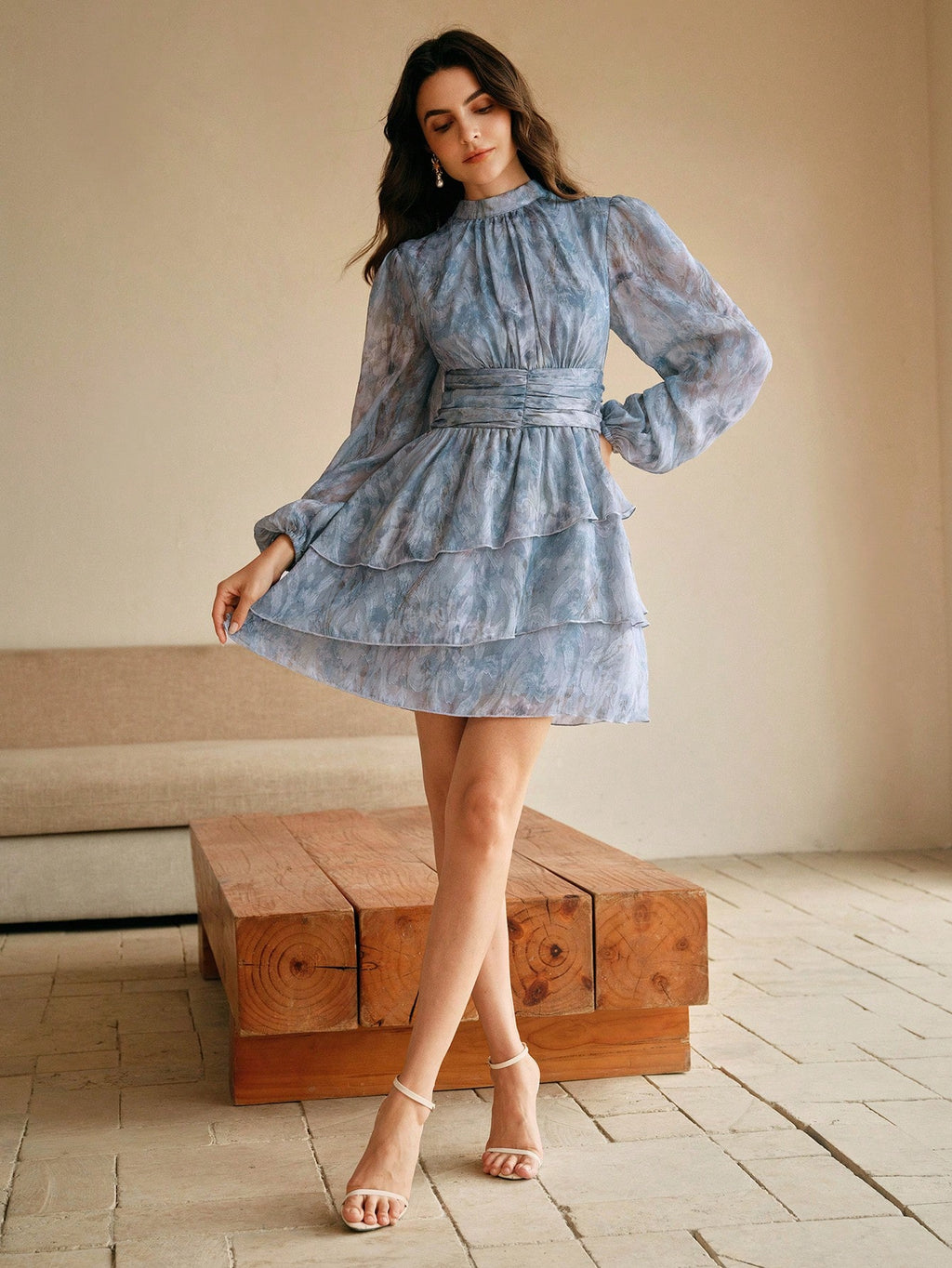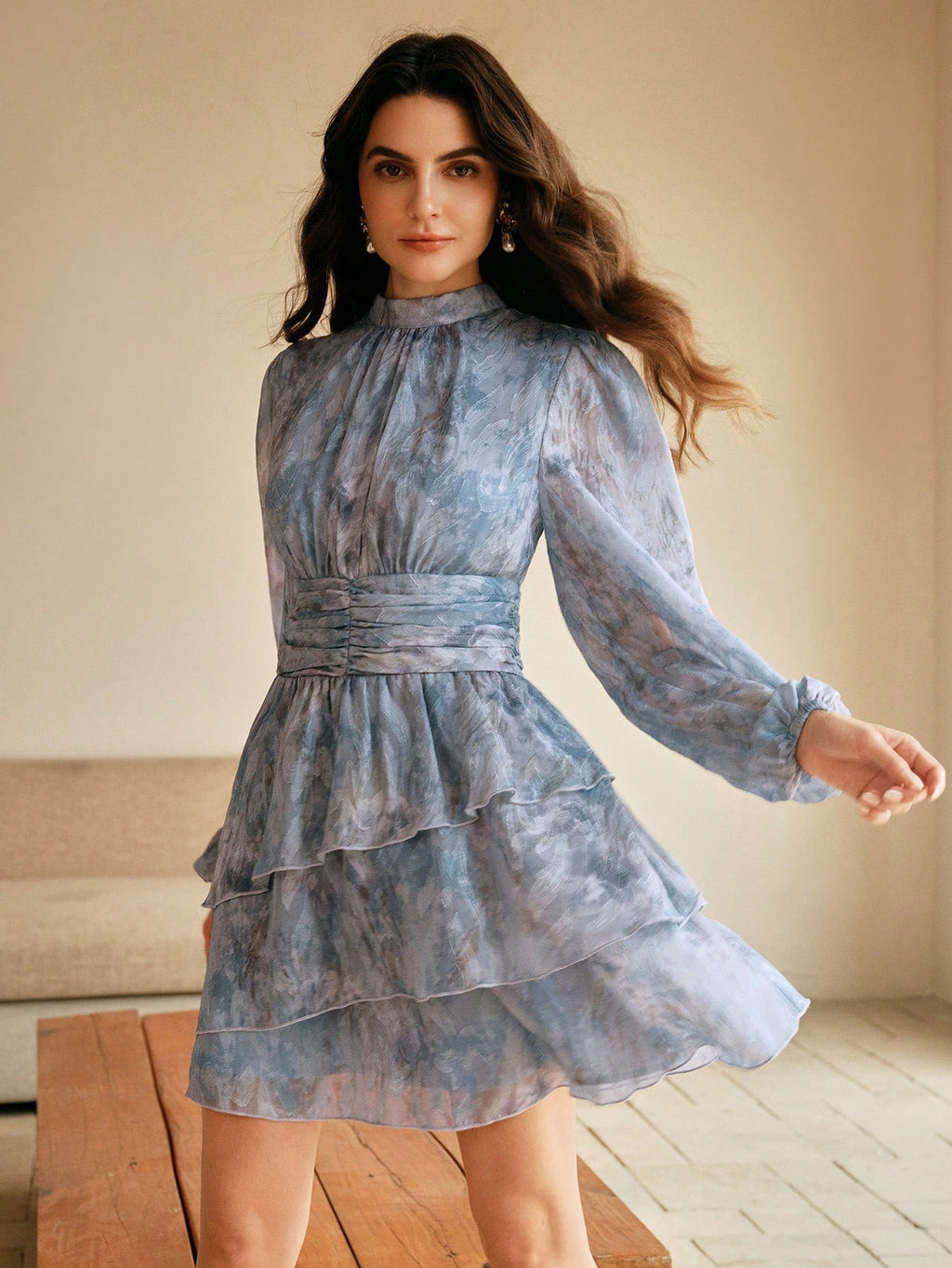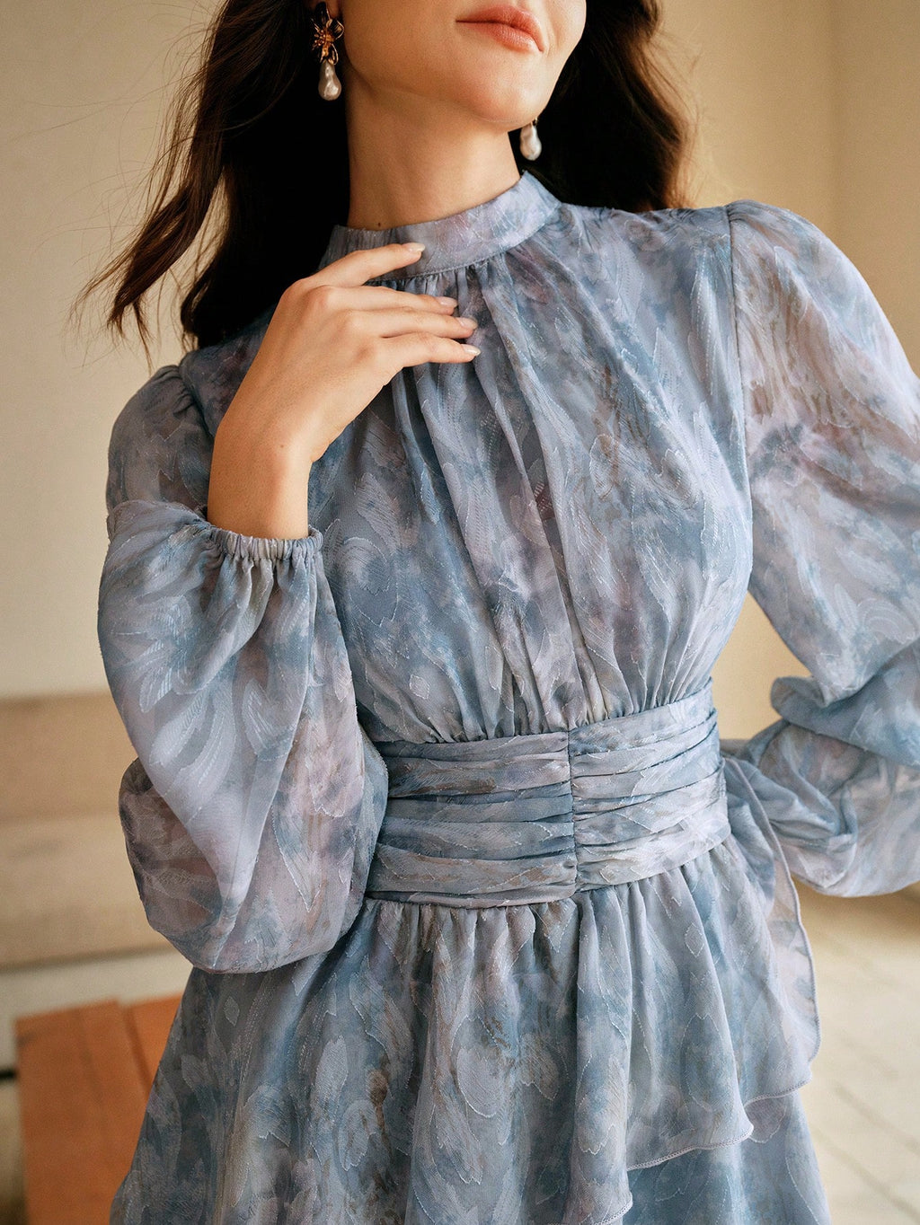 MIU Women's Short Pleated Waist Long Sleeve Jacquard Weave Dress, Elegant And Luxurious Style, Suitable For Spring Outfits