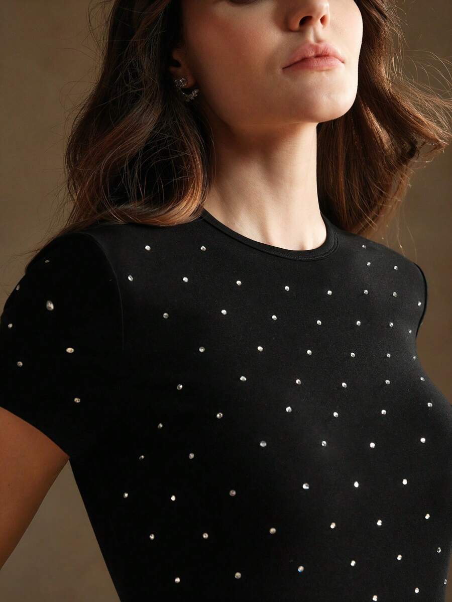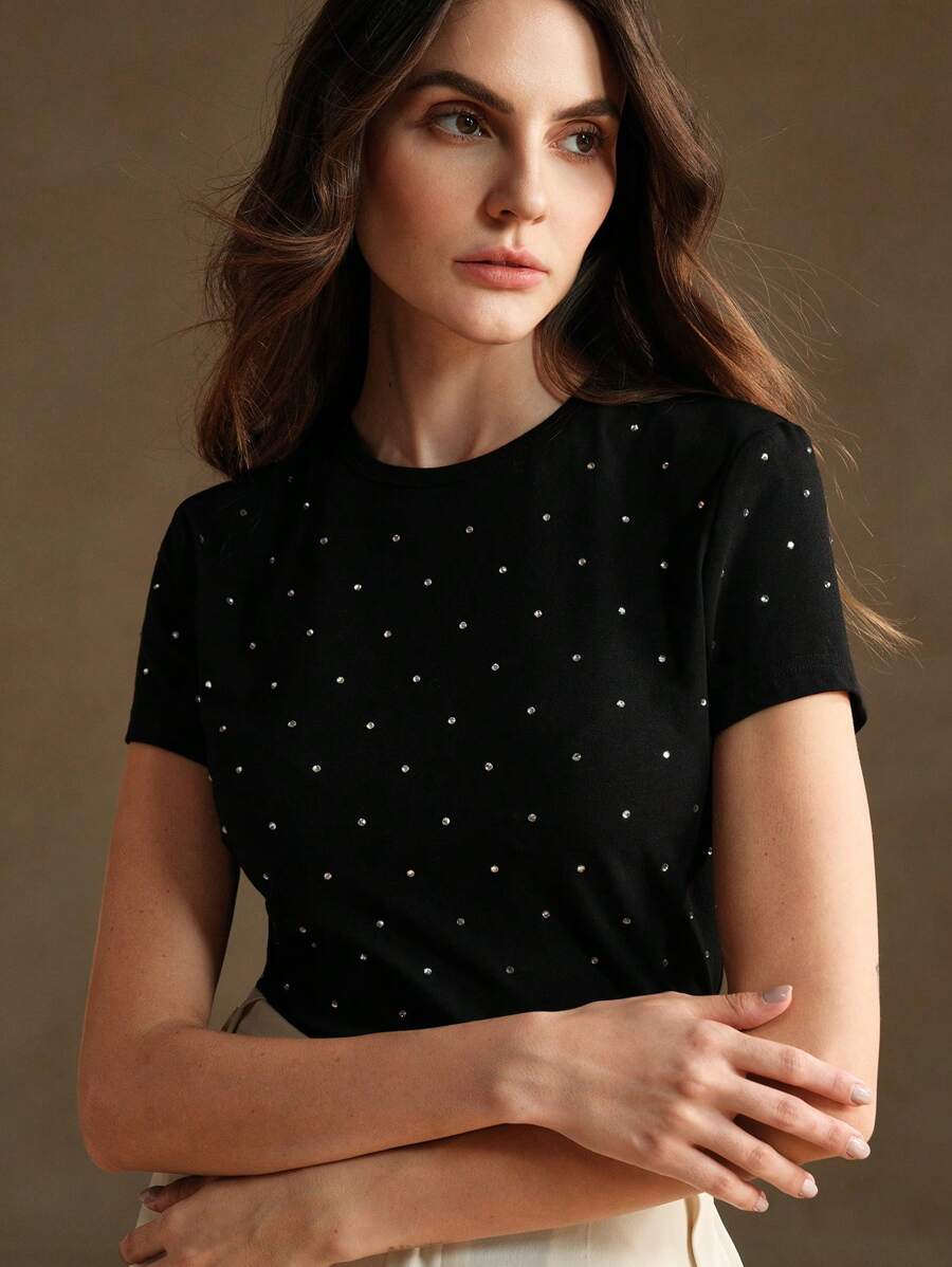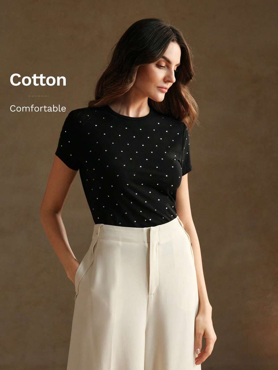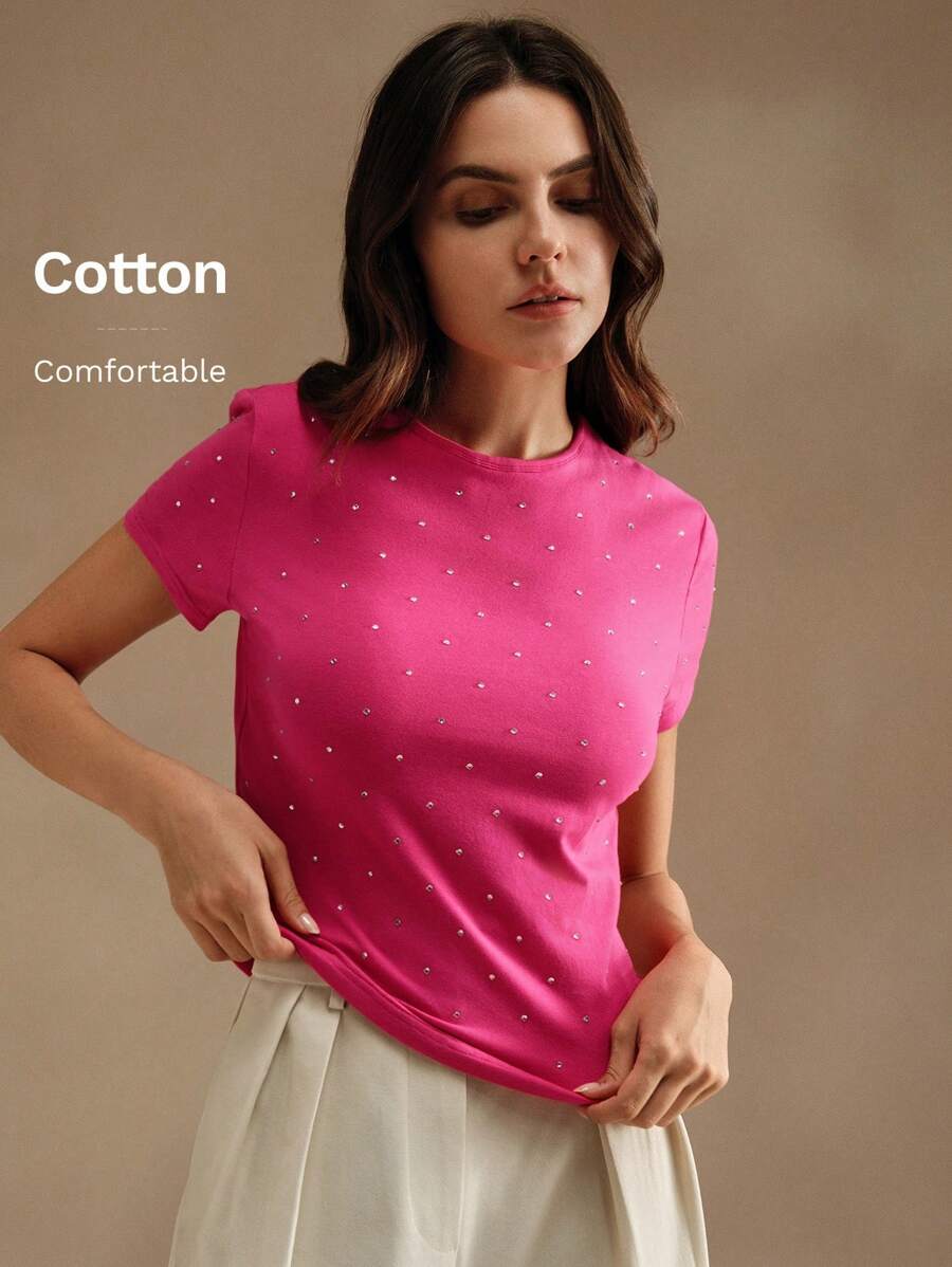 MIU Women's Simple Rhinestone Embellished Round Neck Short Sleeve T-Shirt, Casual