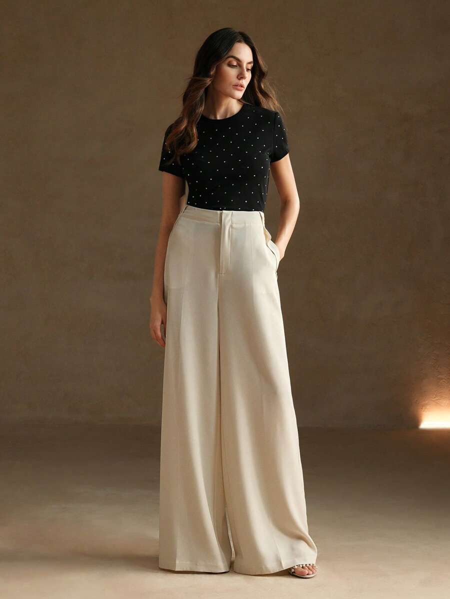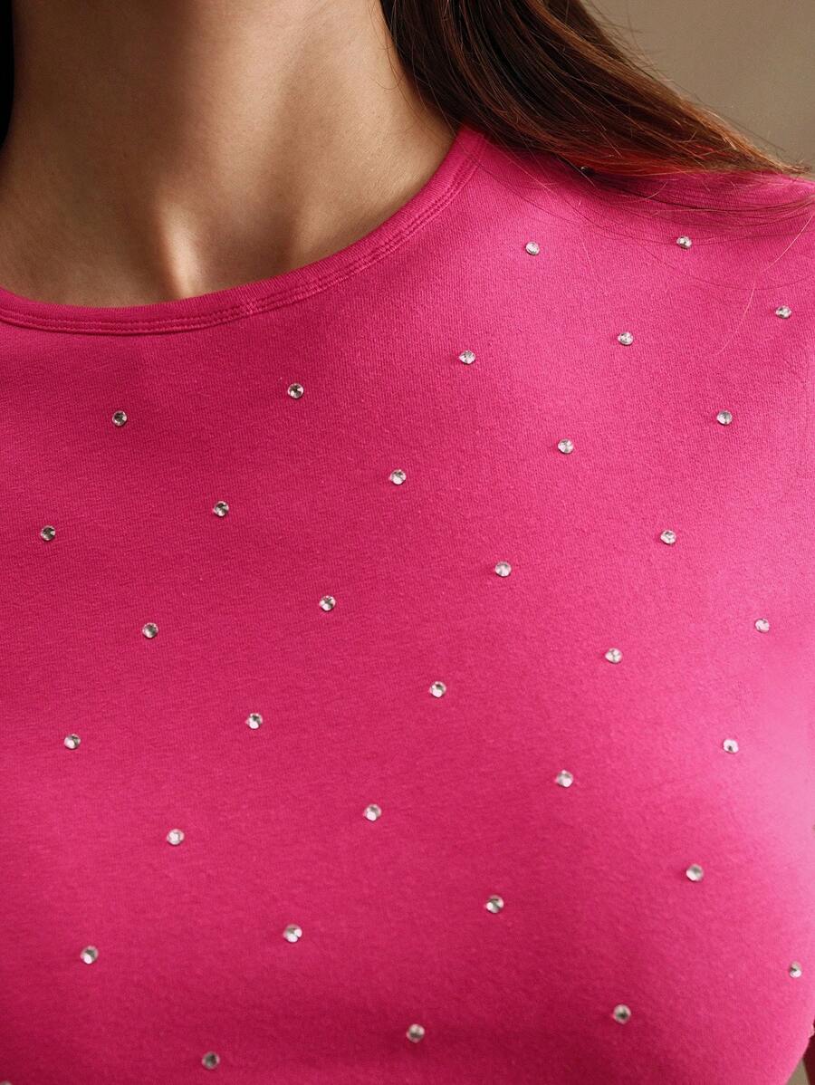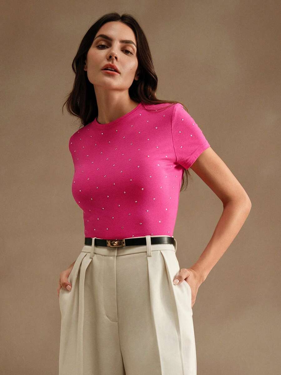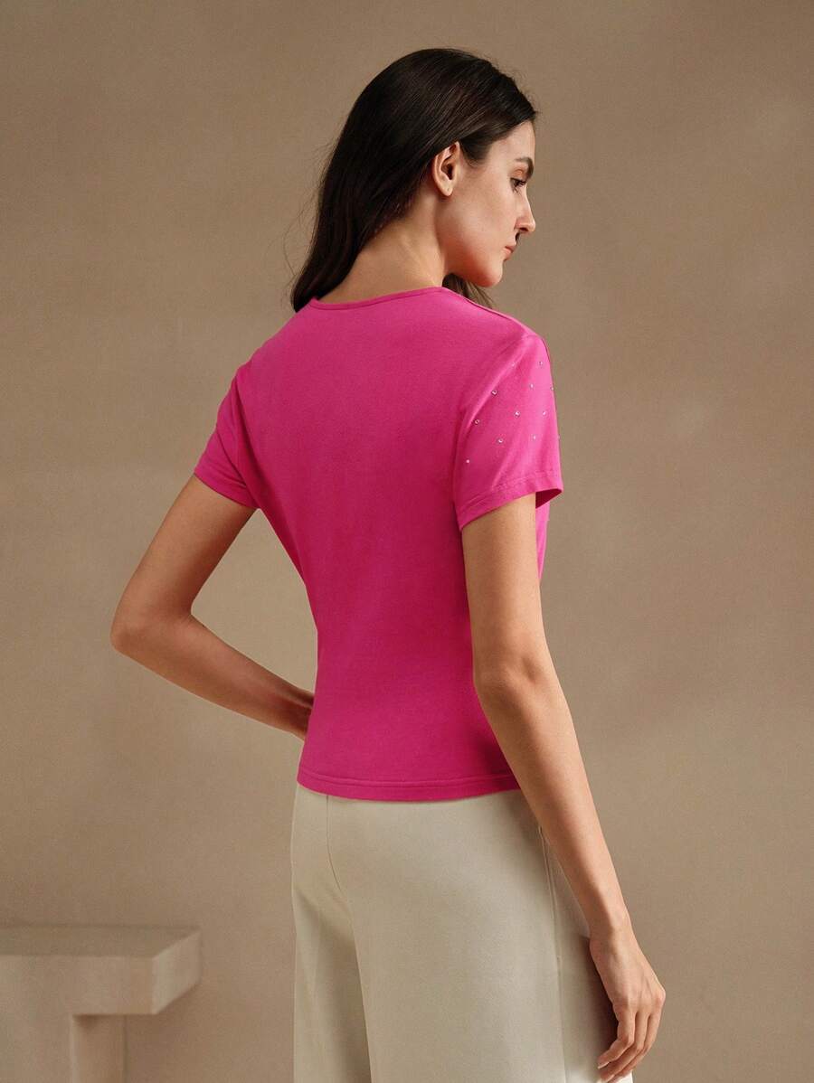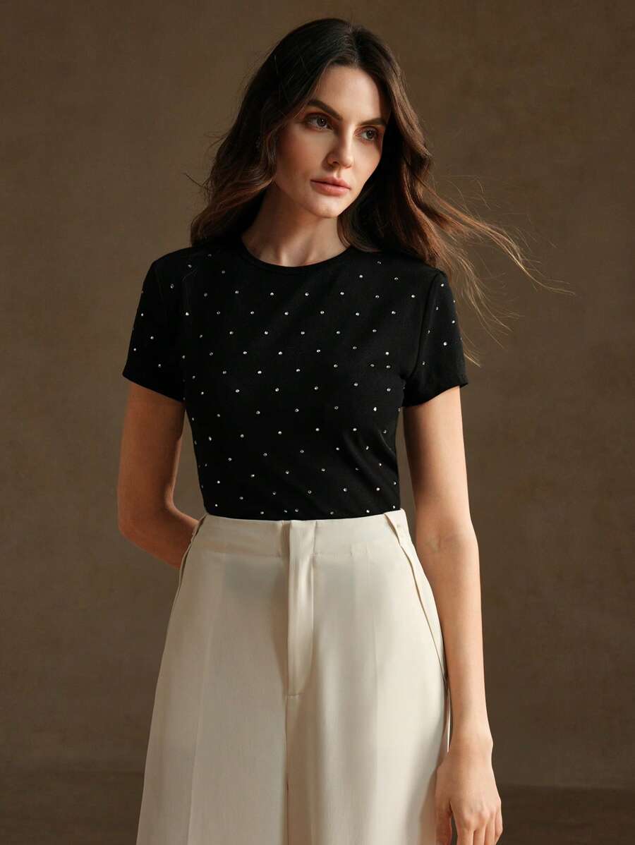 MIU Women's Simple Rhinestone Embellished Round Neck Short Sleeve T-Shirt, Casual