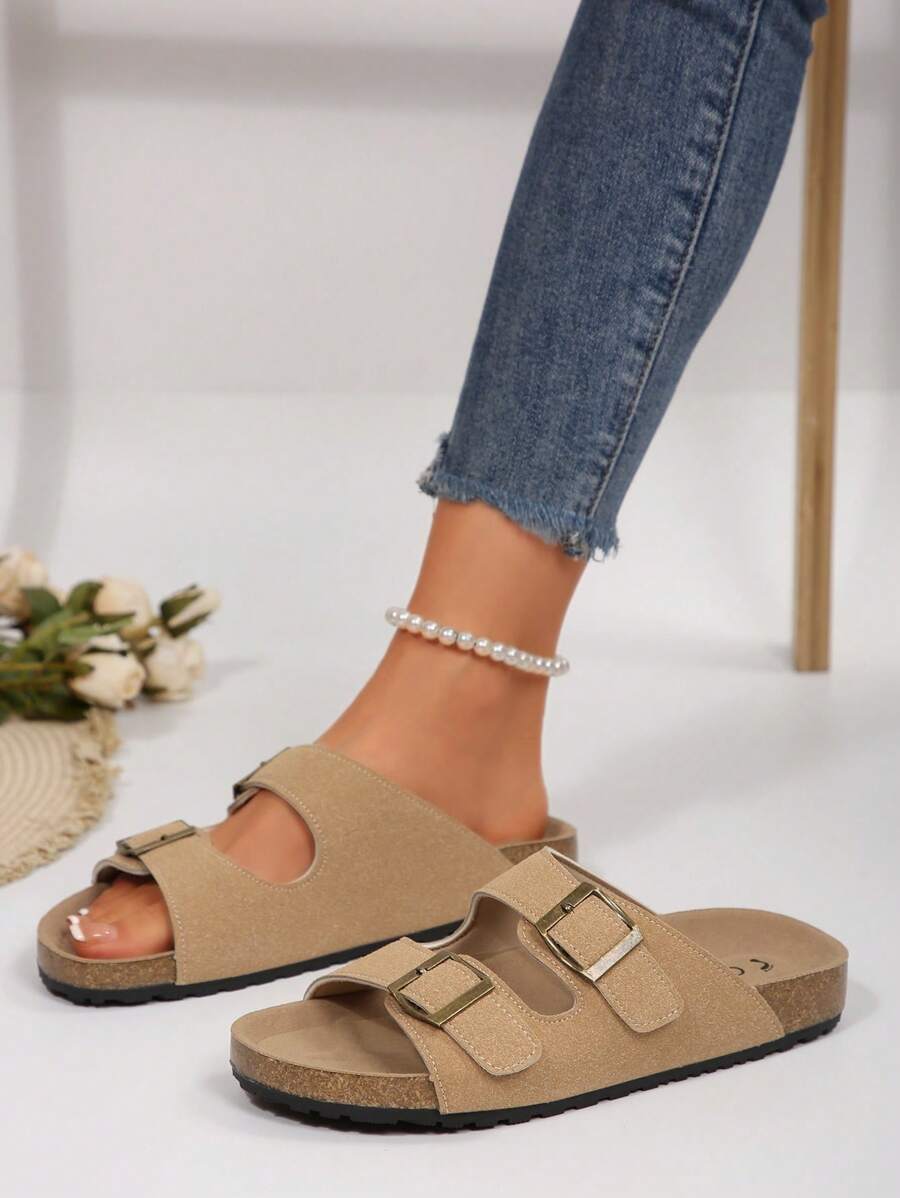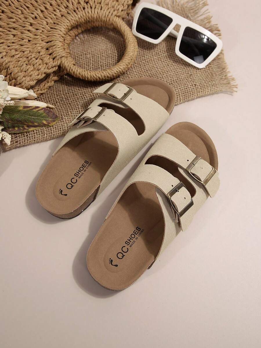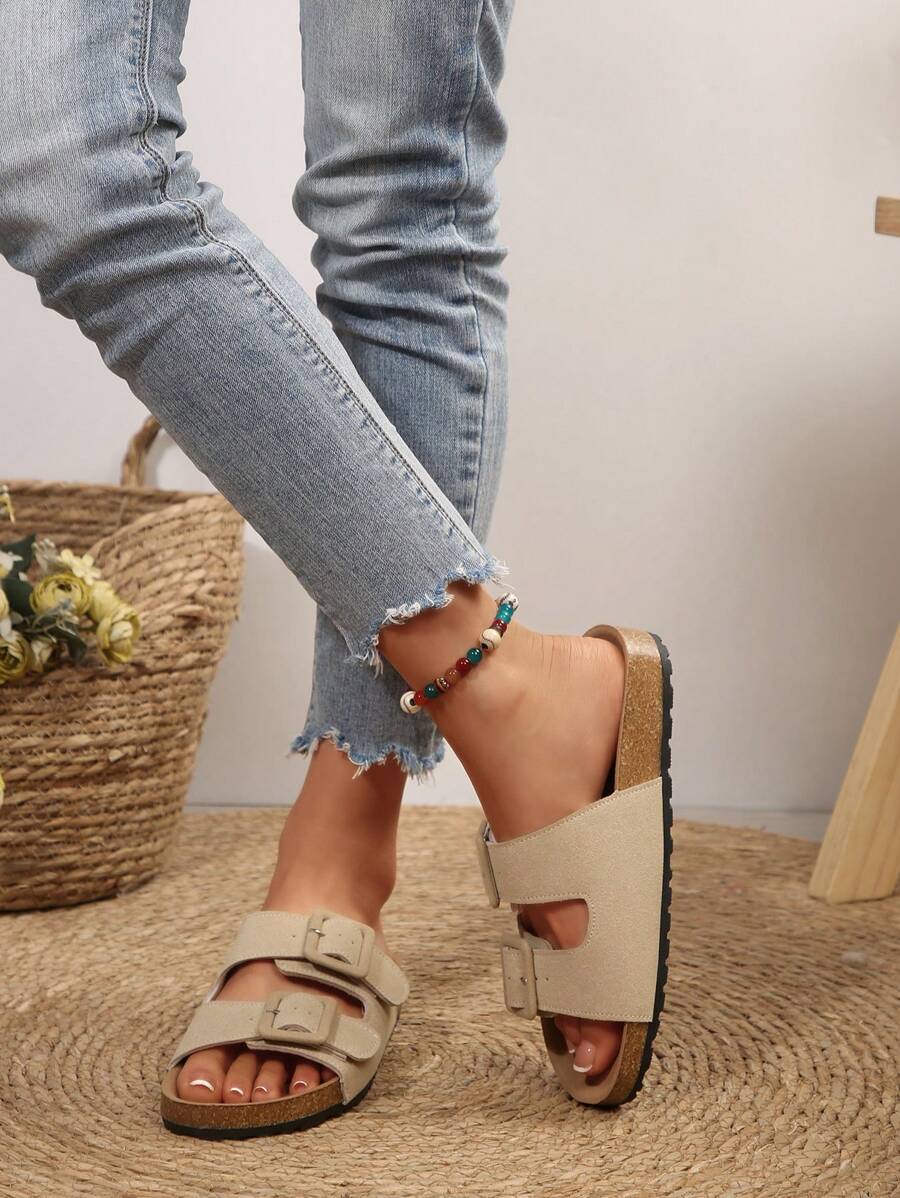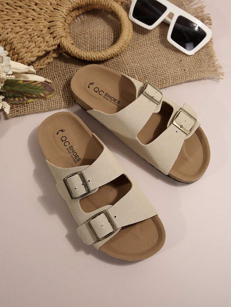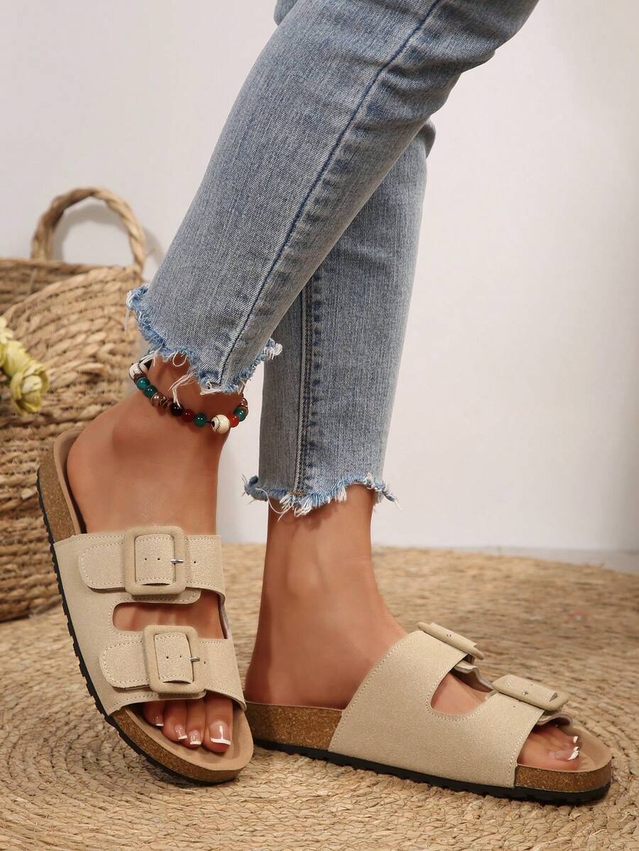 MIU Women's Simple Summer Open Back Comfortable Holiday Buckle Flat Mules Sandals In Beige Color