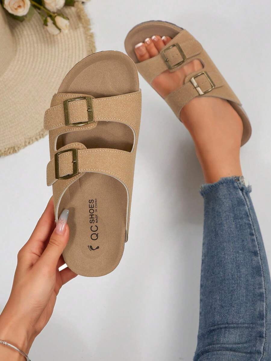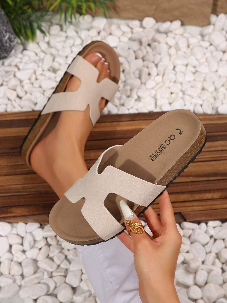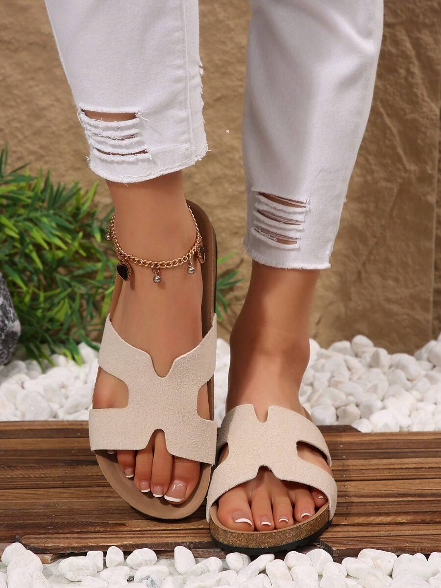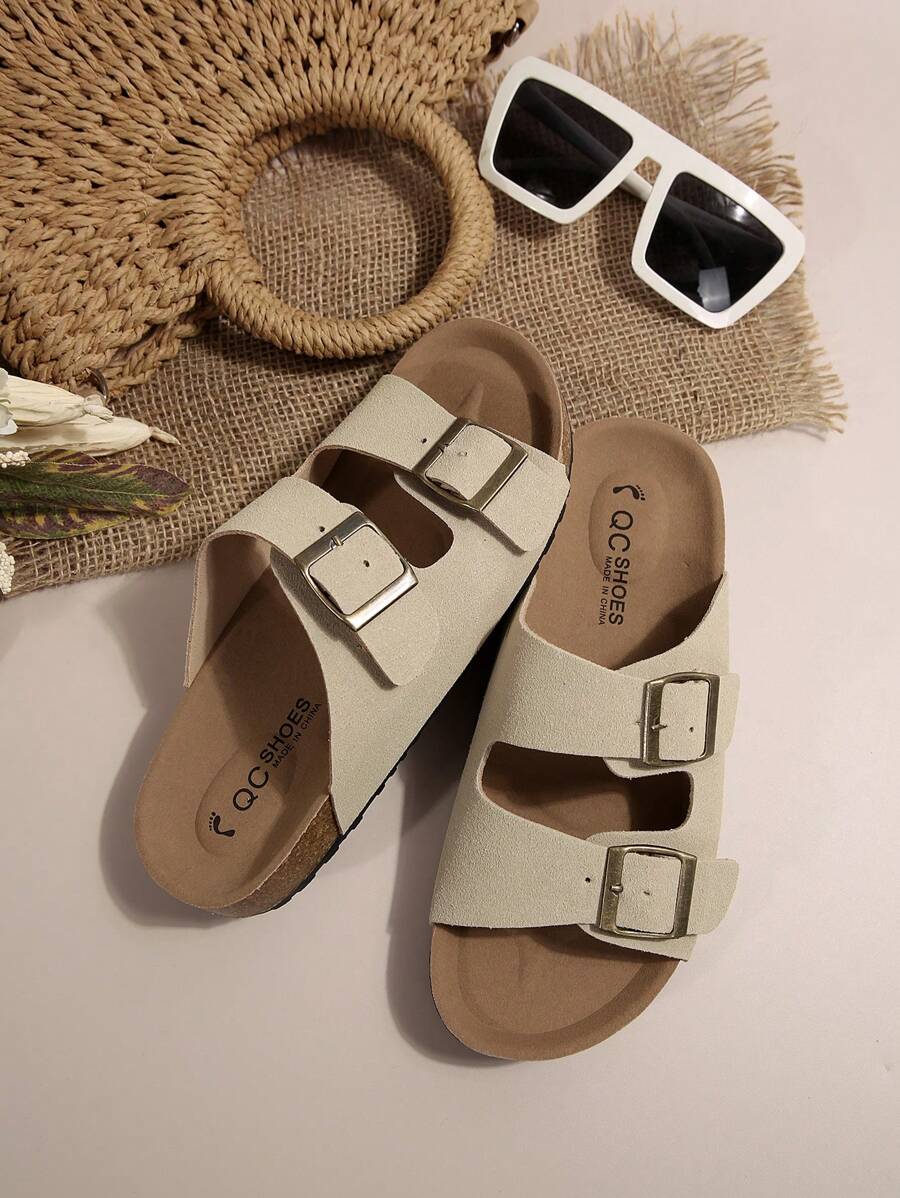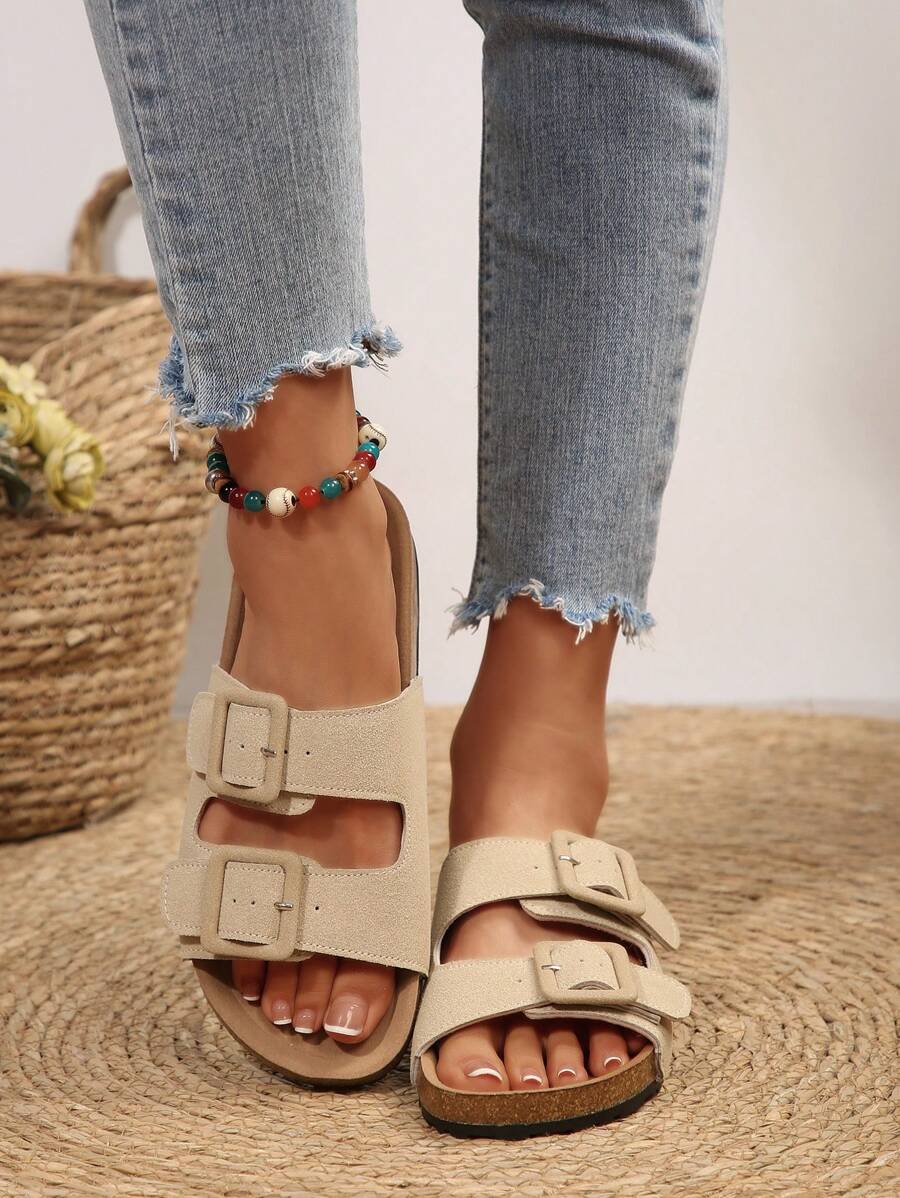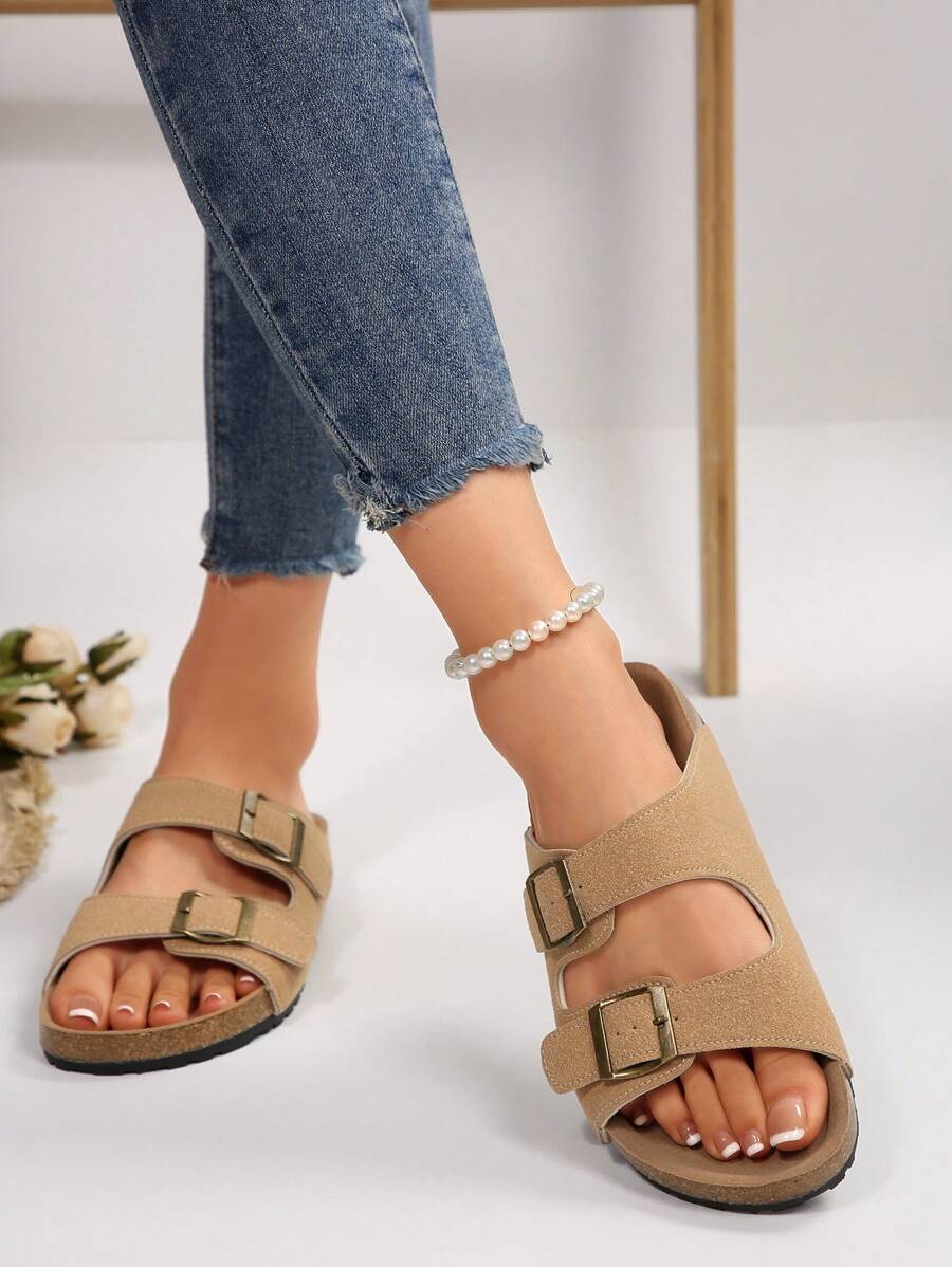 MIU Women's Simple Summer Open Back Comfortable Holiday Buckle Flat Mules Sandals In Beige Color
