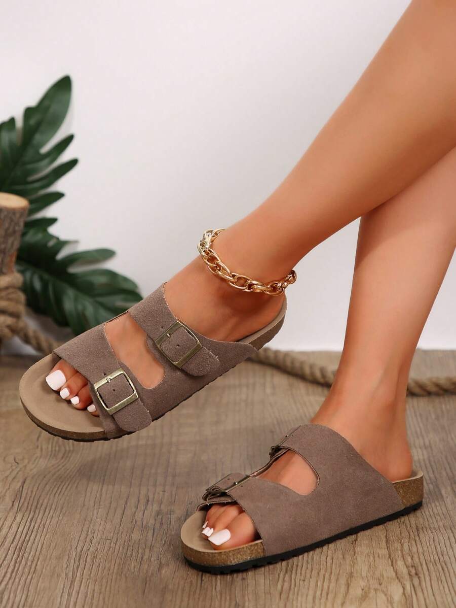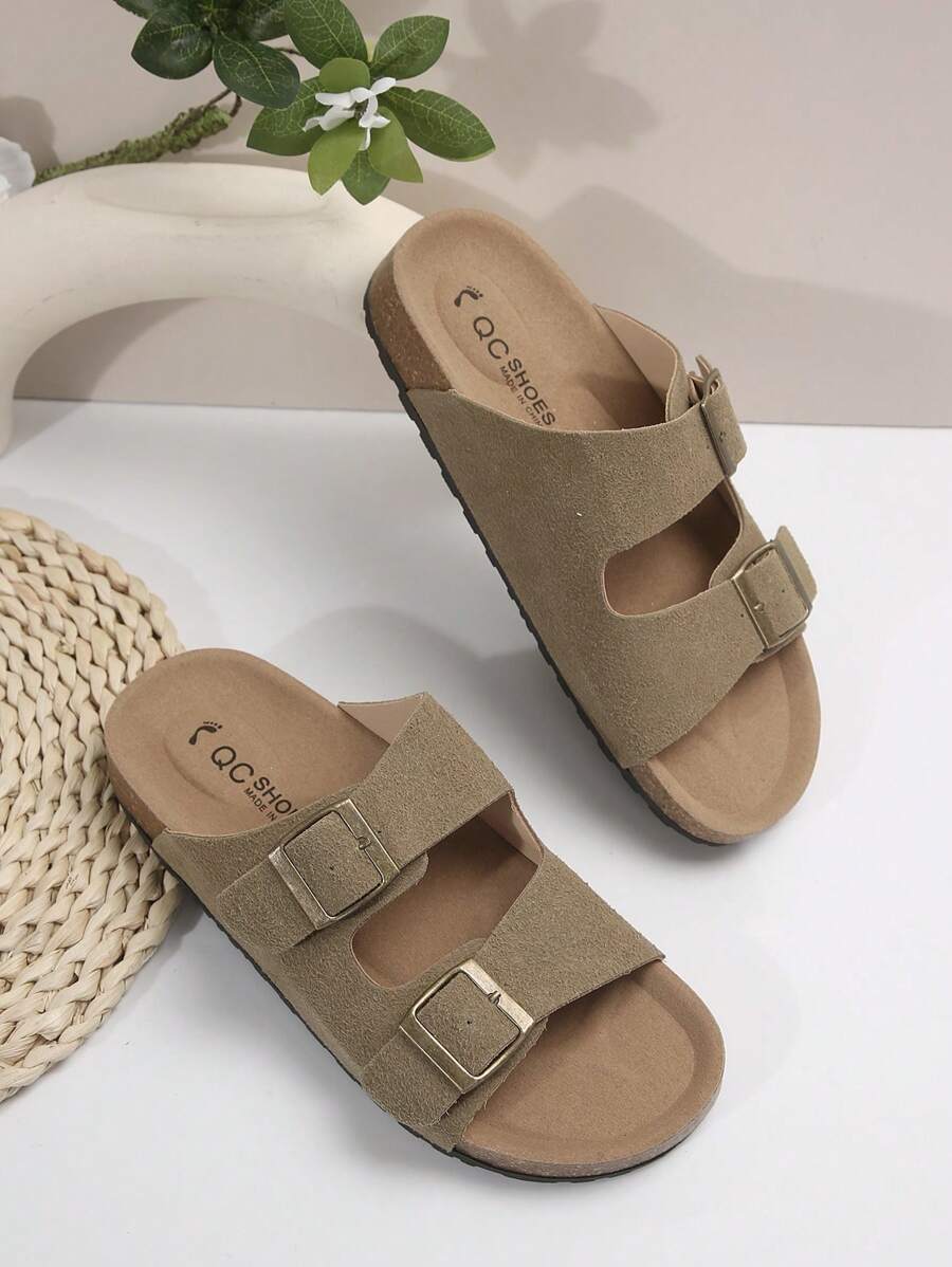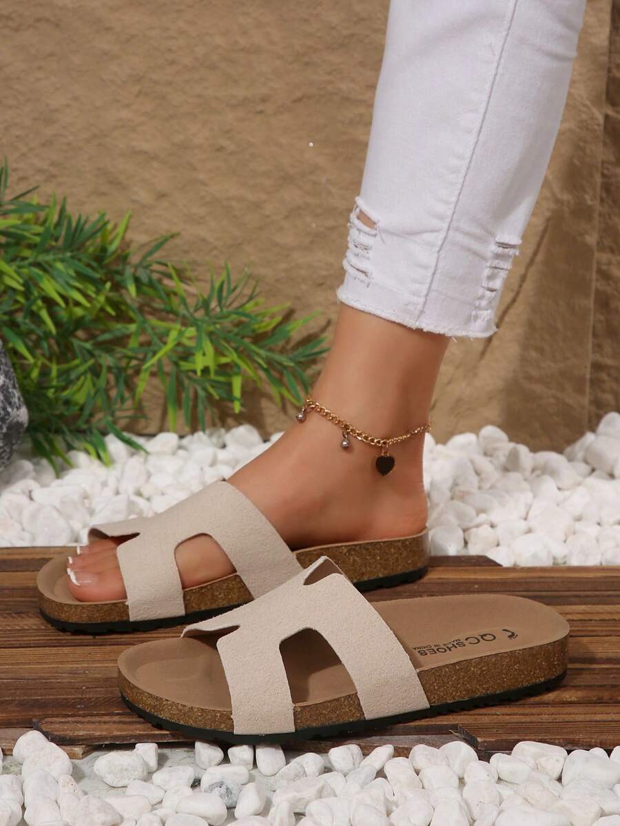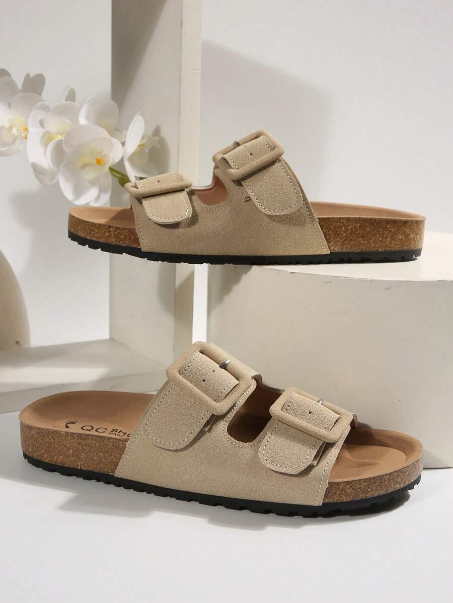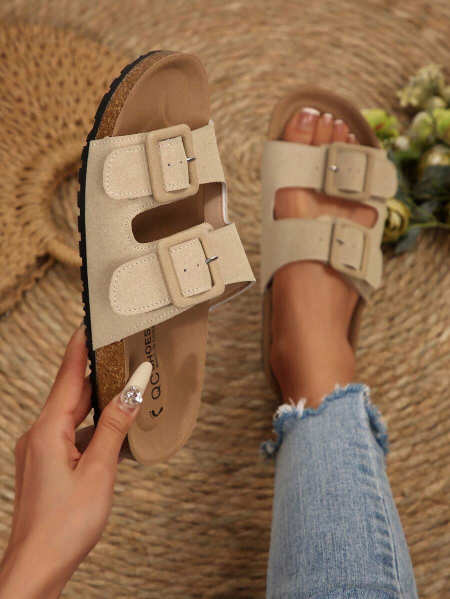 MIU Women's Simple Summer Open Back Comfortable Holiday Buckle Flat Mules Sandals In Beige Color