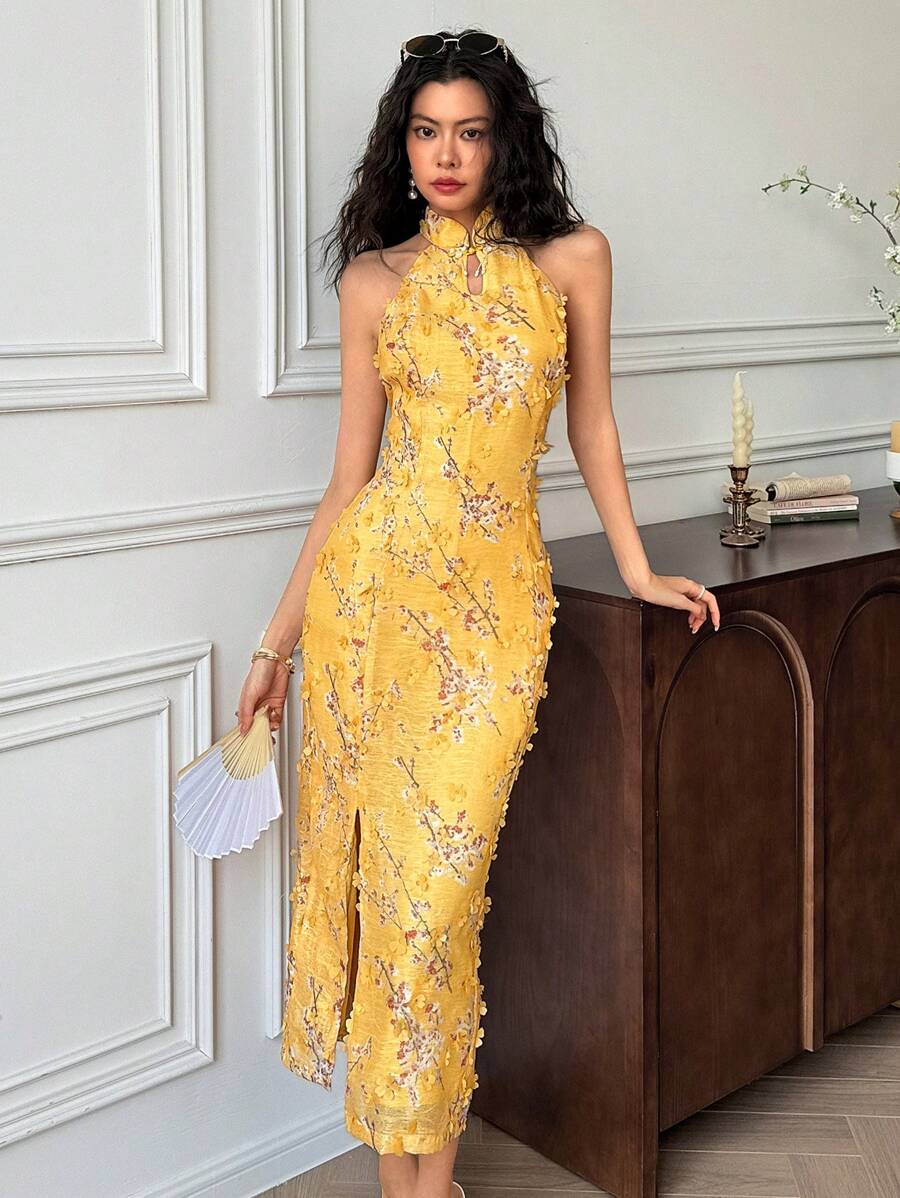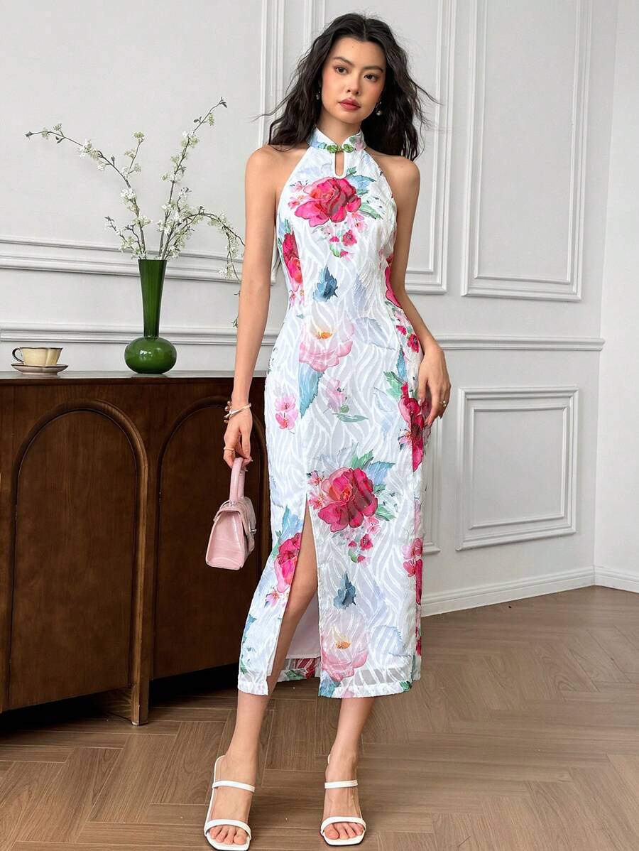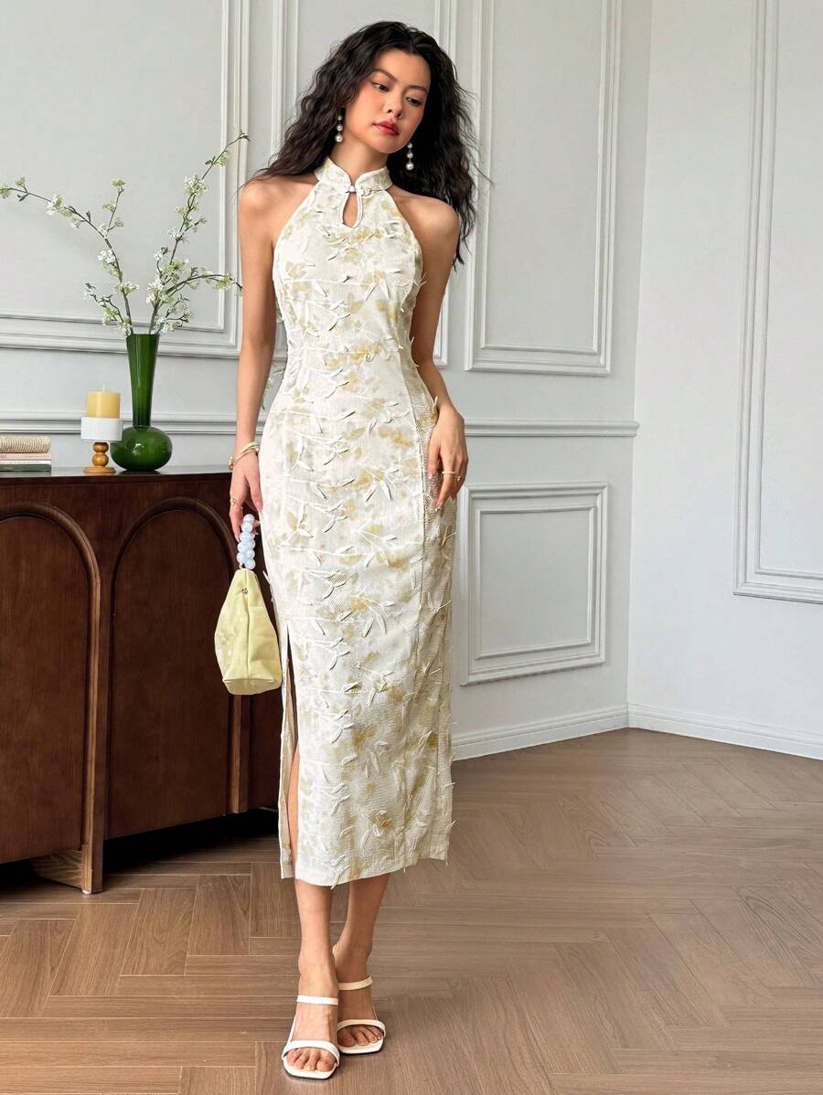 MIU Women's Sleeveless Button Design Branch Print Long Dress, Elegant Women Casual Dress Women Short Dresses Summer Women Birthday Outfit Women S Clothes Women Dresses Elegant Gown