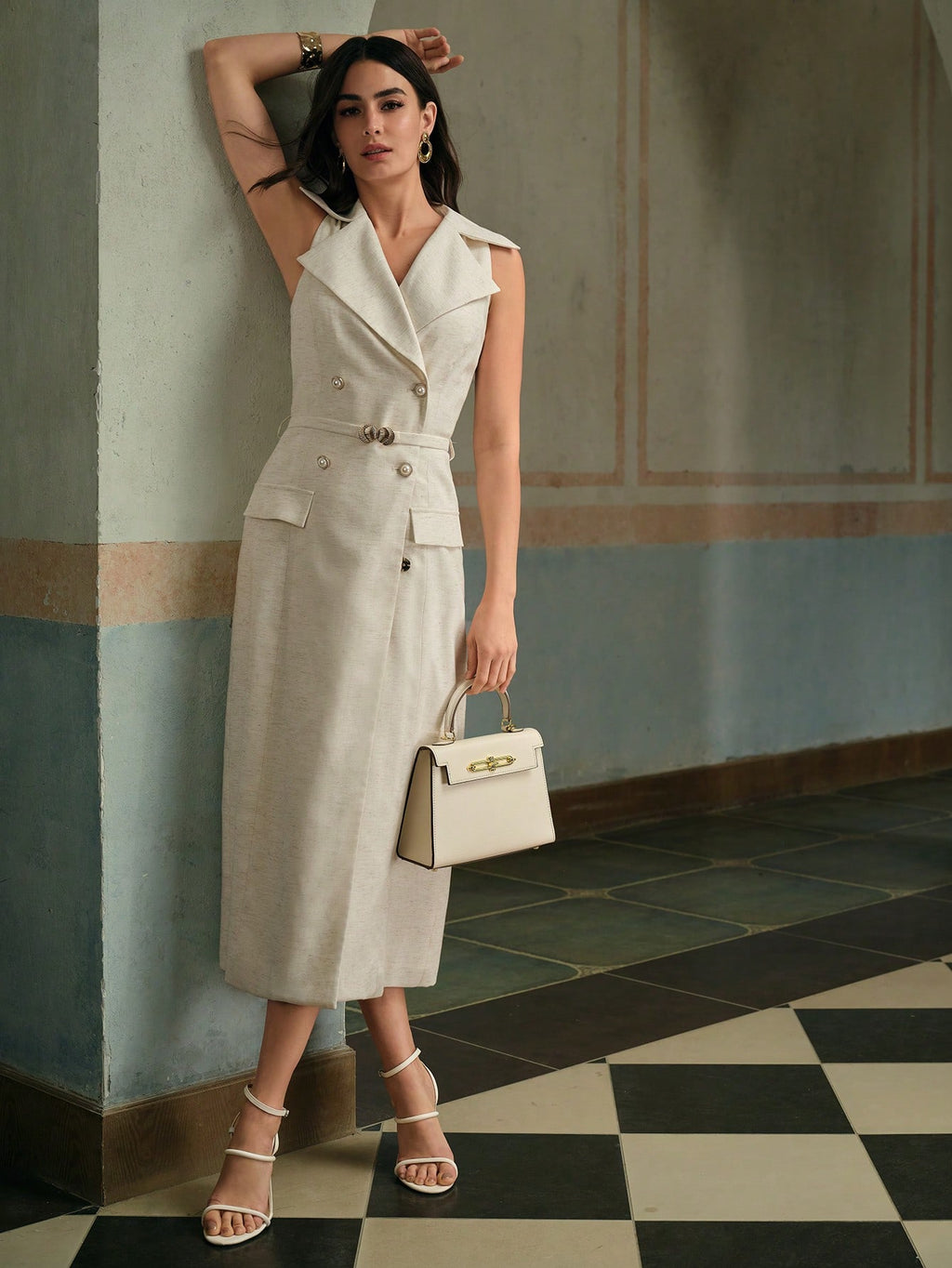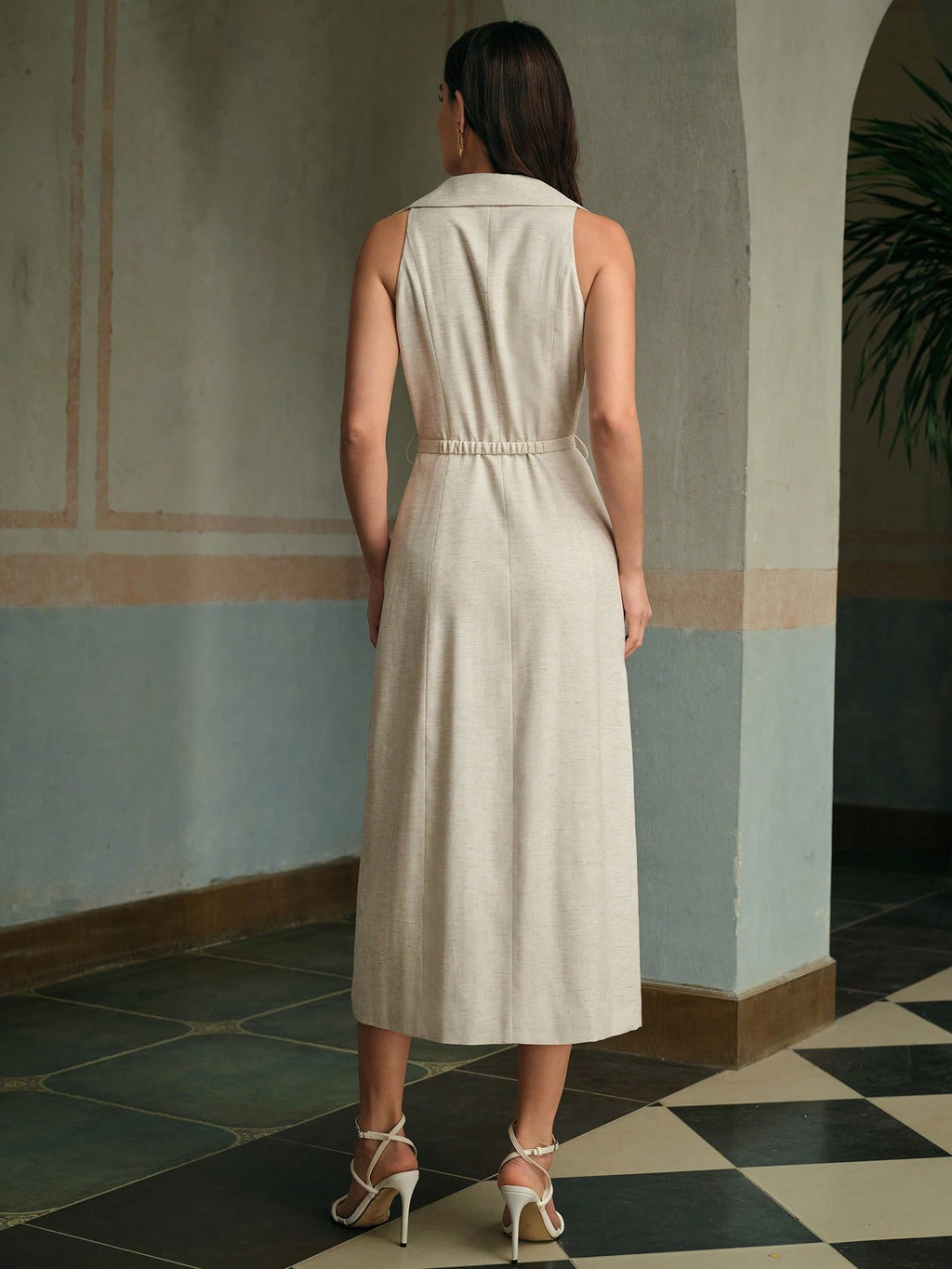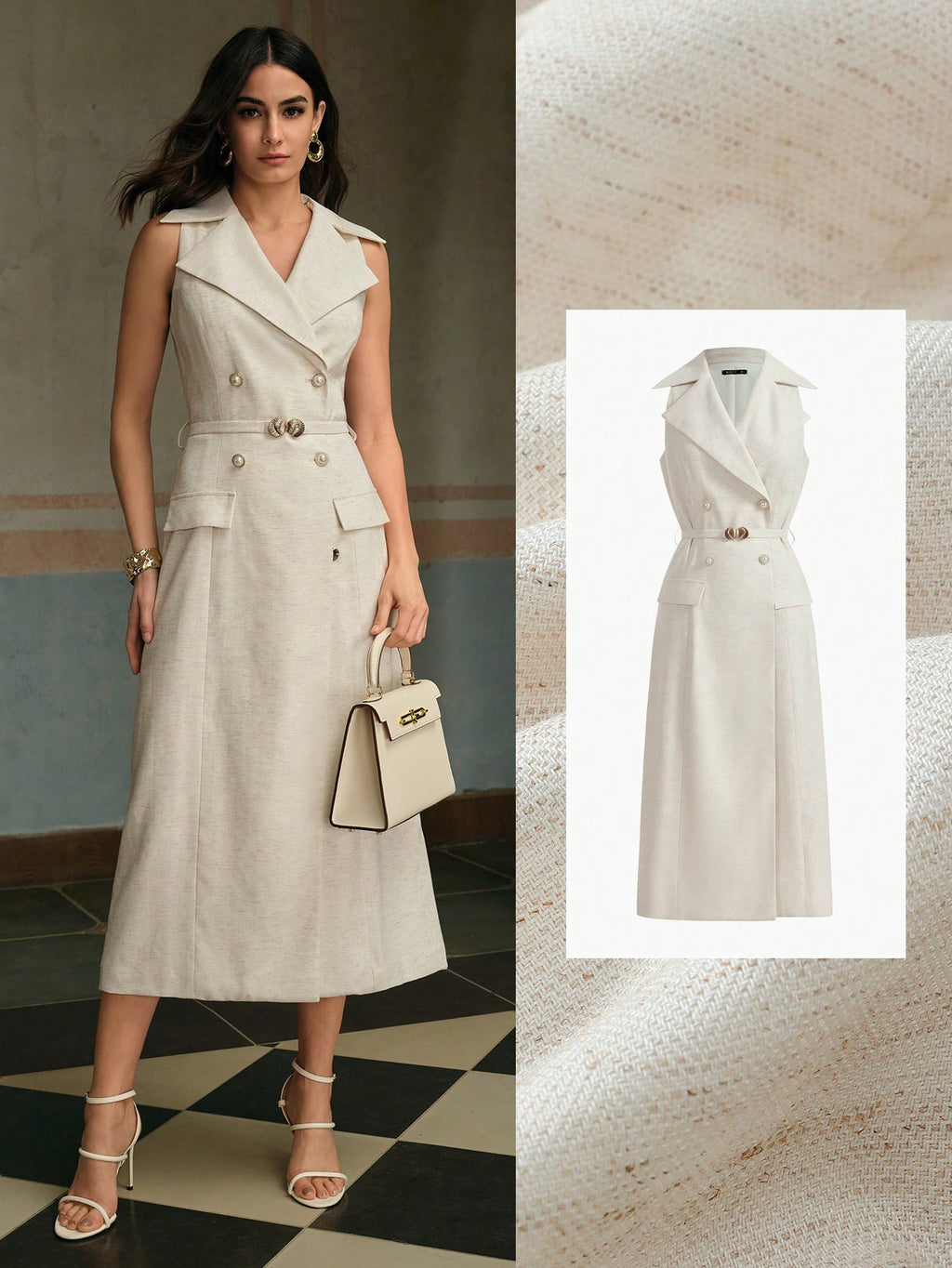 MIU Women's Sleeveless Linen Double-Breasted Elegant Sleeveless Blazer Dress