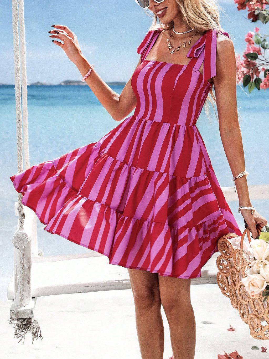 MIU Women's Slim-Fit Printed Tie-Up Mini Dress, Summer Clothes, Valentine's Day, Vacation Outfits Woman, Beach Outfits For Woman, Festival, Romantic, Bohemian, BOHO, Sweet, Rave Outfits Festival, Tropical Vacation Woman Clothes