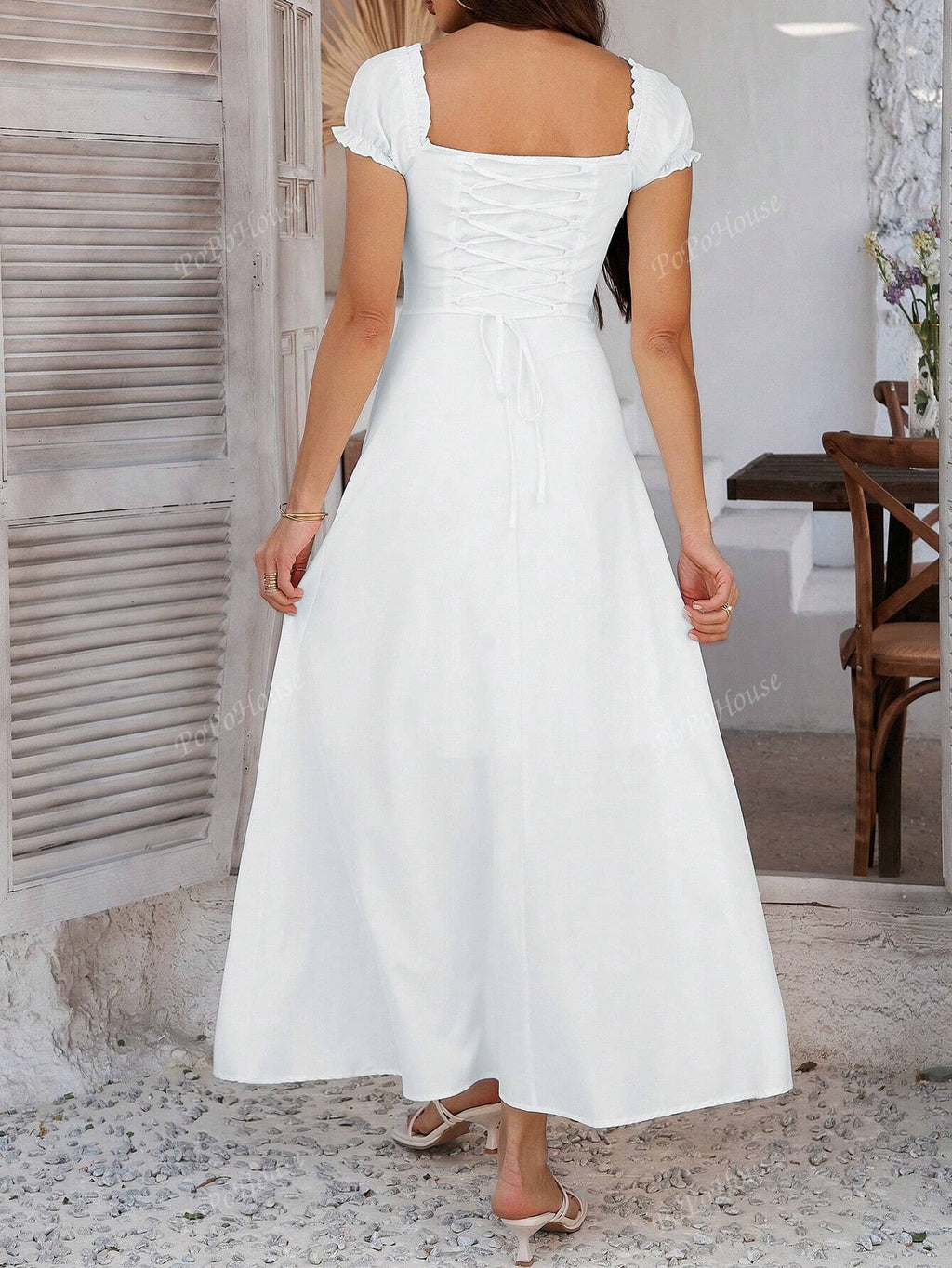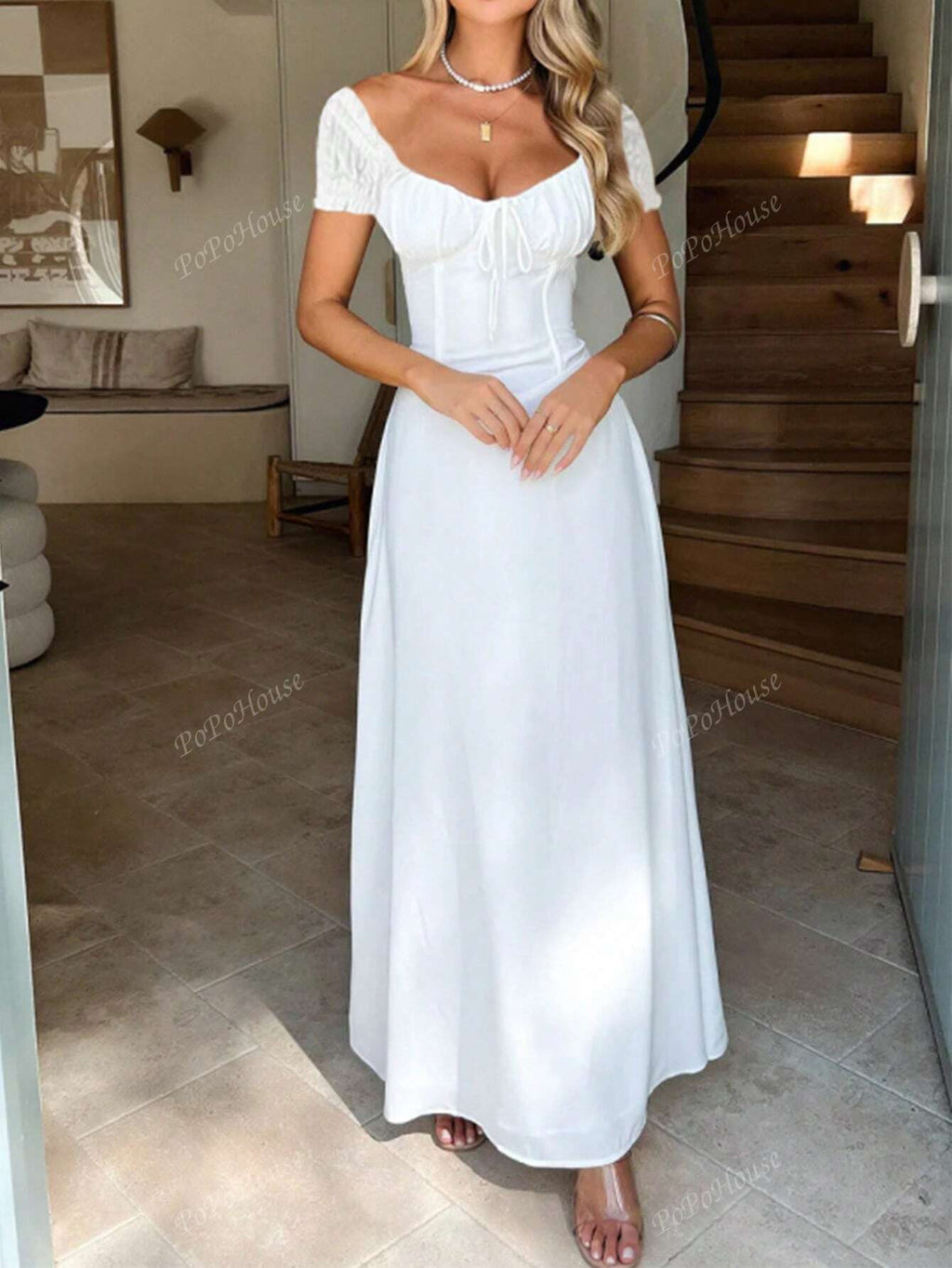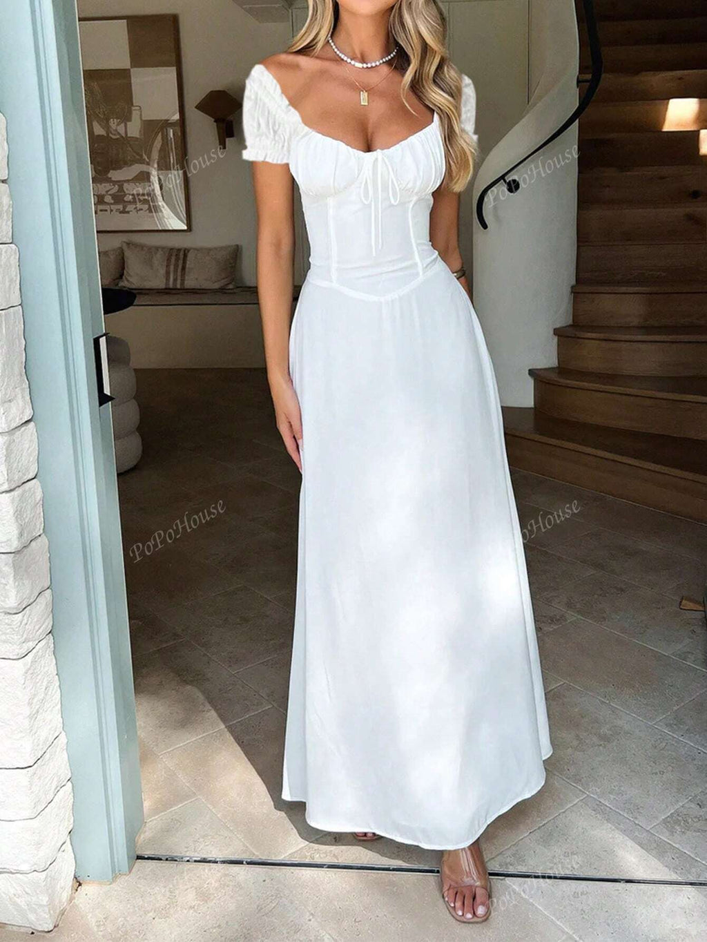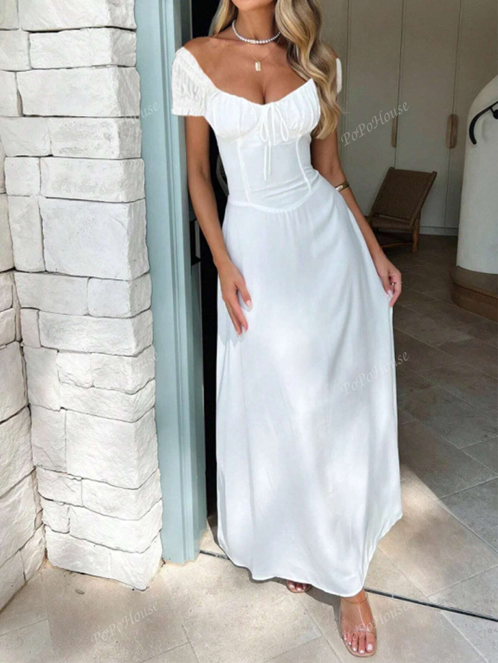 MIU Women's Solid-Color Bohemian Vacation-Style Dress With A Low-Cut Off-The-Shoulder Neckline And Back Tie Detailing.