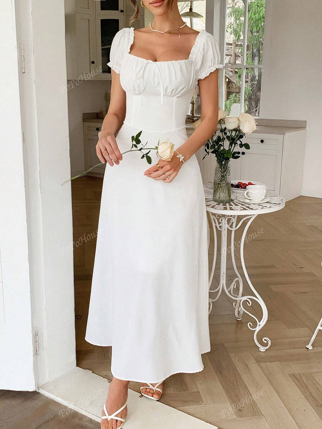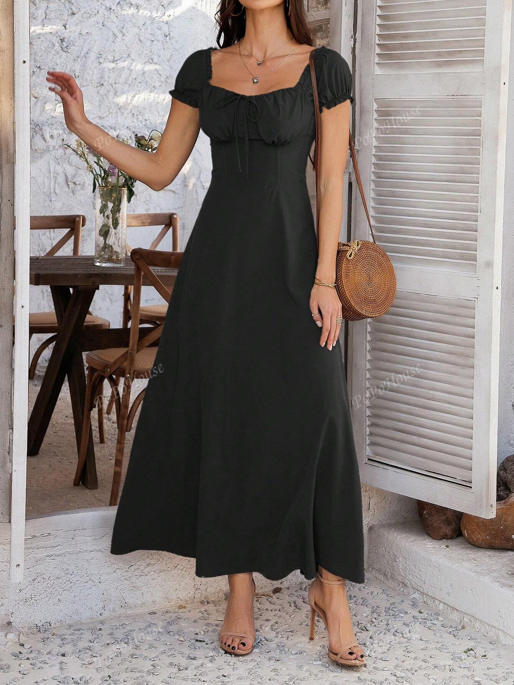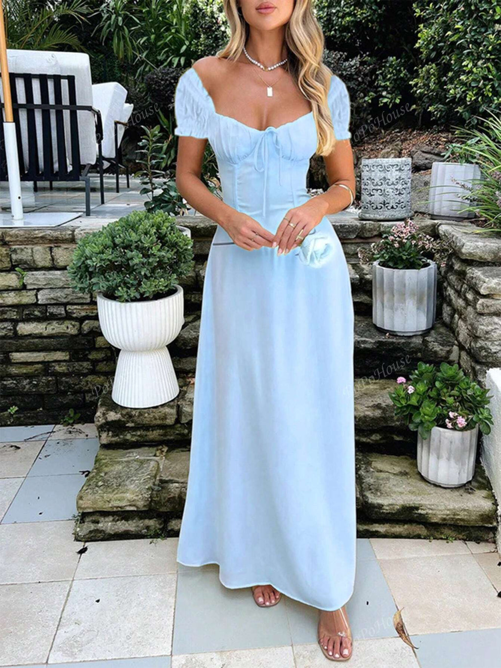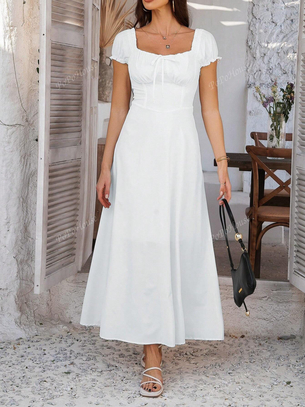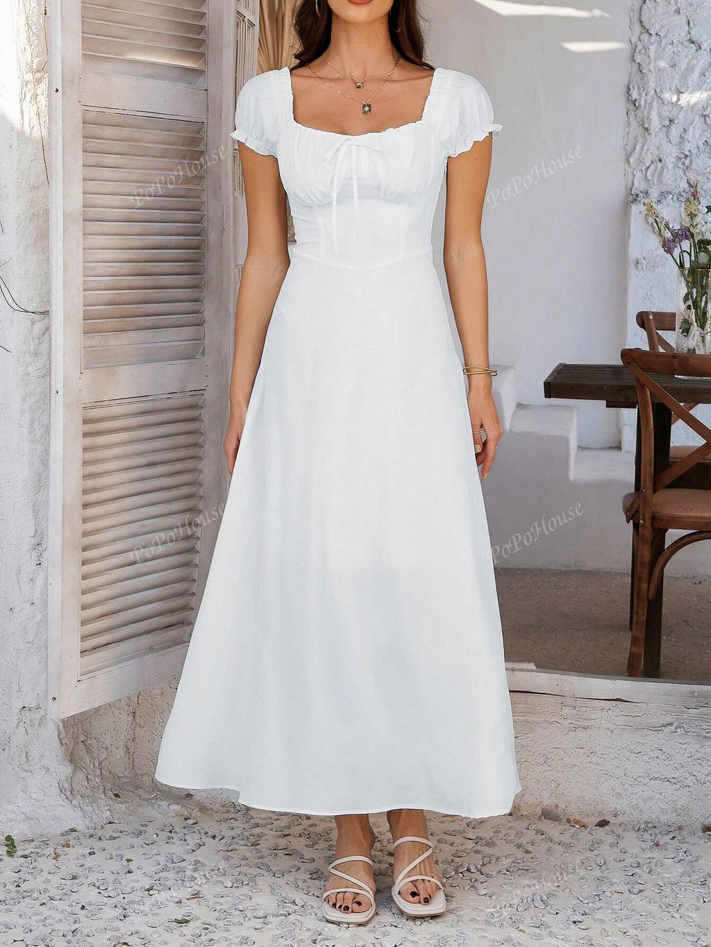 MIU Women's Solid-Color Bohemian Vacation-Style Dress With A Low-Cut Off-The-Shoulder Neckline And Back Tie Detailing.