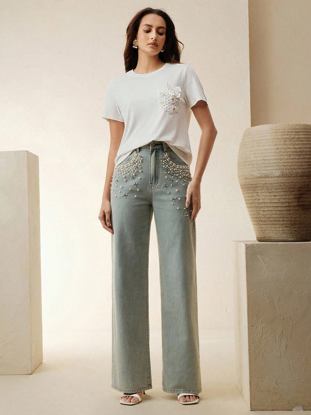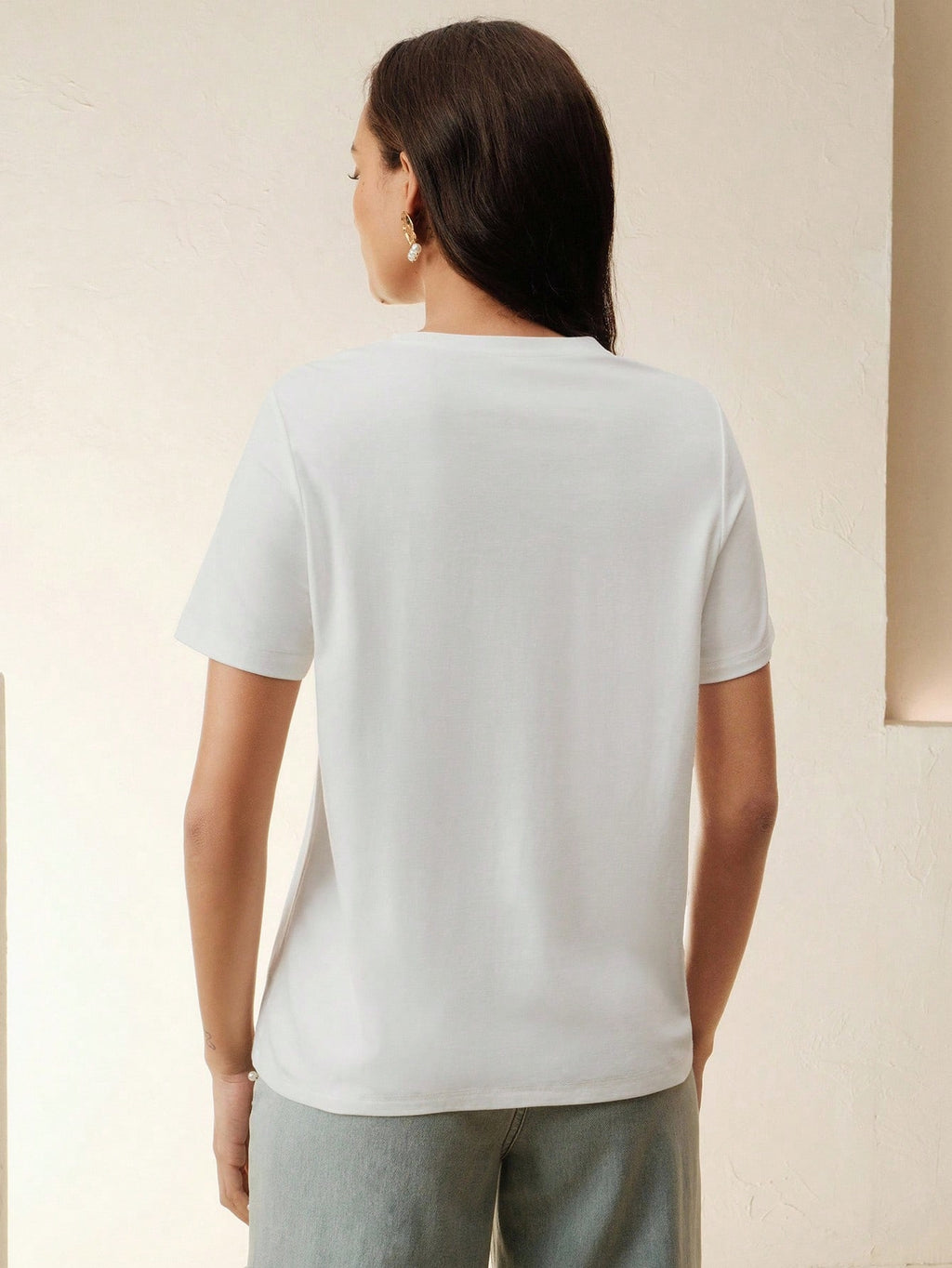 MIU Women's Solid Color Crew Neck Casual Elegant Pocket Flower