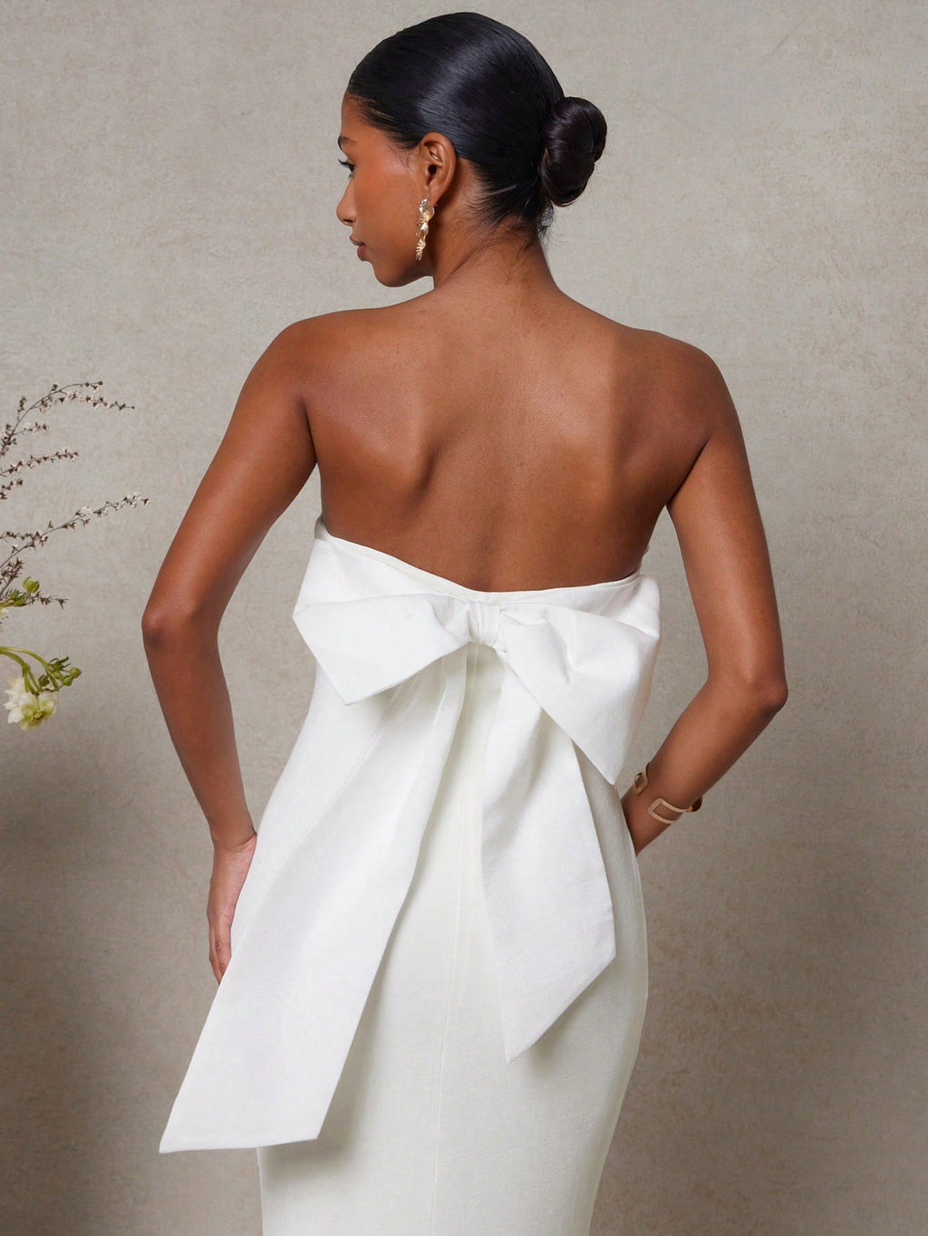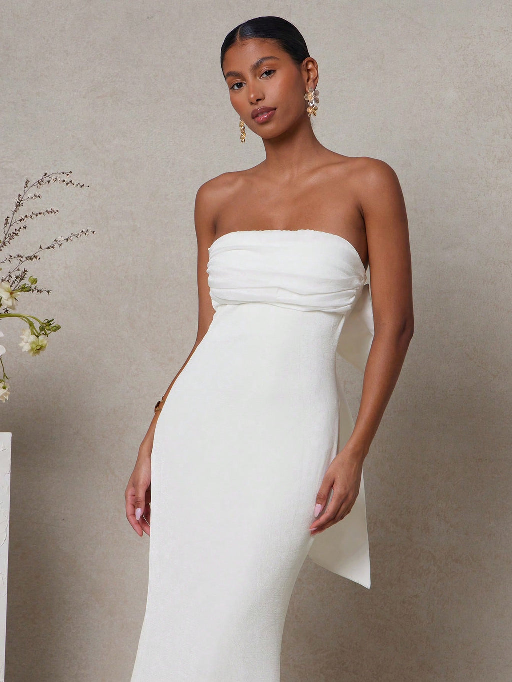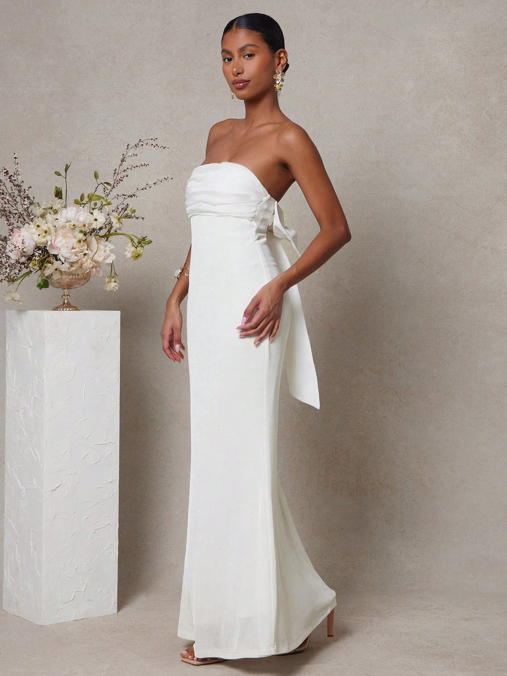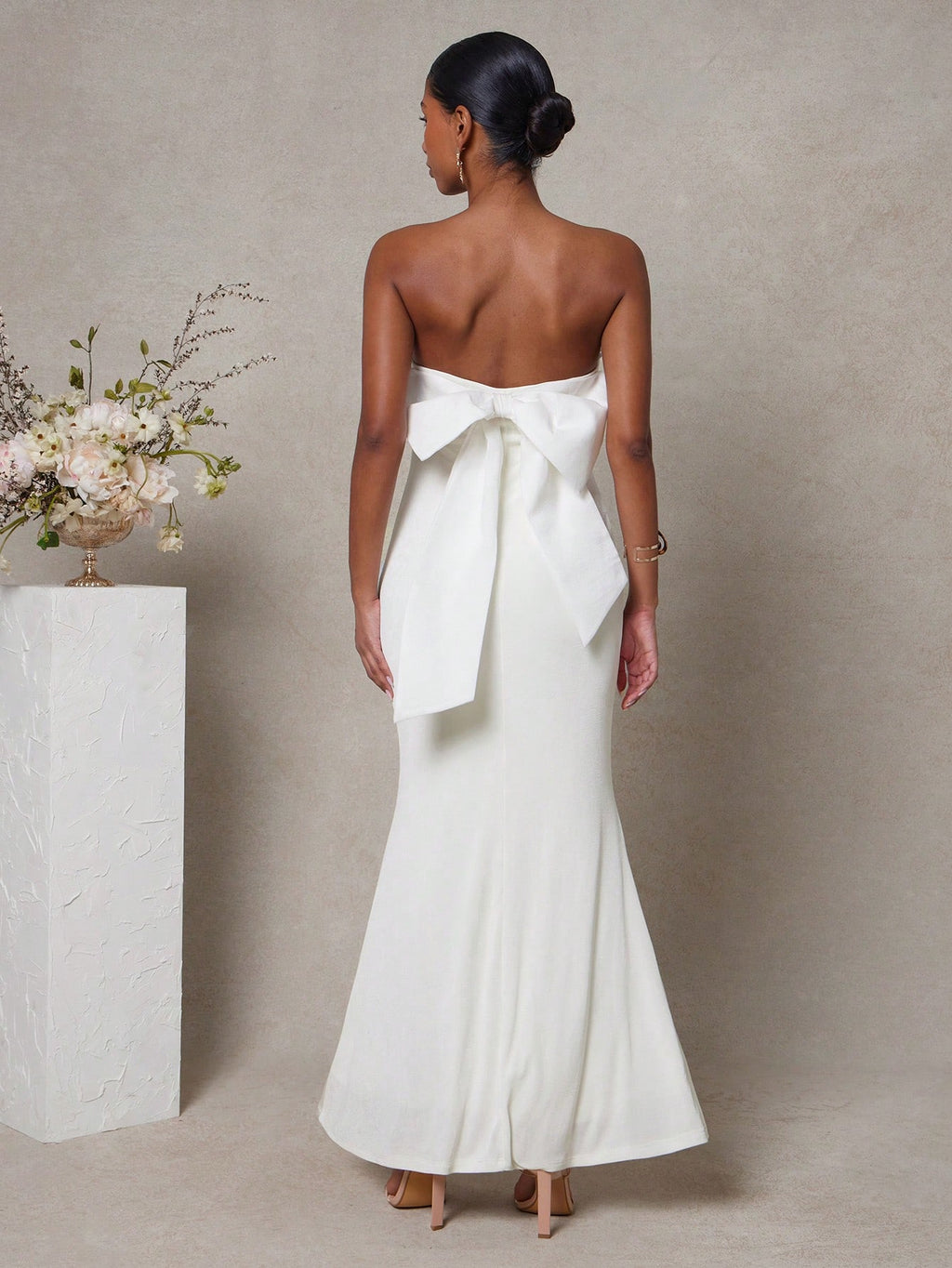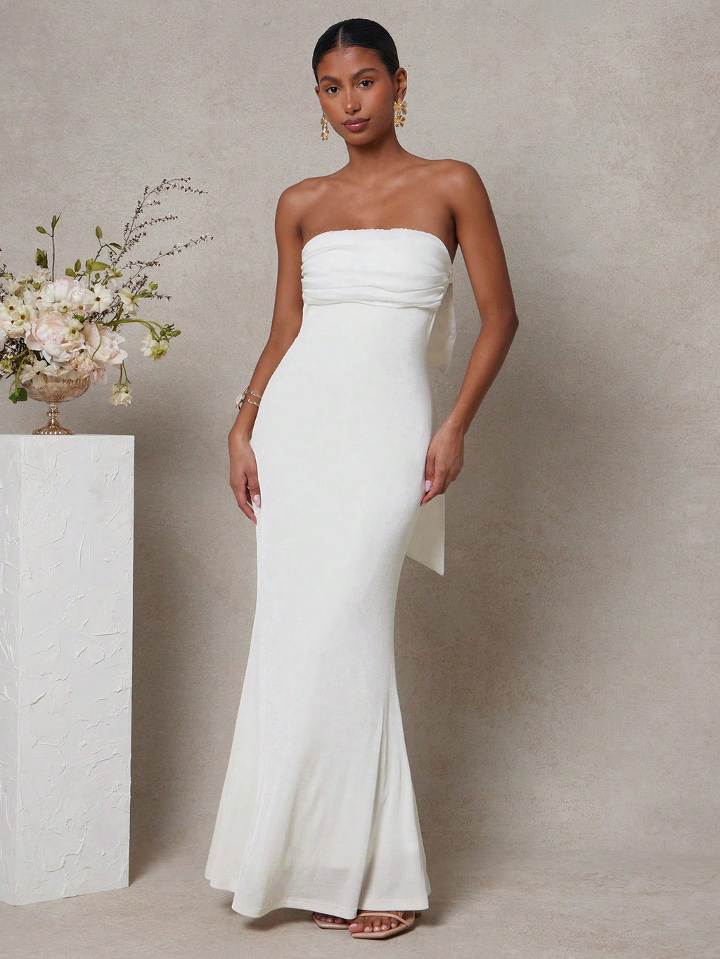 MIU Women's Solid Color Pleated Bowknot Decor Bandeau Fish Tail Long Dress