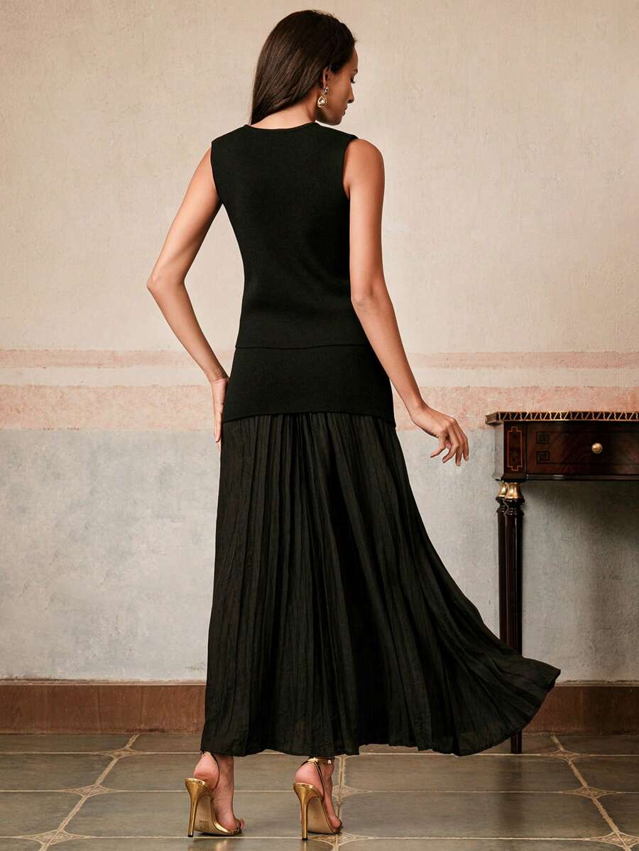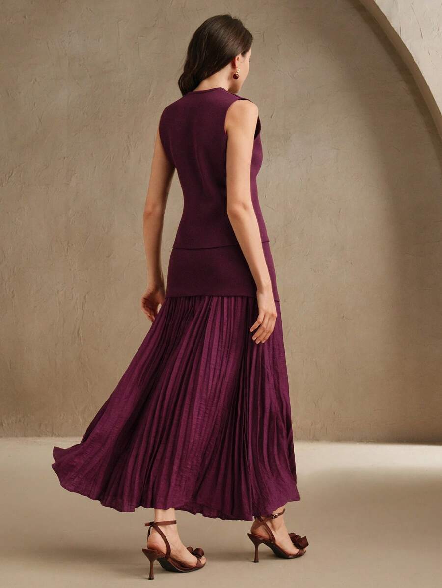 MIU Women's Solid Color Single-Breasted Knitted Vest And Pleated Knitted Mini Skirt Set