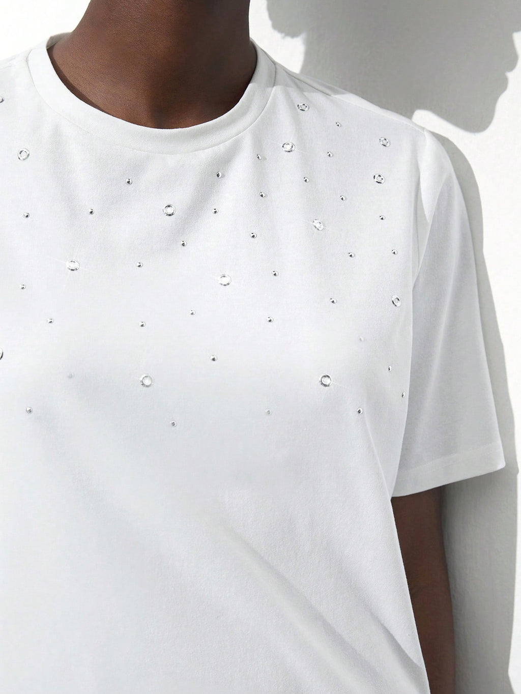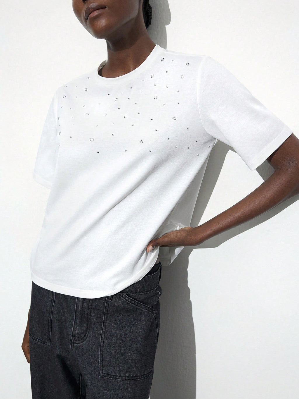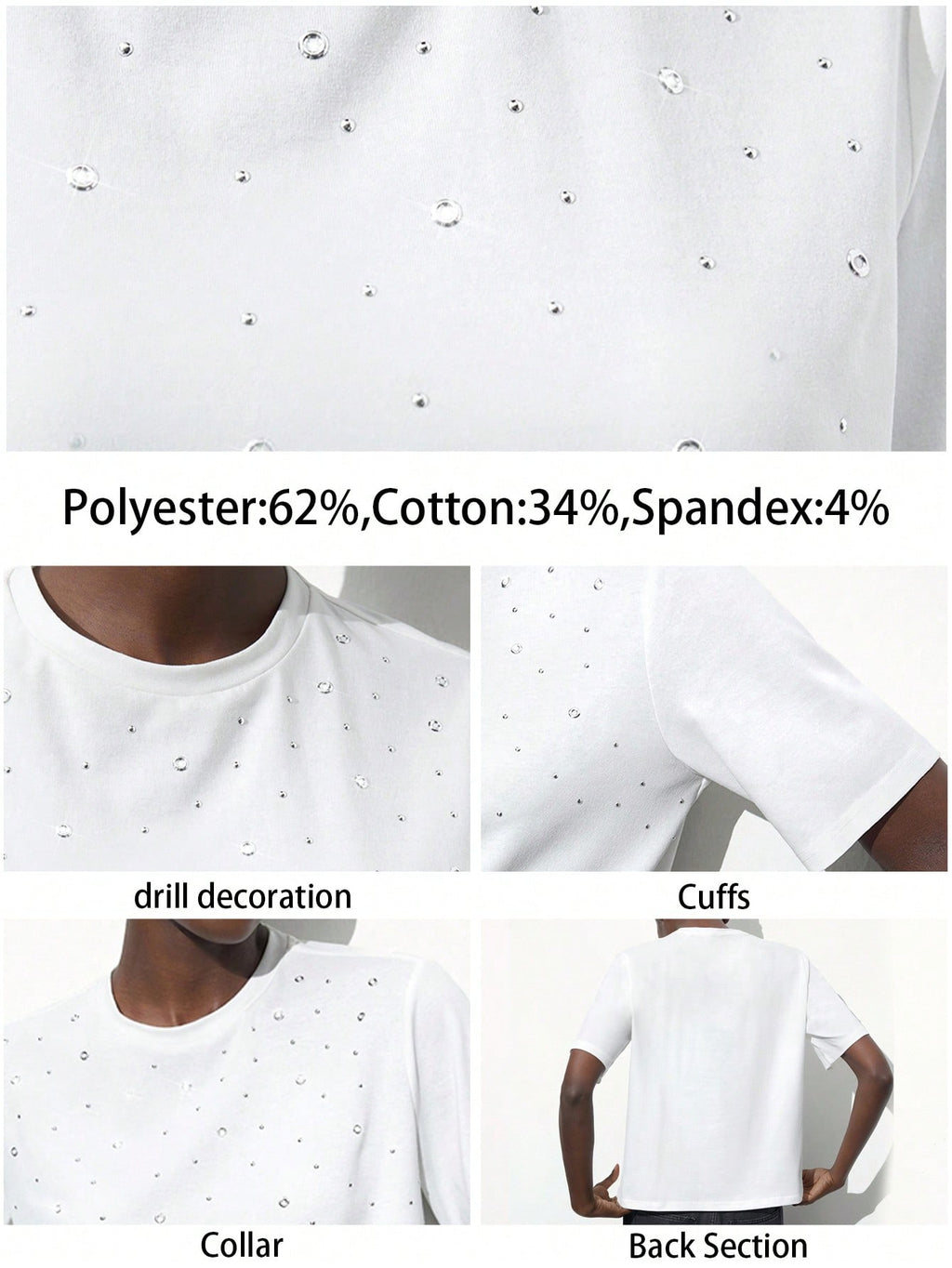 MIU Women's Spring Rhinestone Decor Design Short Sleeve Cropped White T-Shirt,Festival