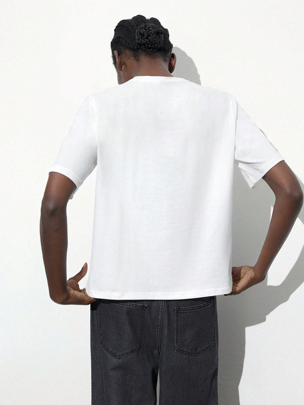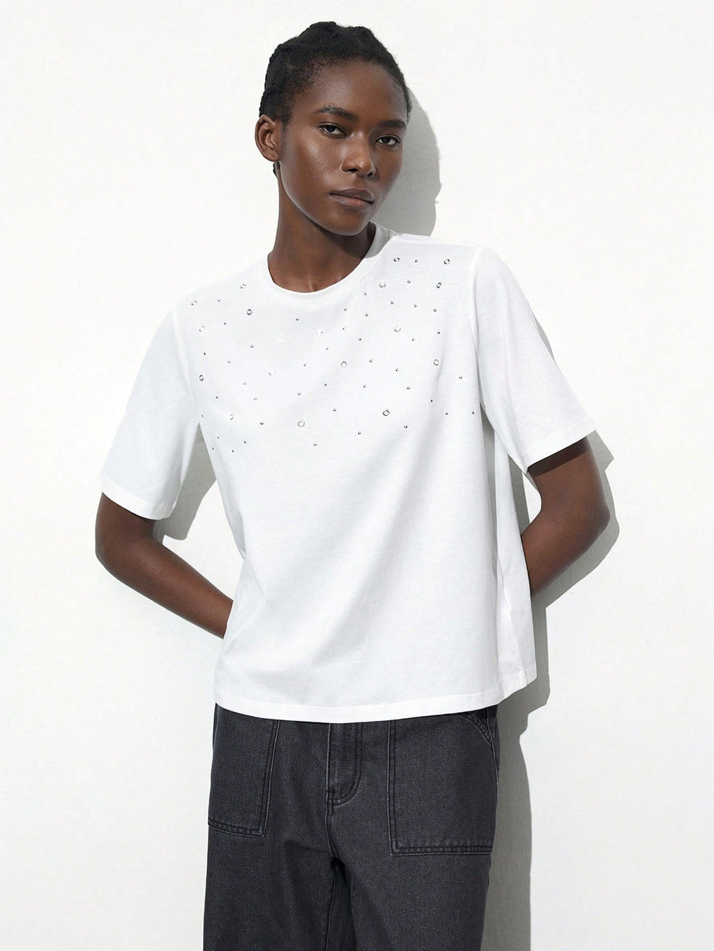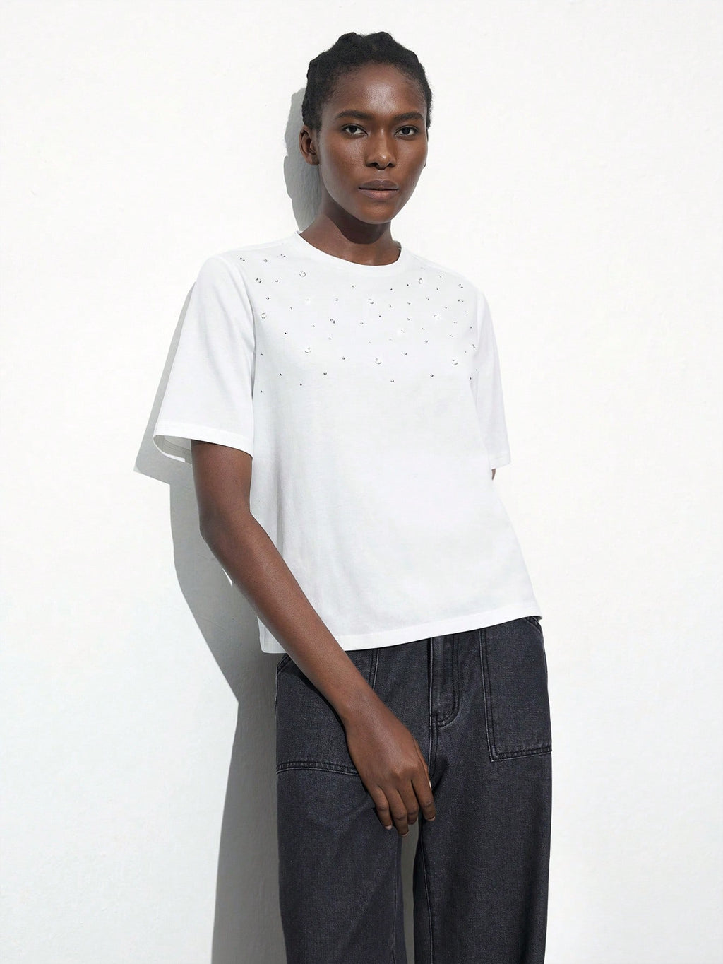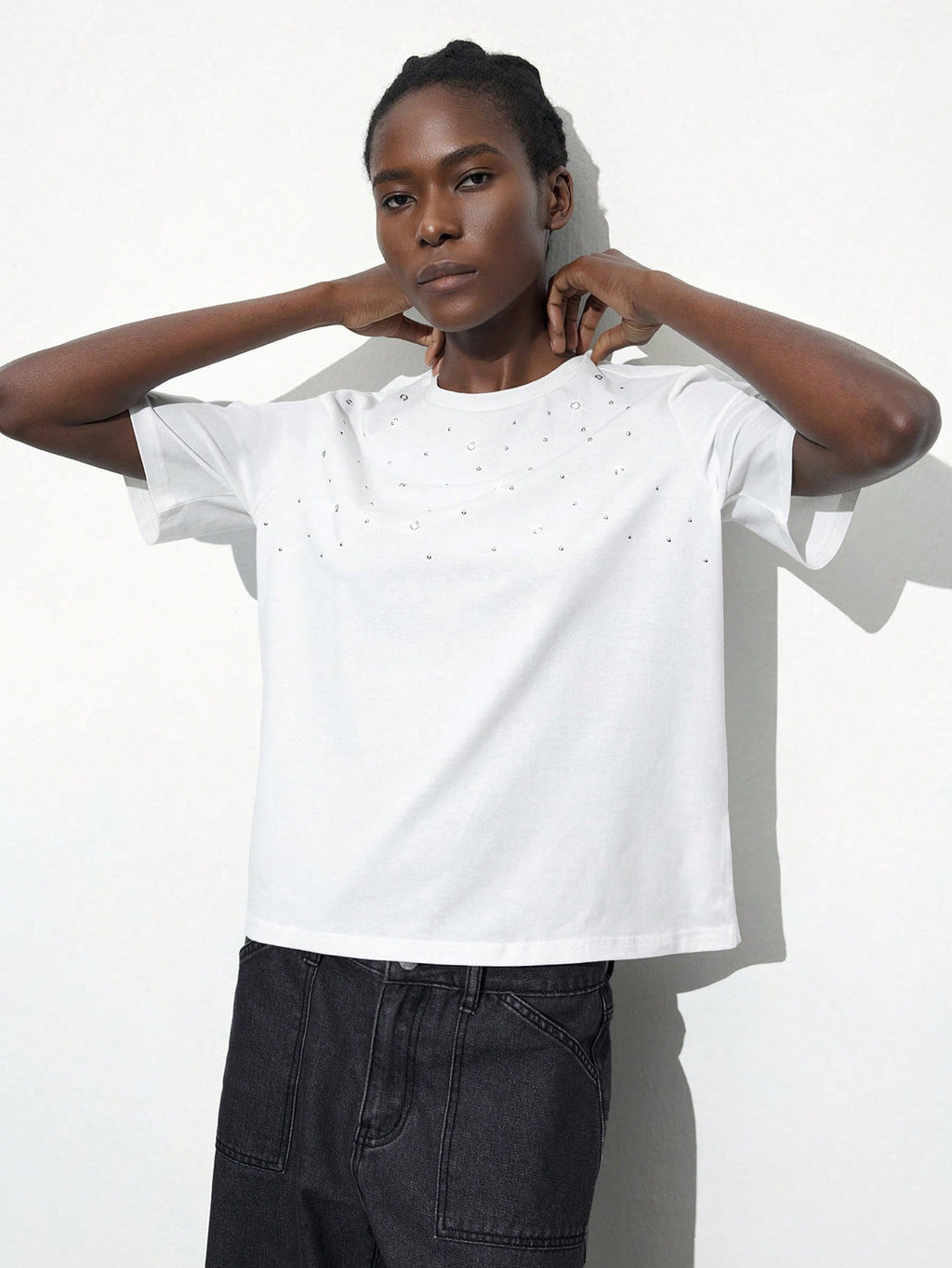 MIU Women's Spring Rhinestone Decor Design Short Sleeve Cropped White T-Shirt,Festival