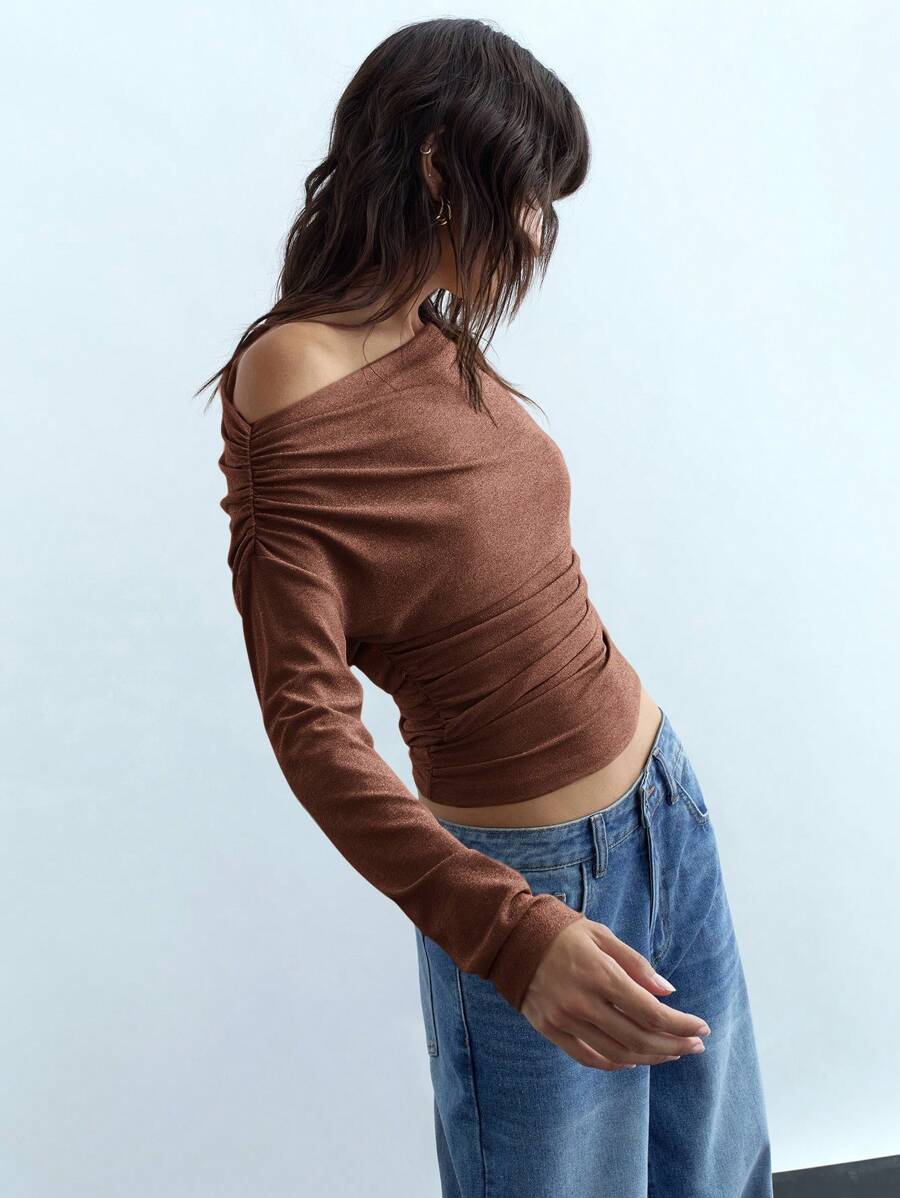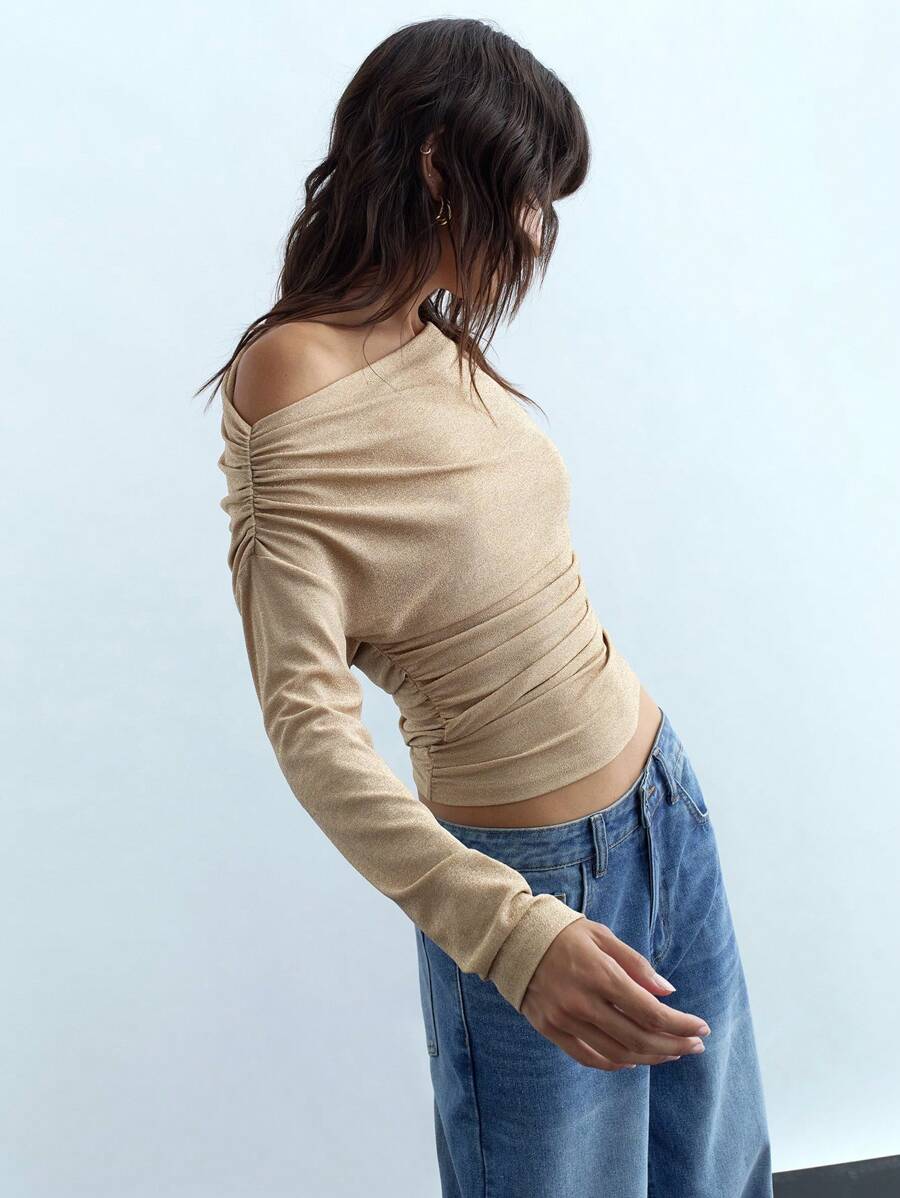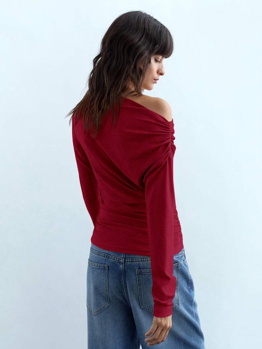 MIU Women's Spring Summer Solid Color Asymmetric Neck Long Sleeve Tee