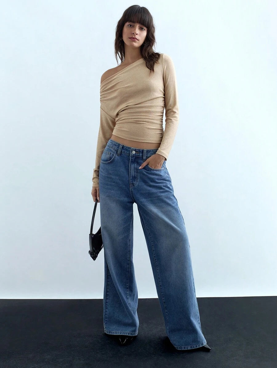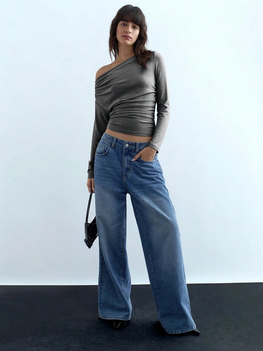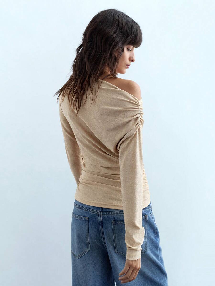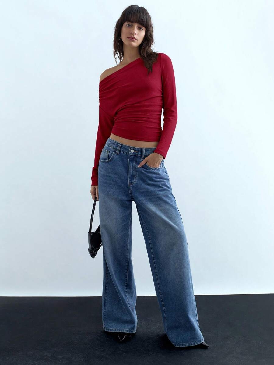 MIU Women's Spring Summer Solid Color Asymmetric Neck Long Sleeve Tee