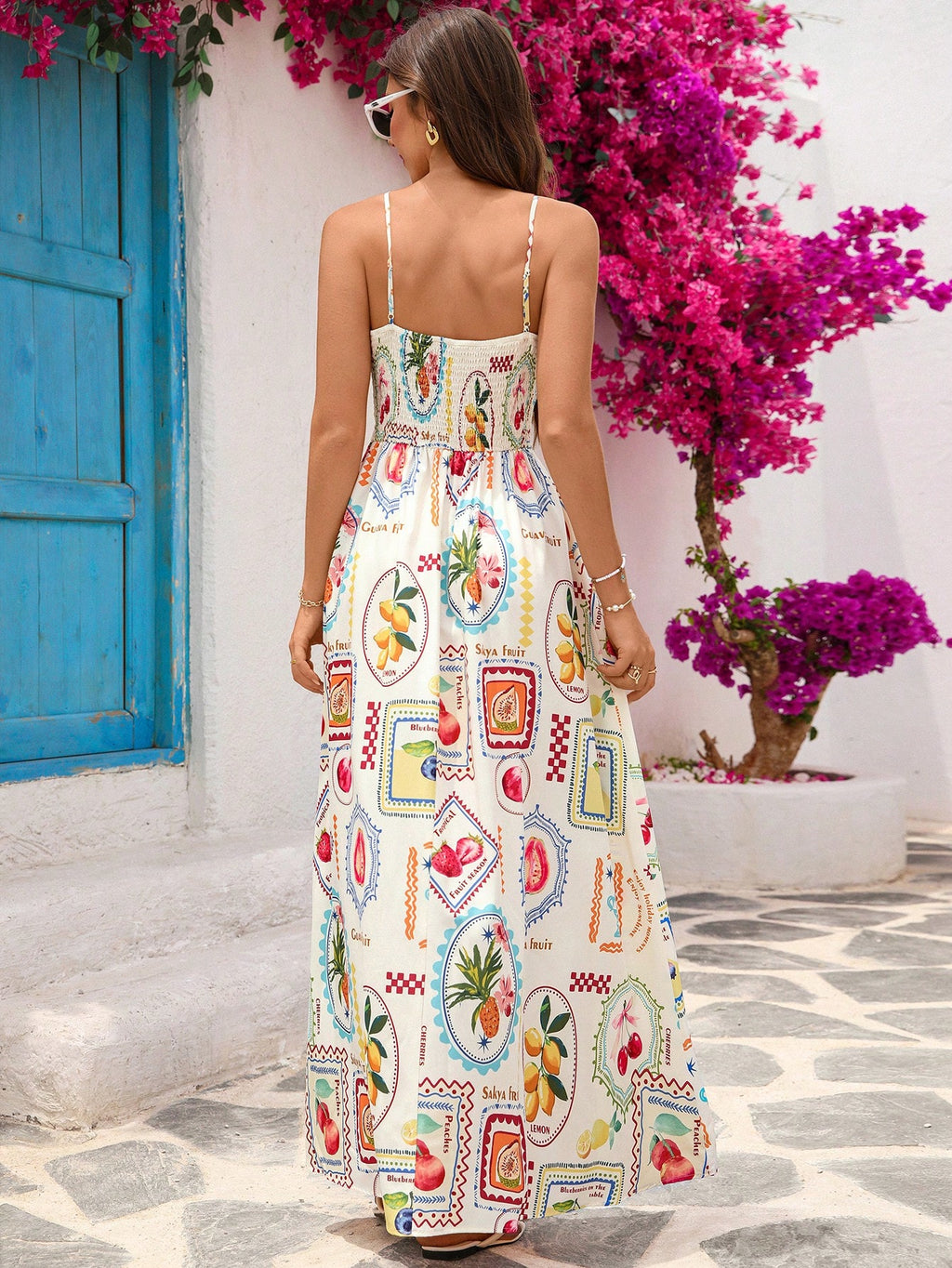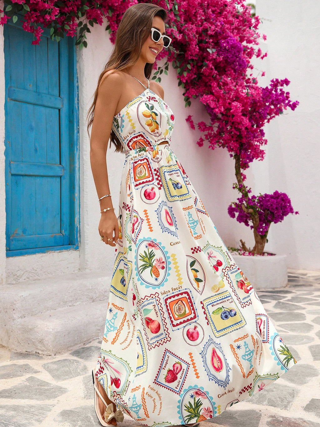 MIU Women's Summer Holiday Casual Colorful Fruit Print Halter Long Dress,Women Summer Clothing,Vacation Style,Bohemian Clothes, Woman S Summer Clothes .Women Dresses Birthday,Beach Dresses For Women