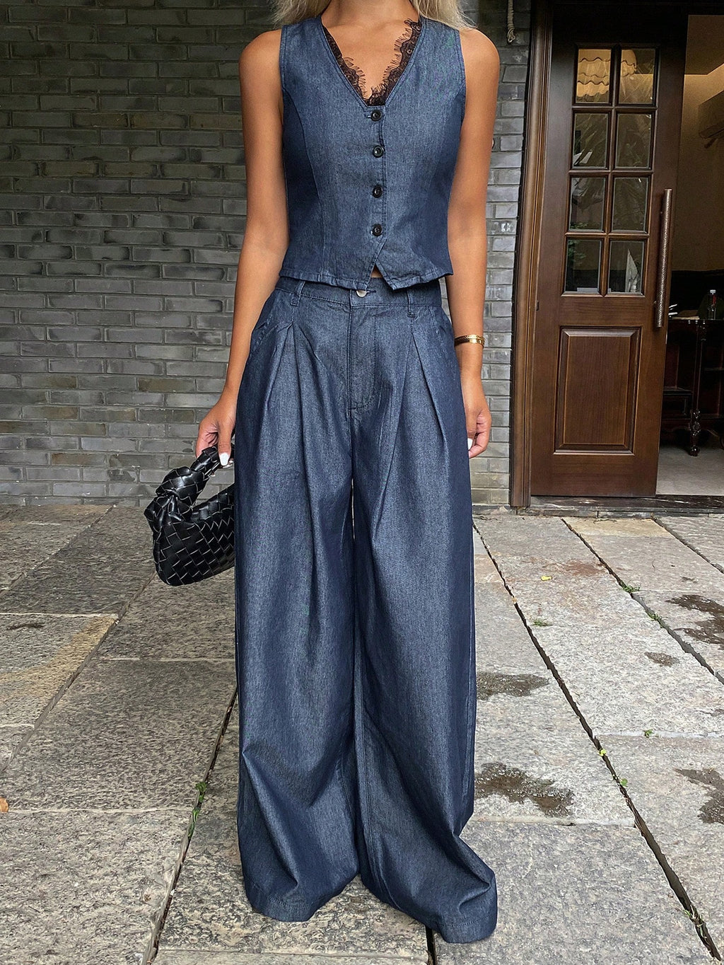 MIU Women's Summer Lace Patchwork Chic V-Neck Sleeveless Vest And Wide Leg Pants 2 Pieces Casual Denim Set, With Tie Accessory