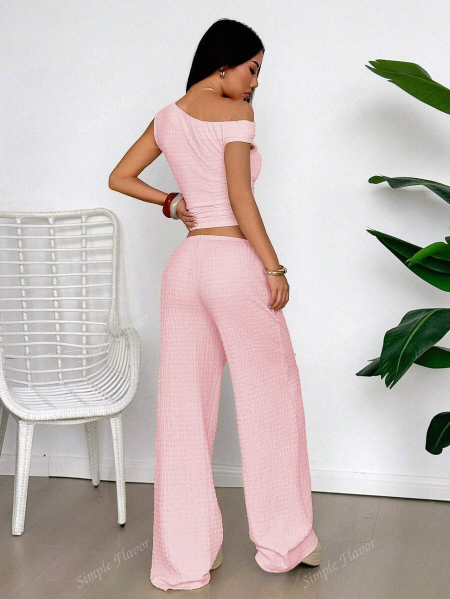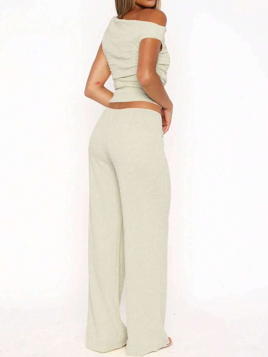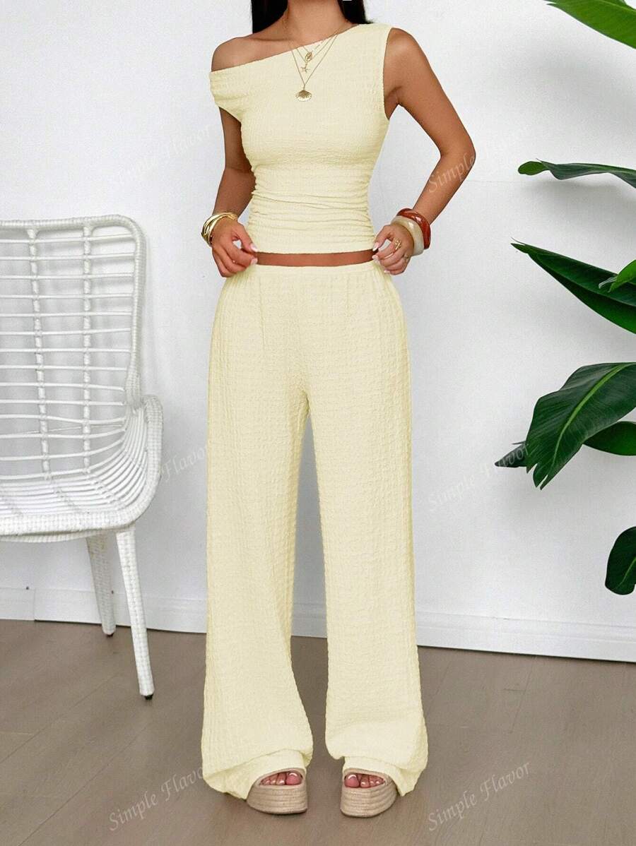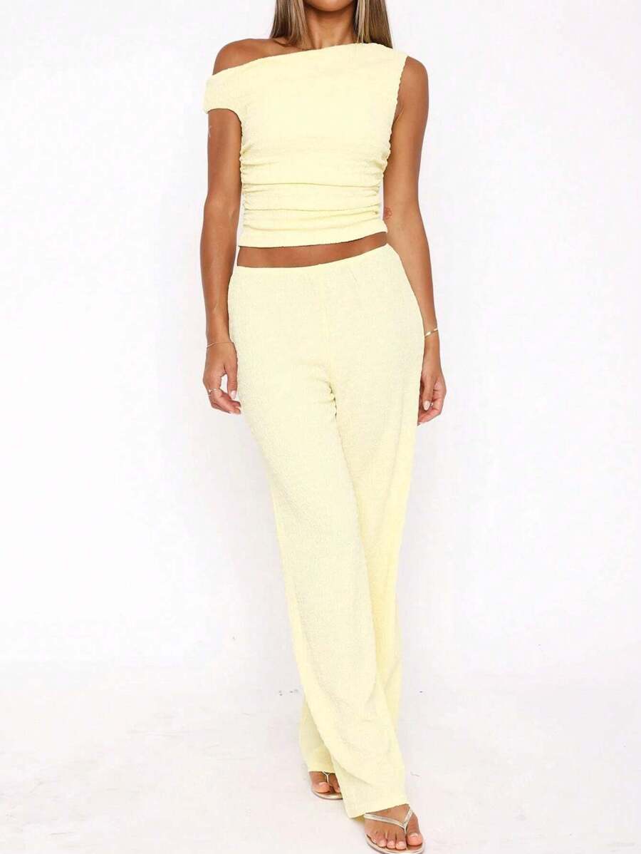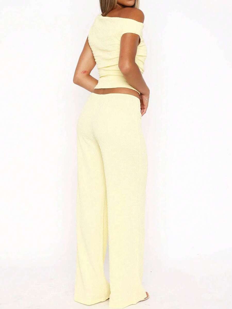 MIU Women's Two Pieces Summer Y2K Sexy Elegant And Casual Butter Yellow Knitted Texture Off-The-Shoulder T-Shirt Top And Loose Straight Wide-Leg Pants Set