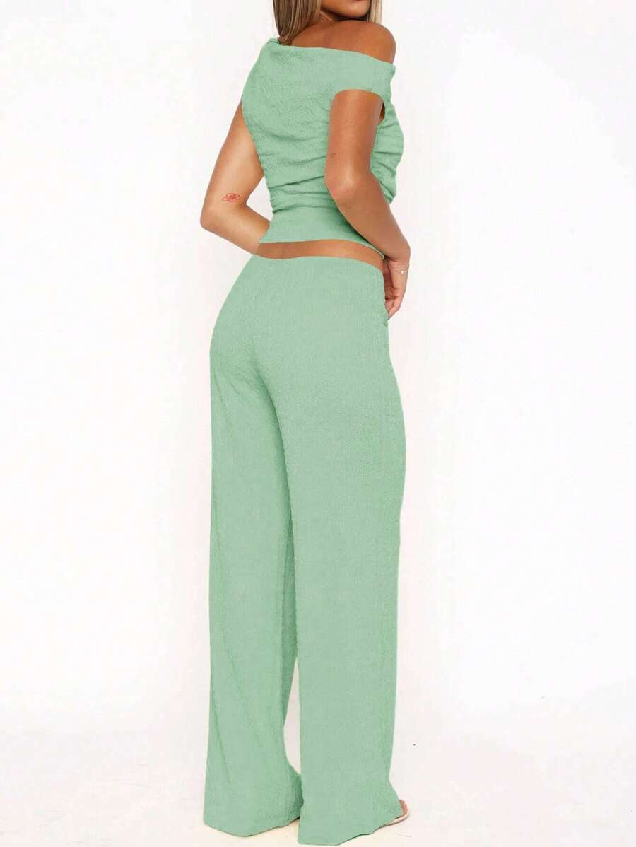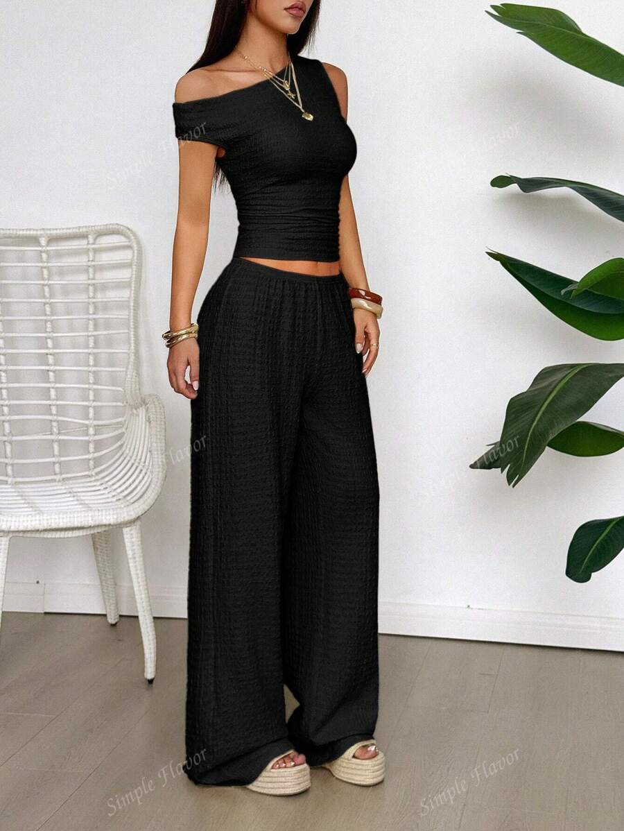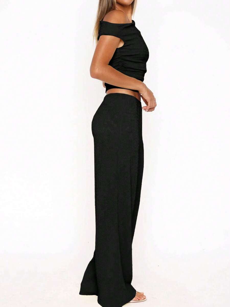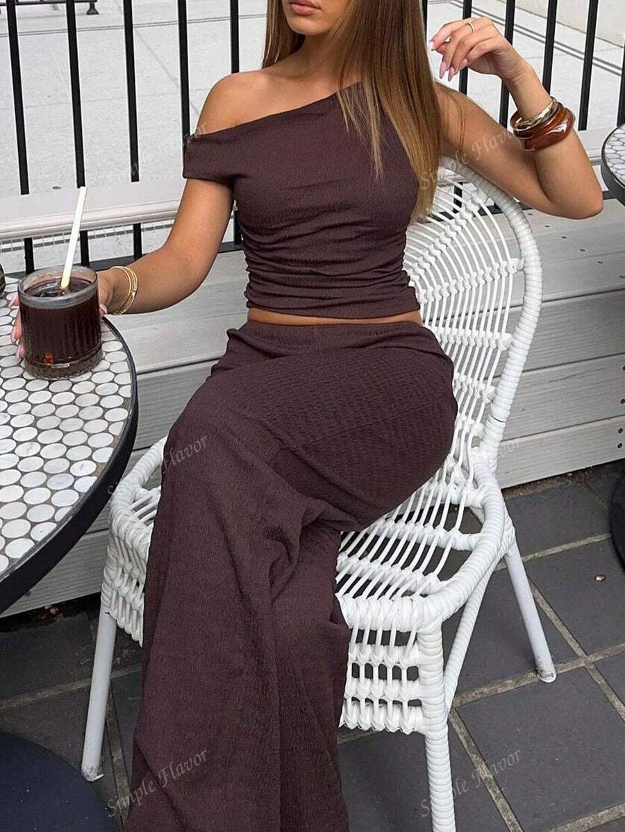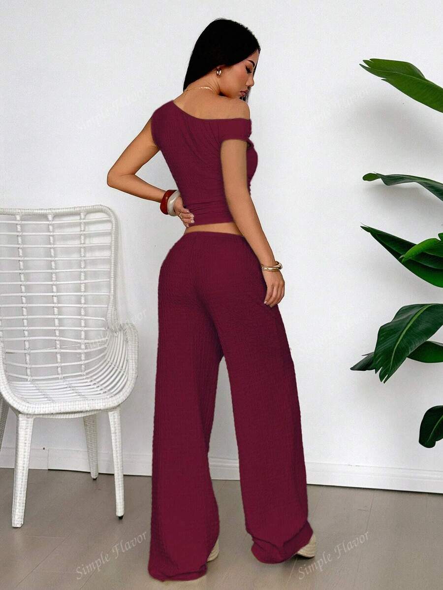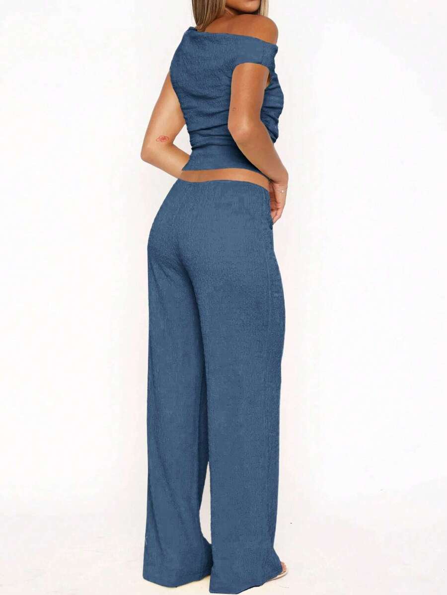 MIU Women's Two Pieces Summer Y2K Sexy Elegant And Casual Butter Yellow Knitted Texture Off-The-Shoulder T-Shirt Top And Loose Straight Wide-Leg Pants Set