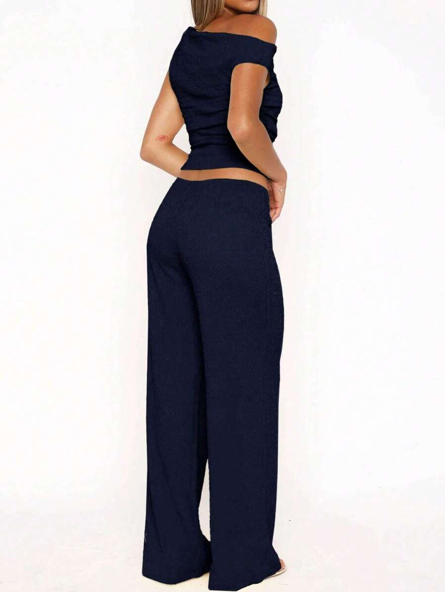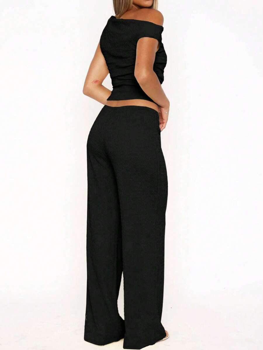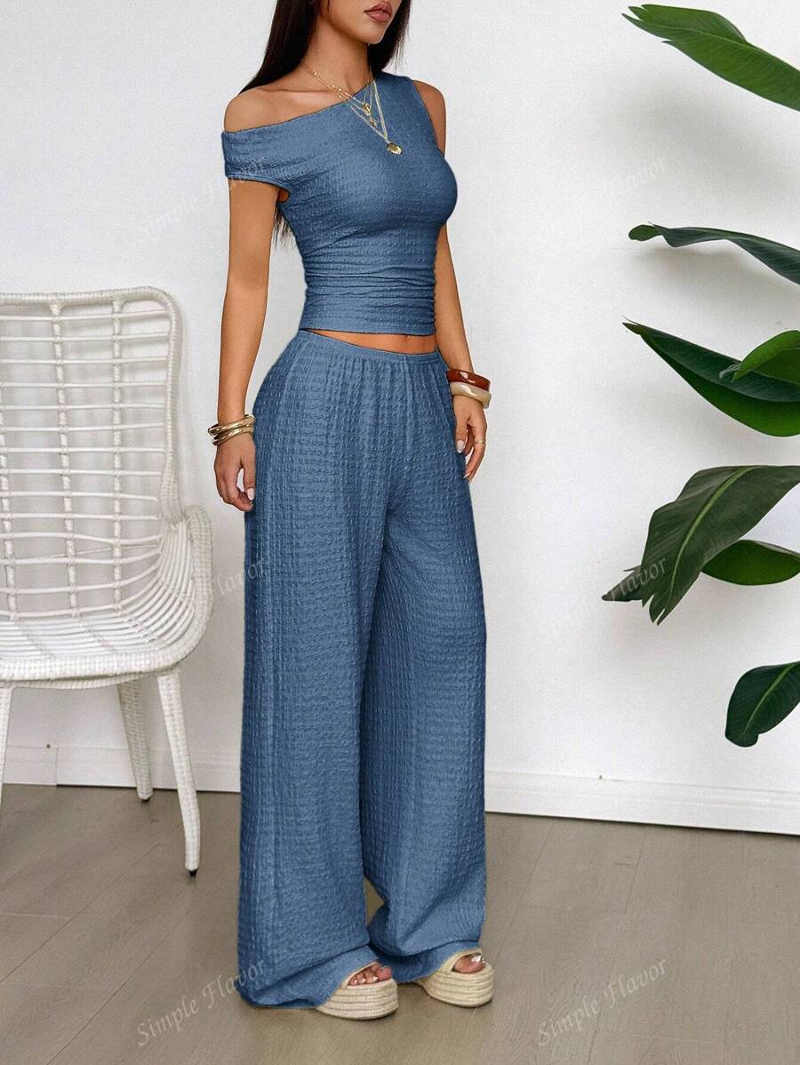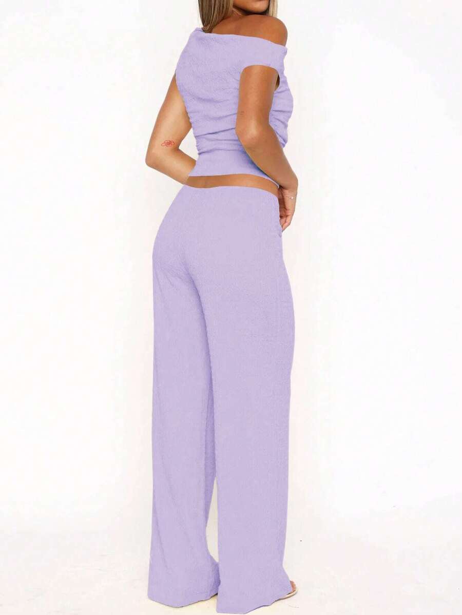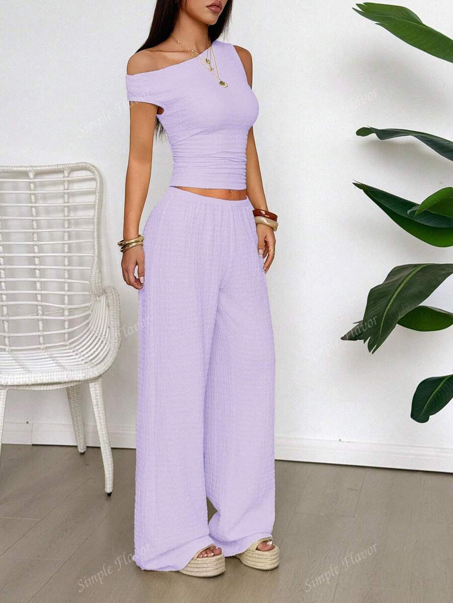 MIU Women's Two Pieces Summer Y2K Sexy Elegant And Casual Butter Yellow Knitted Texture Off-The-Shoulder T-Shirt Top And Loose Straight Wide-Leg Pants Set