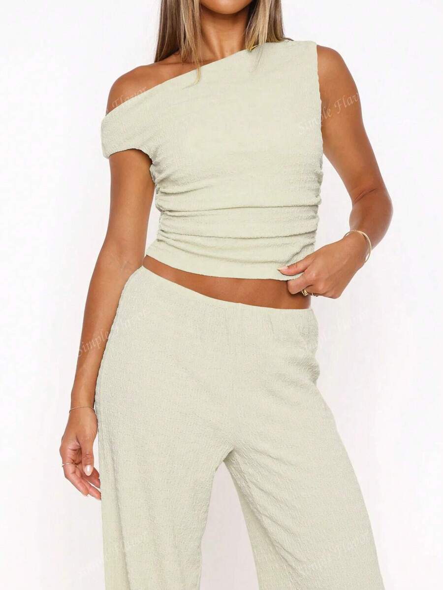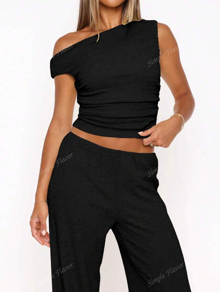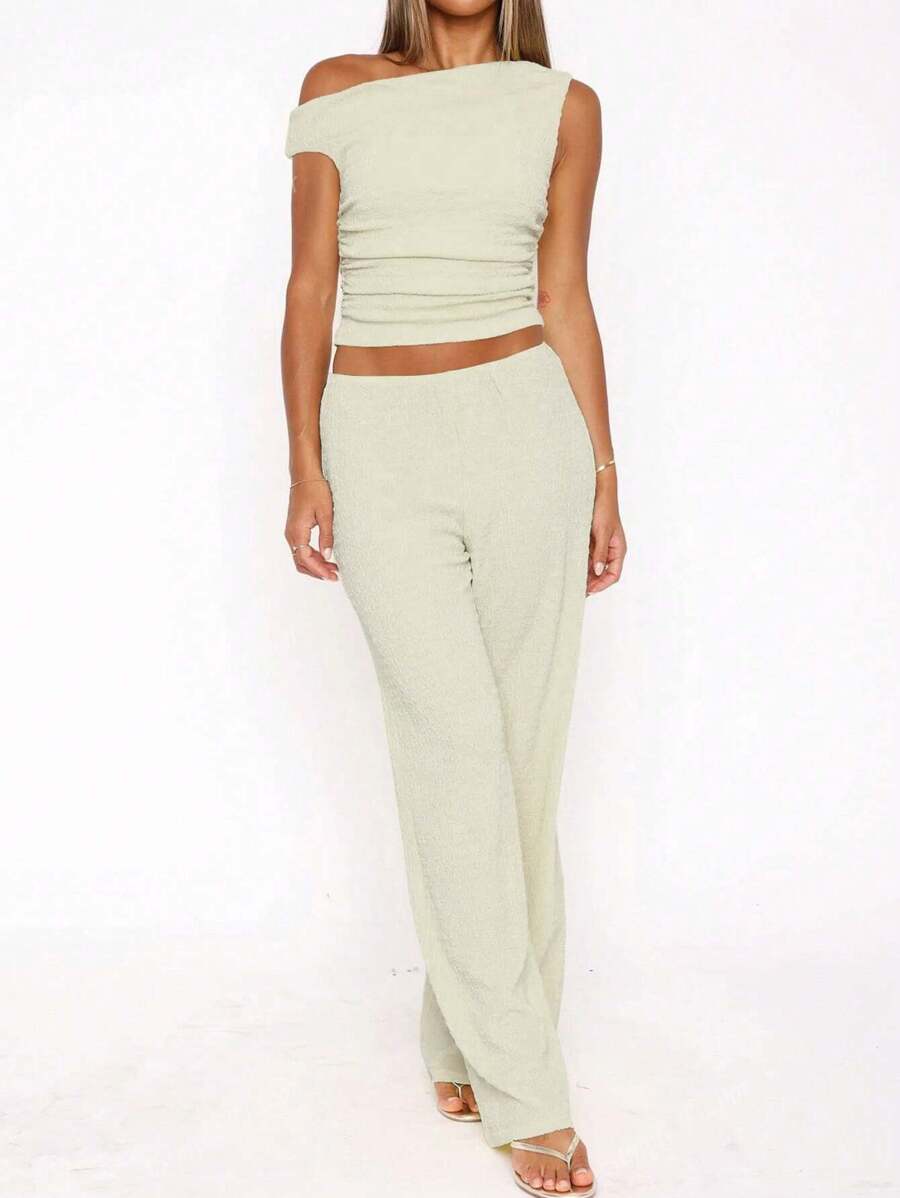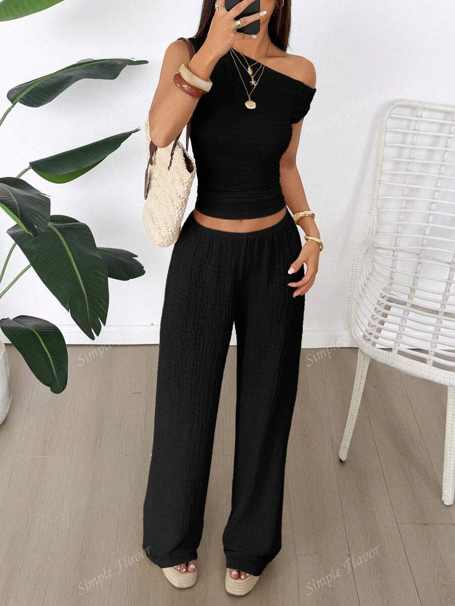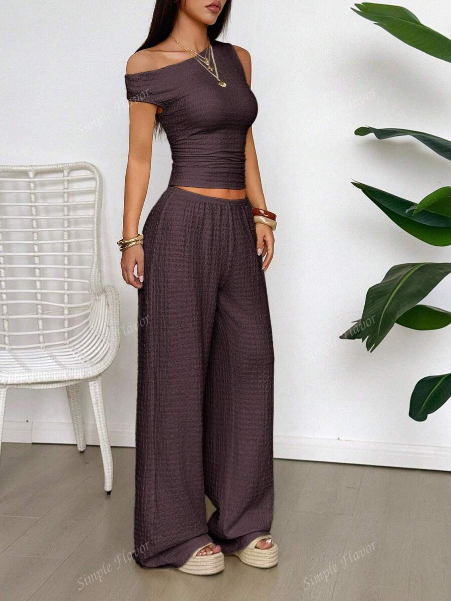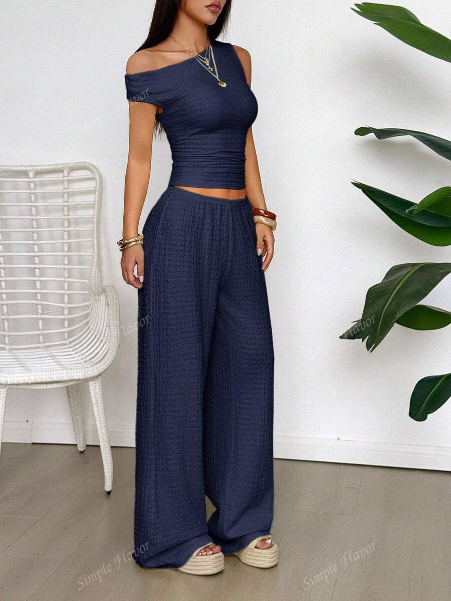 MIU Women's Two Pieces Summer Y2K Sexy Elegant And Casual Butter Yellow Knitted Texture Off-The-Shoulder T-Shirt Top And Loose Straight Wide-Leg Pants Set