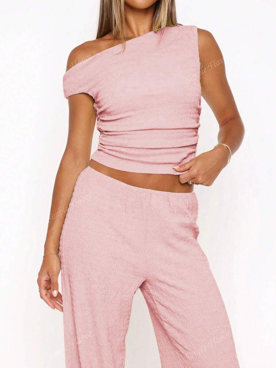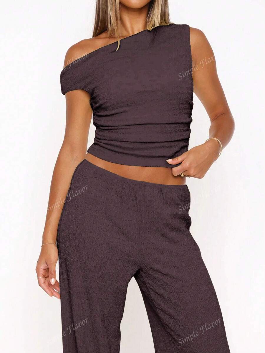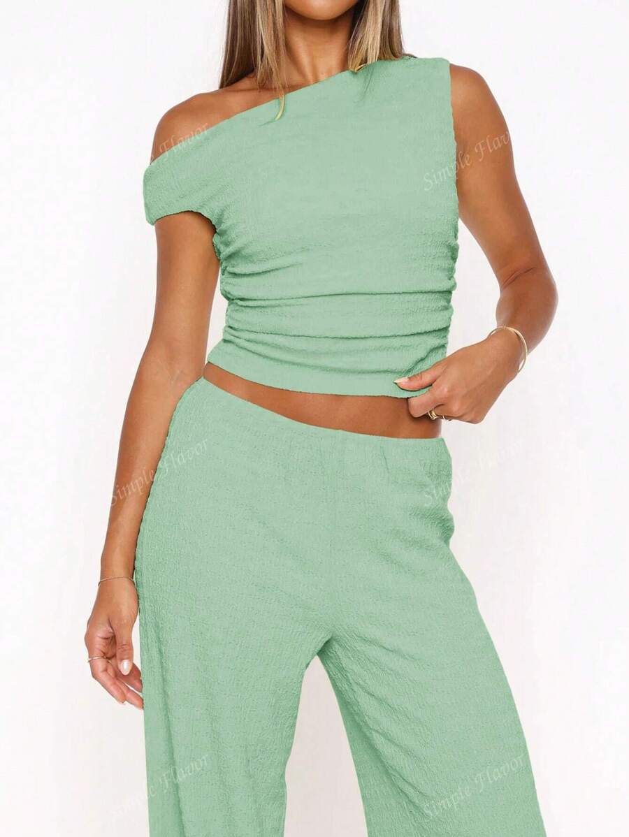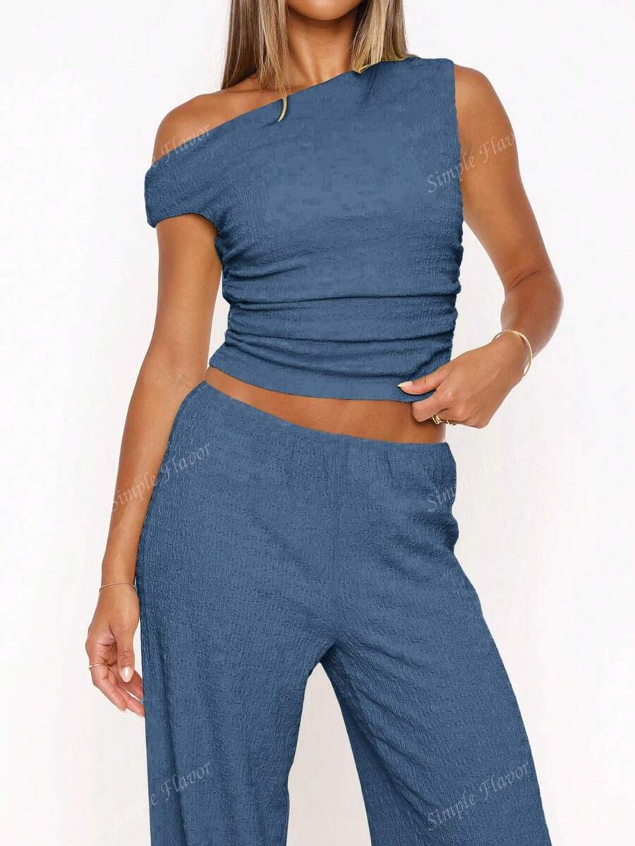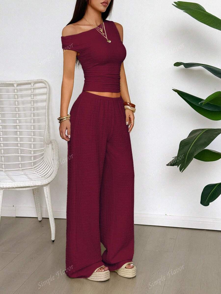 MIU Women's Two Pieces Summer Y2K Sexy Elegant And Casual Butter Yellow Knitted Texture Off-The-Shoulder T-Shirt Top And Loose Straight Wide-Leg Pants Set