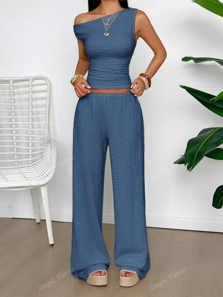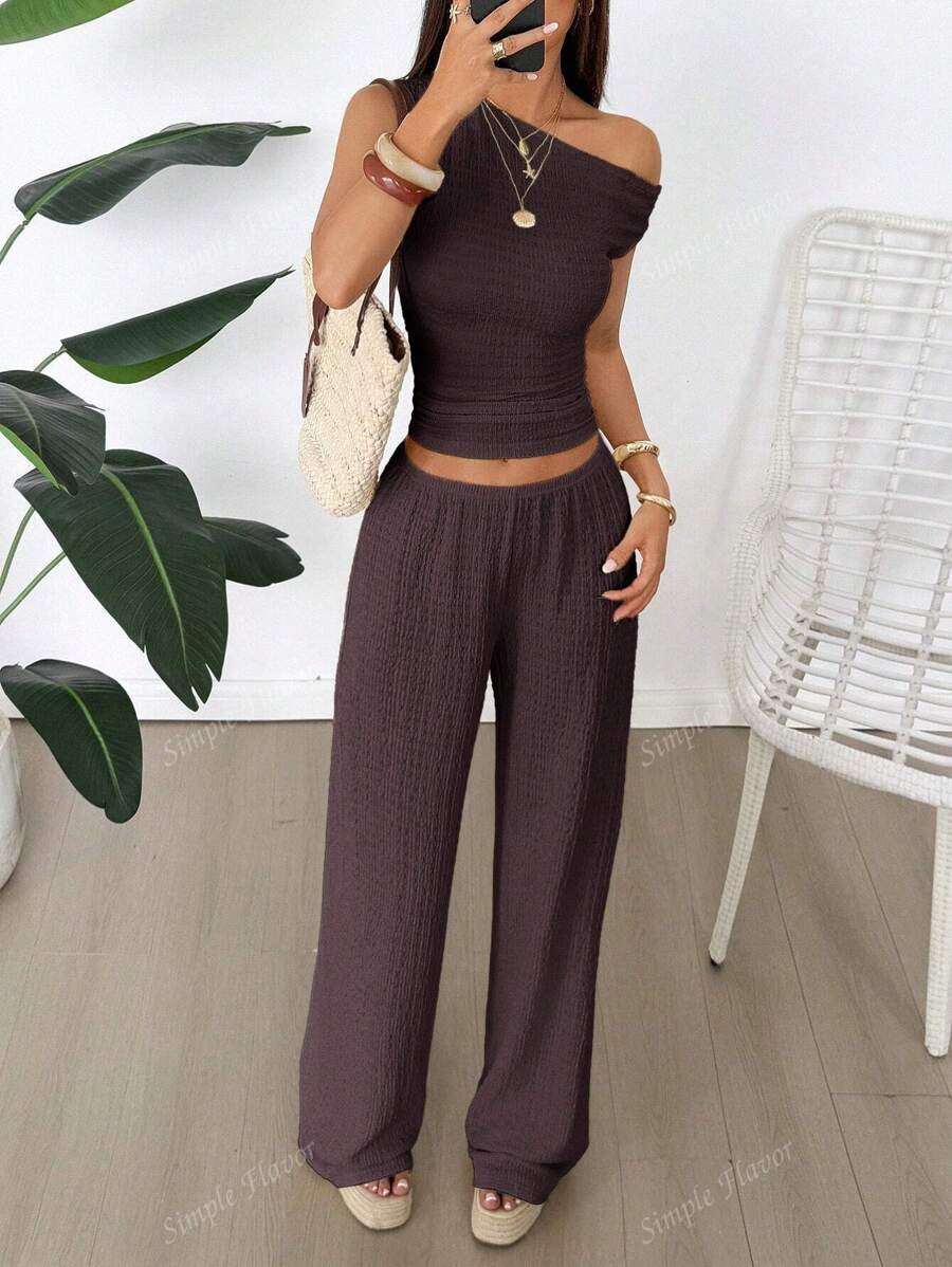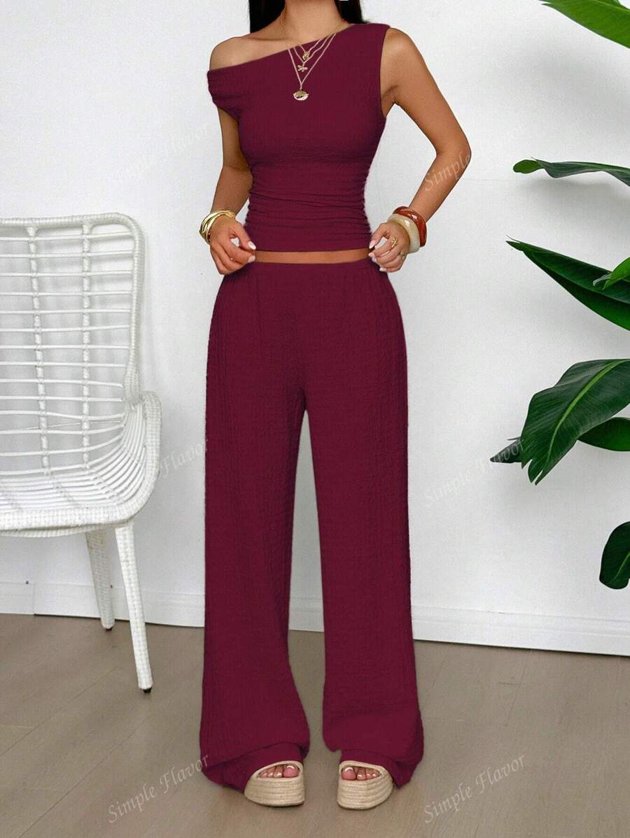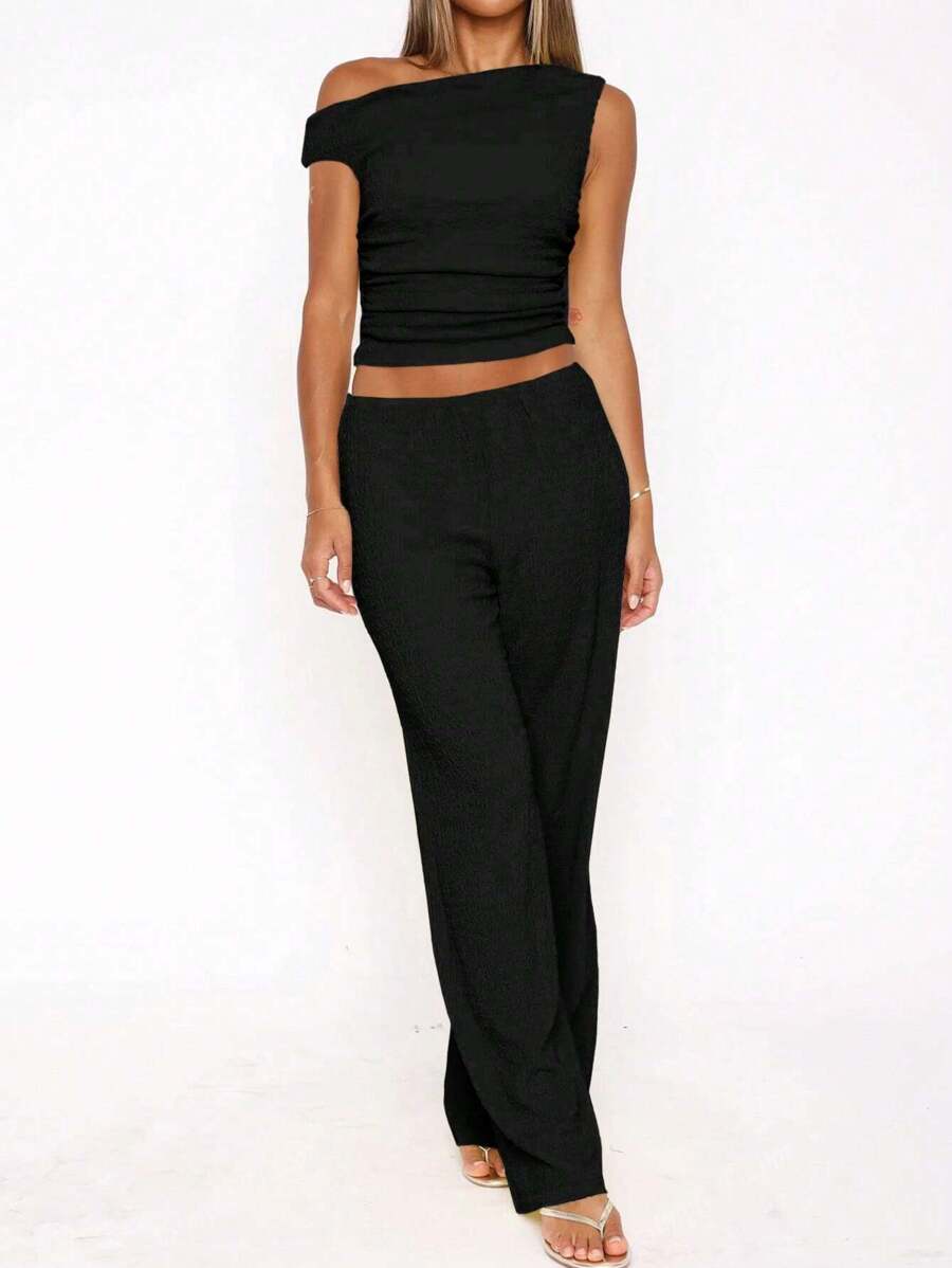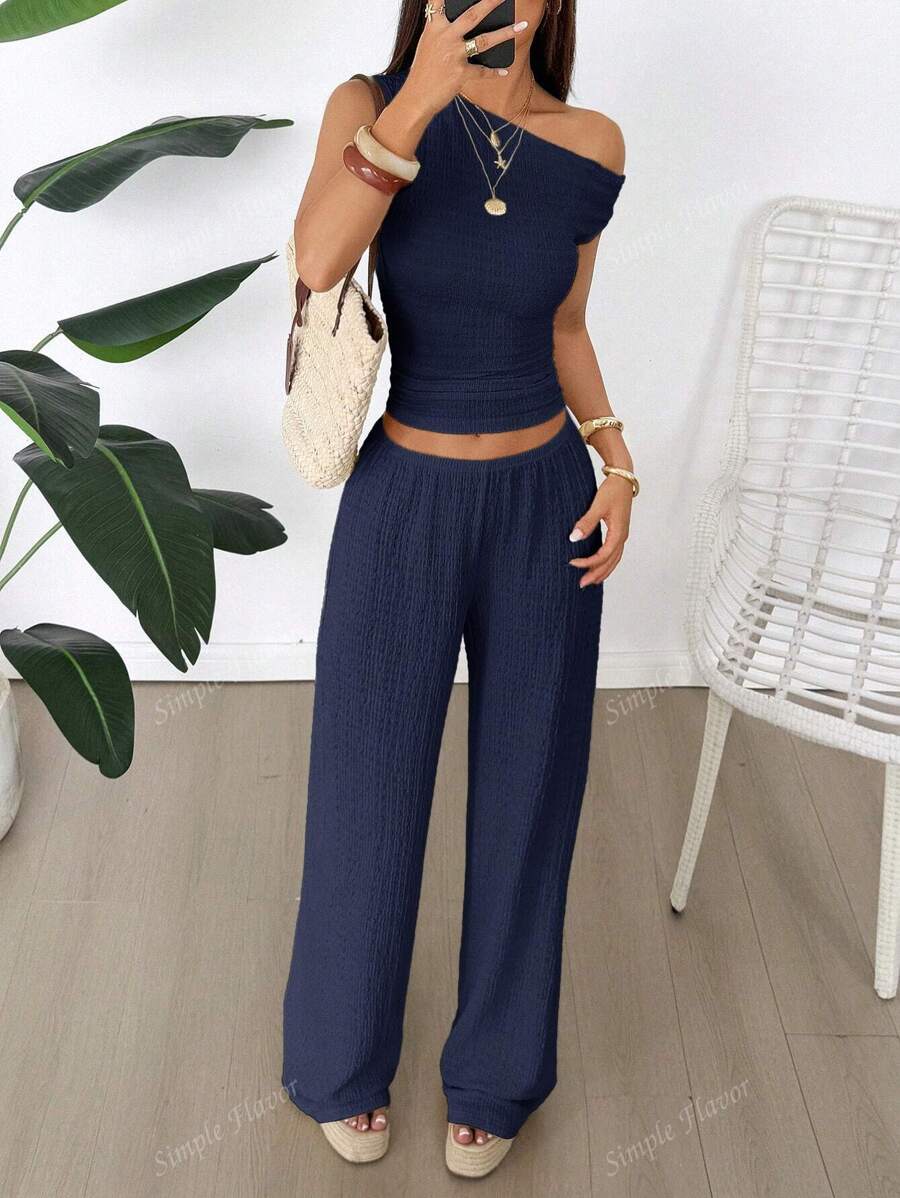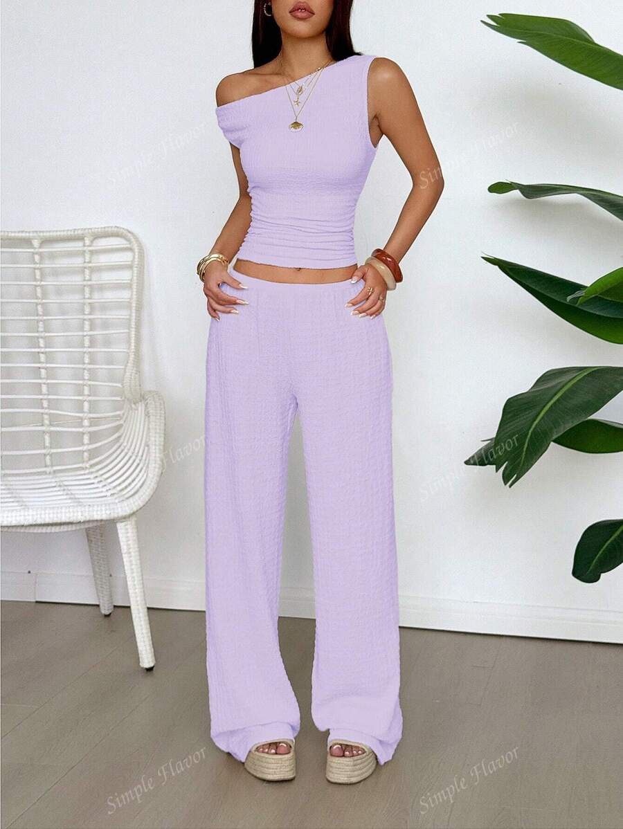 MIU Women's Two Pieces Summer Y2K Sexy Elegant And Casual Butter Yellow Knitted Texture Off-The-Shoulder T-Shirt Top And Loose Straight Wide-Leg Pants Set