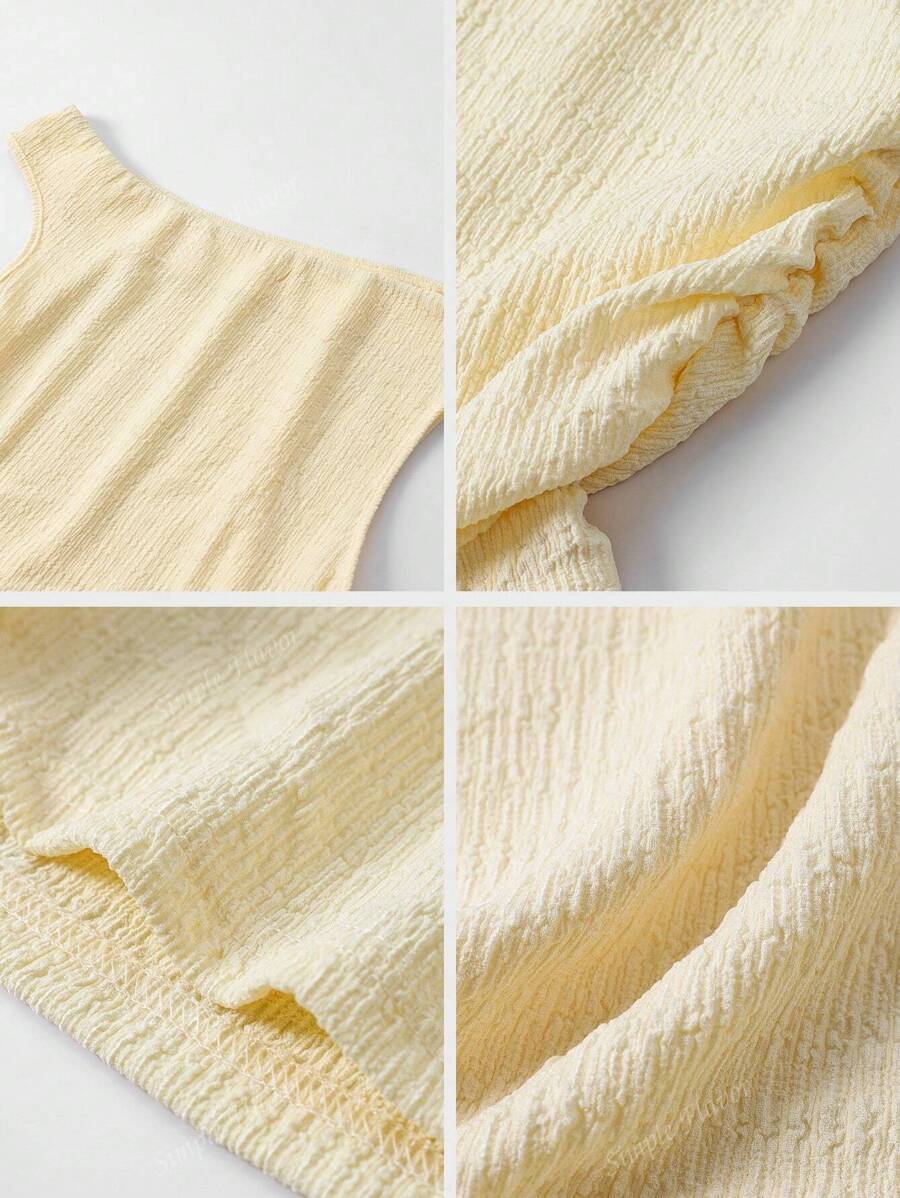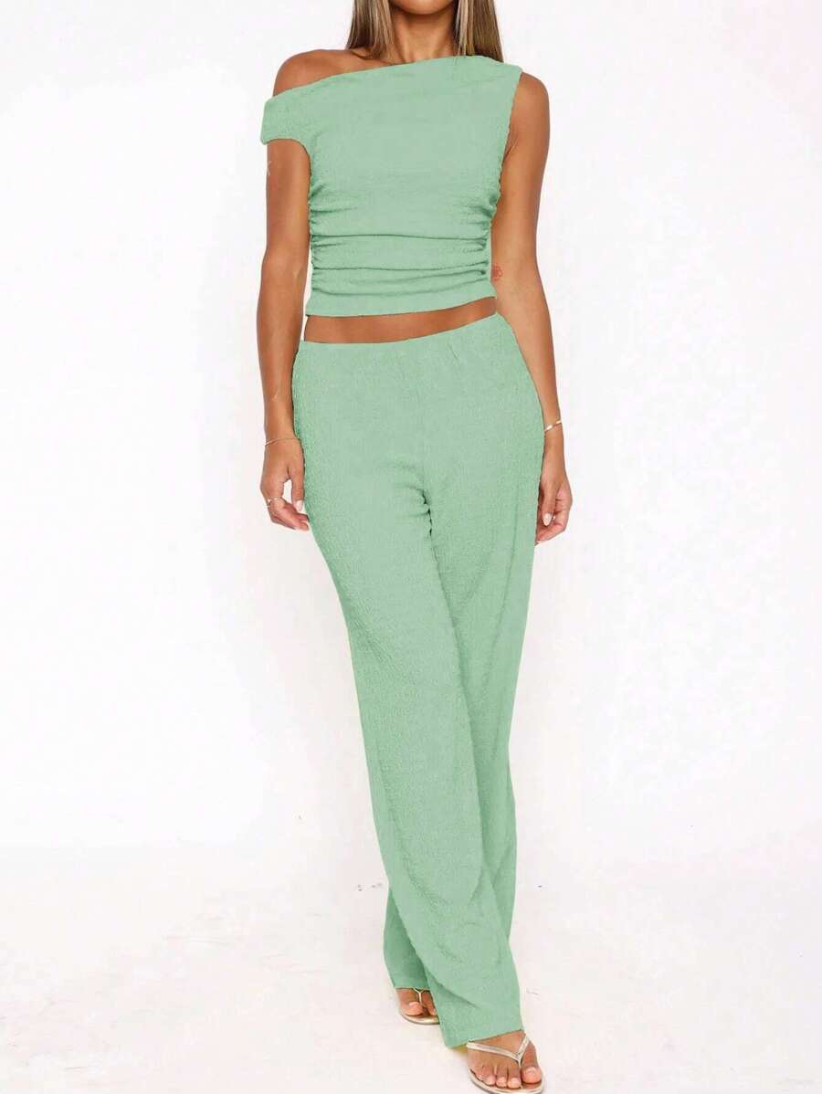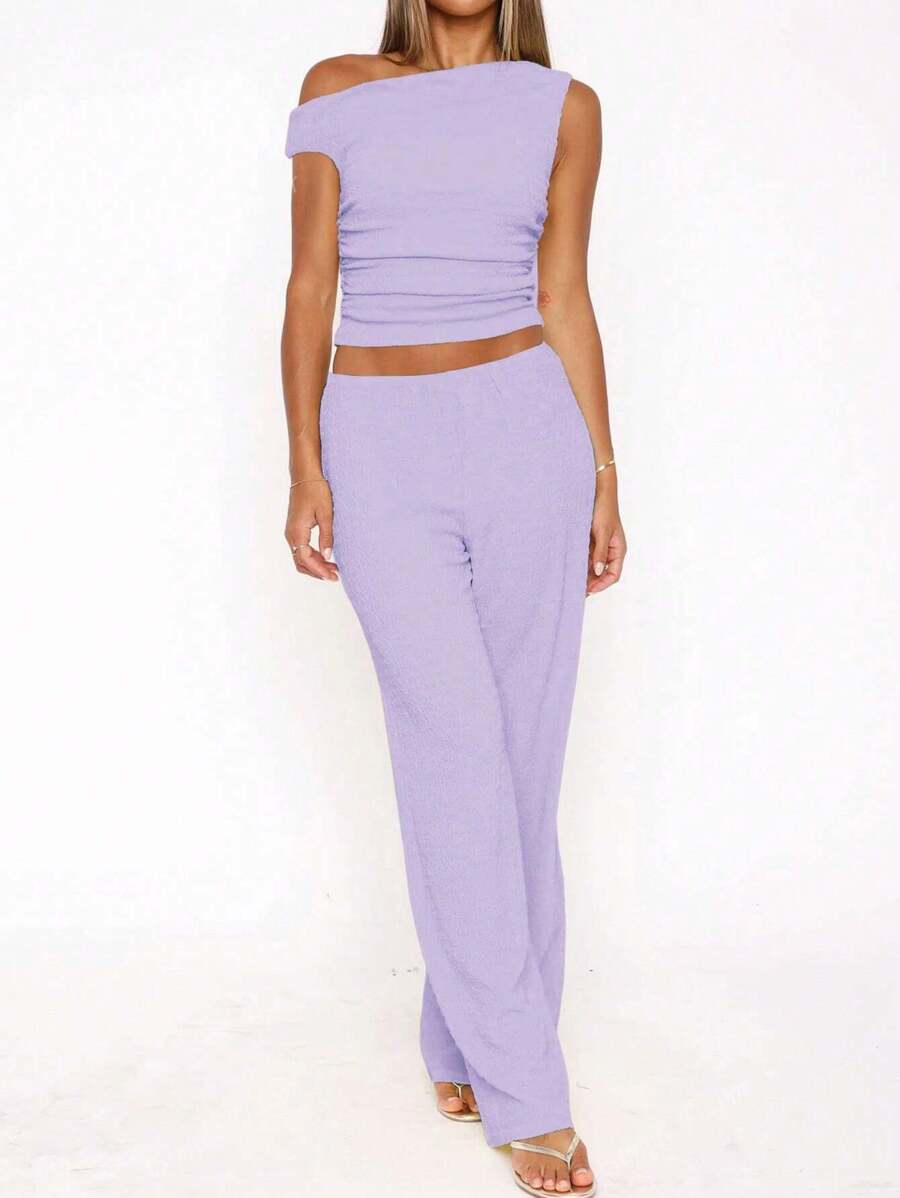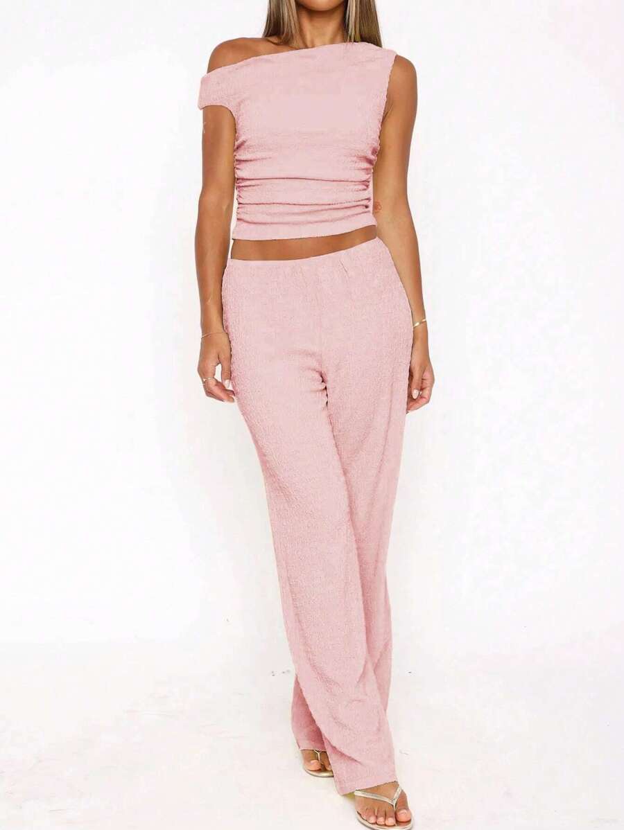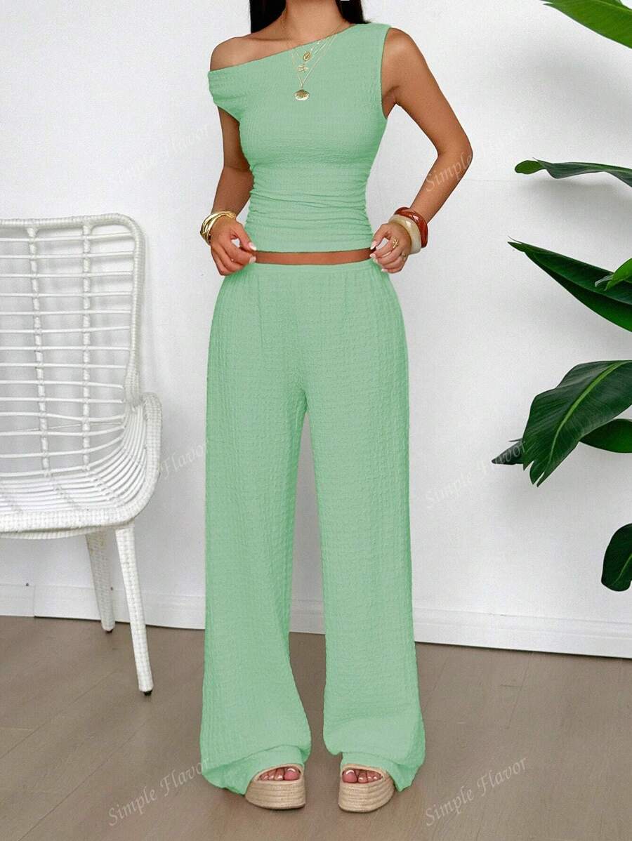 MIU Women's Two Pieces Summer Y2K Sexy Elegant And Casual Butter Yellow Knitted Texture Off-The-Shoulder T-Shirt Top And Loose Straight Wide-Leg Pants Set
