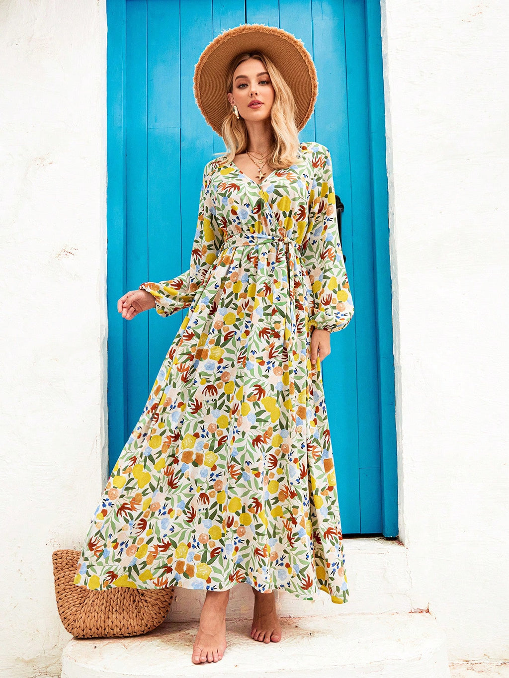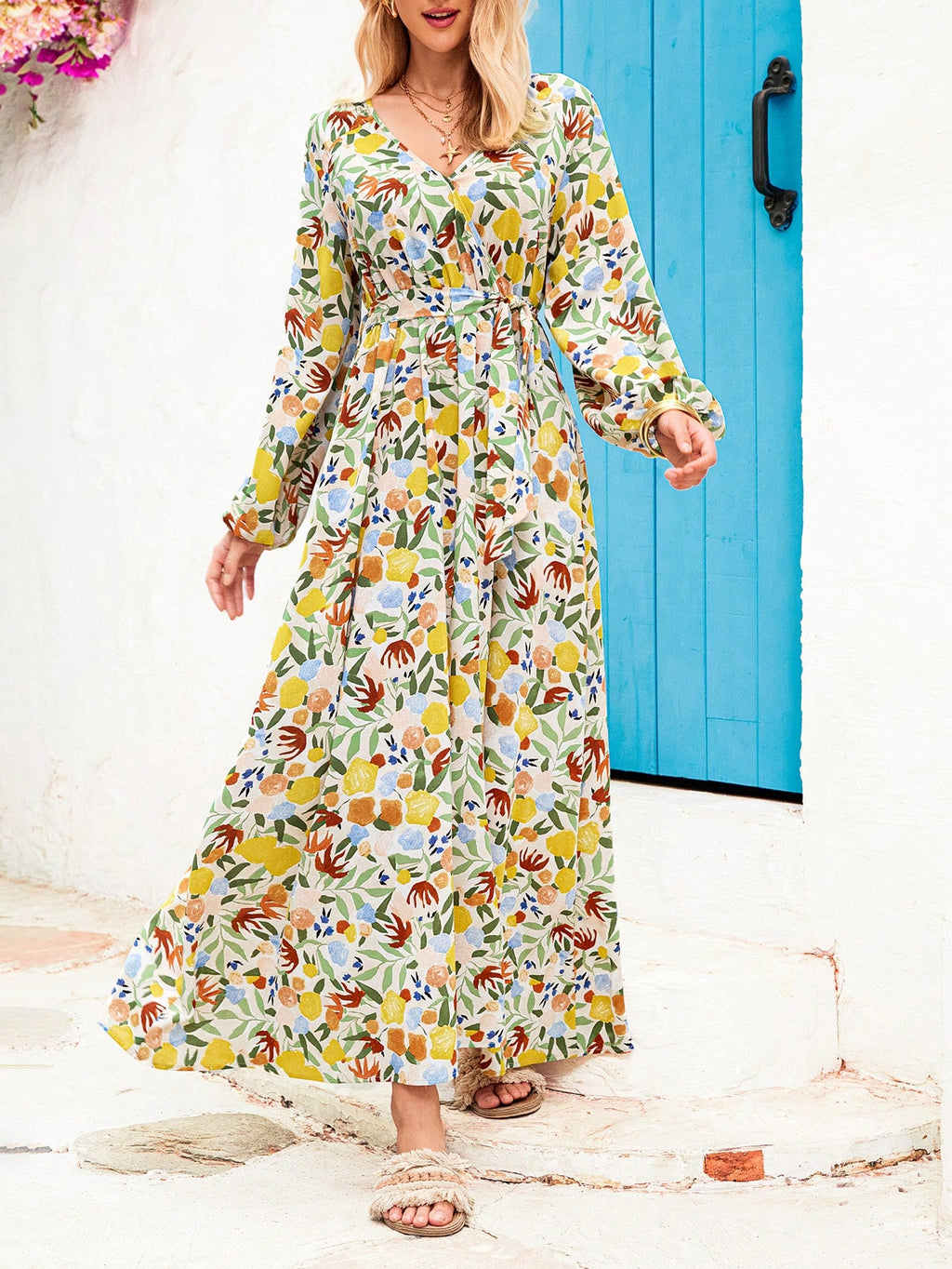 MIU Women's V-Neck Plant Print Lantern Sleeve Tie-Up Long Dress, Perfect For Vacation,Vacation Outfits For Women
