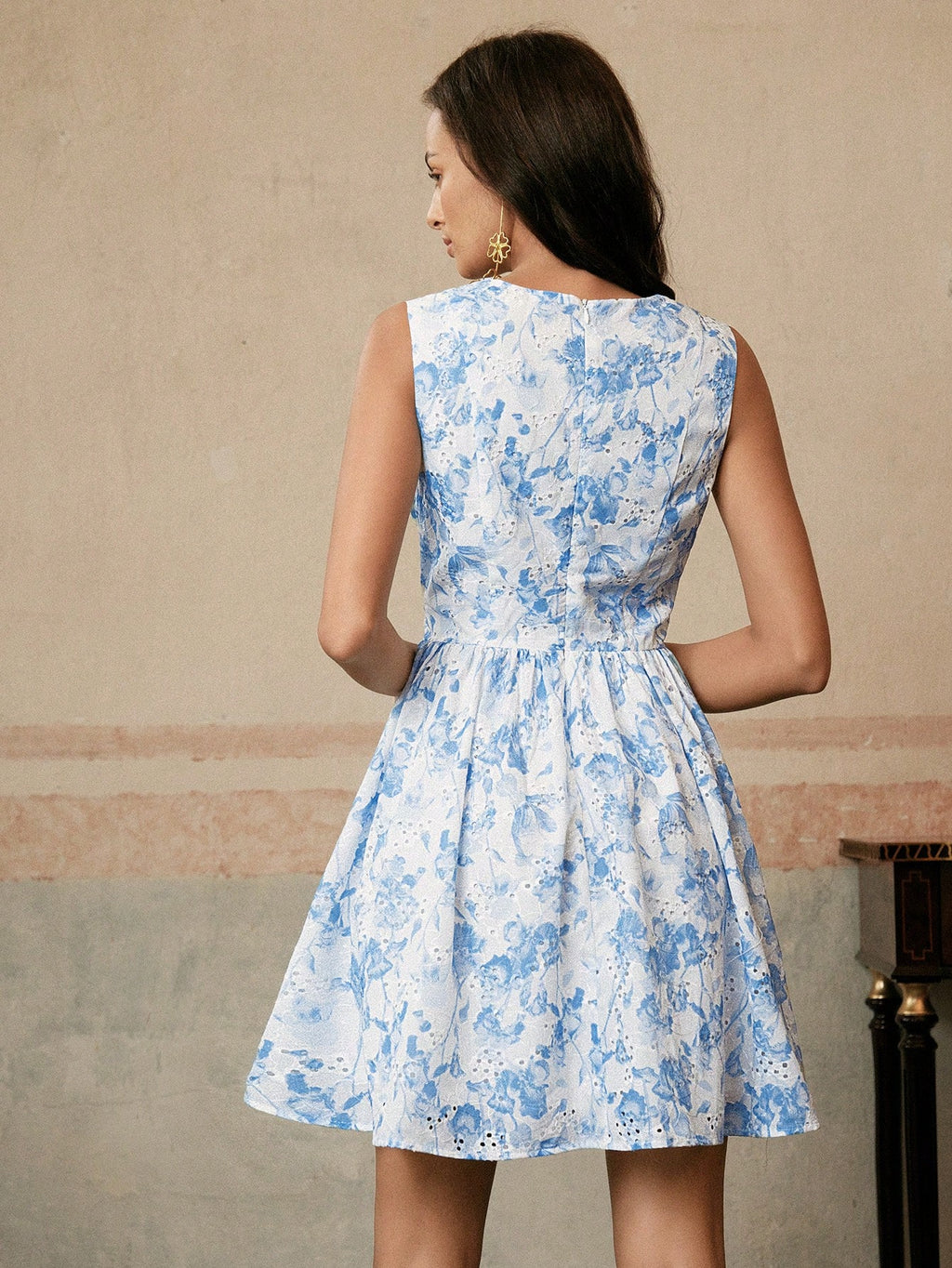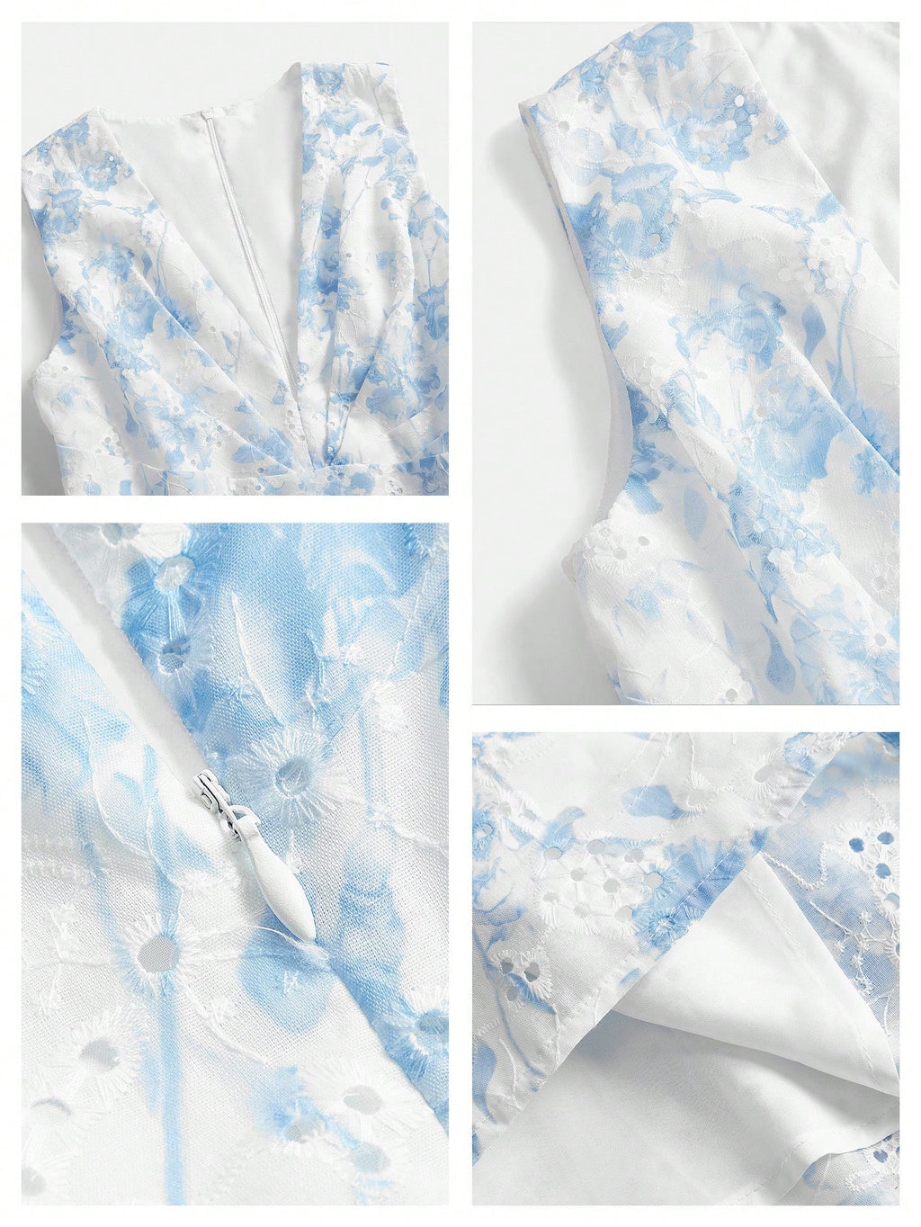 MIU Women's Vacation Blue Hollow Floral Embroidered Deep V Sleeveless A-Line Dress, Spring Outfits For Women, Summer, Beach, Casual, Festival, Elegant
