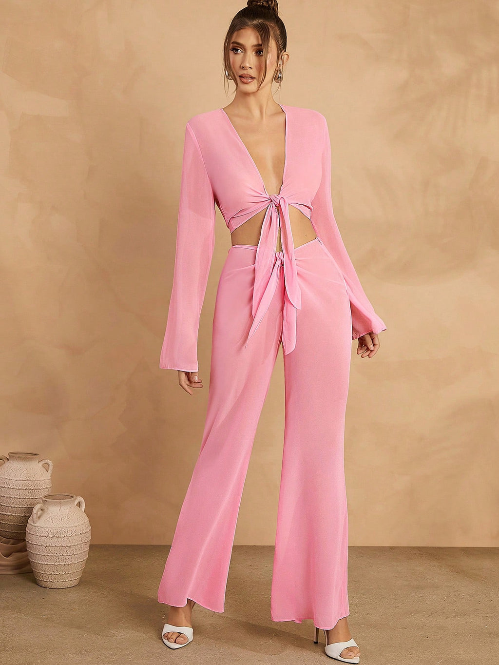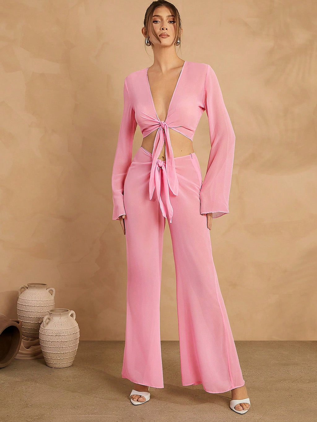 MIU Women's Vacation Casual Solid Color Bell Sleeve Tie Front Crop Blouse
