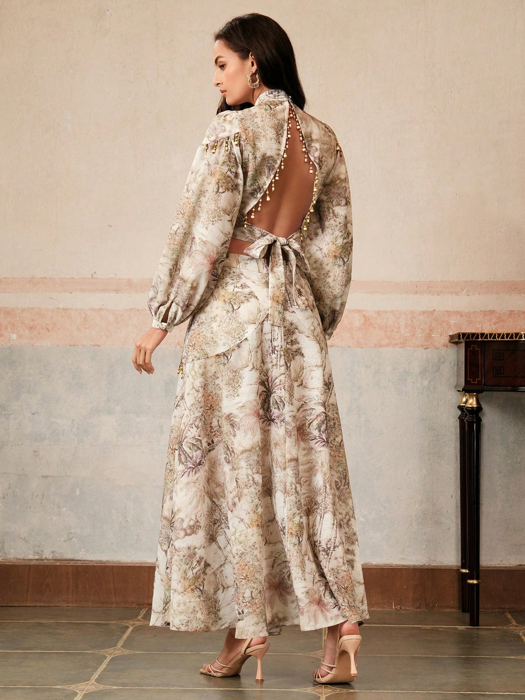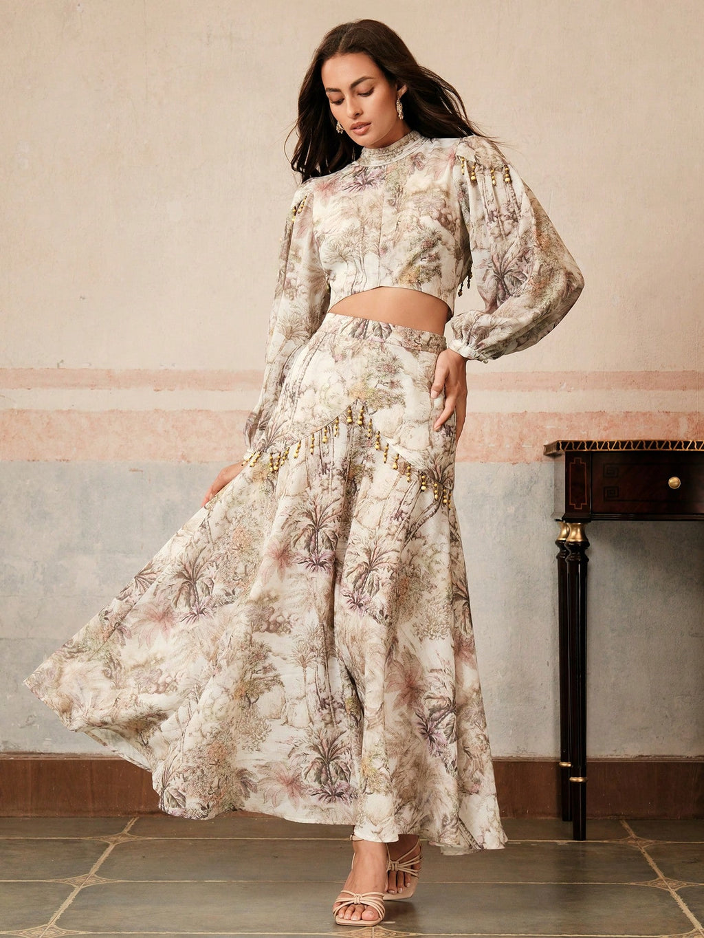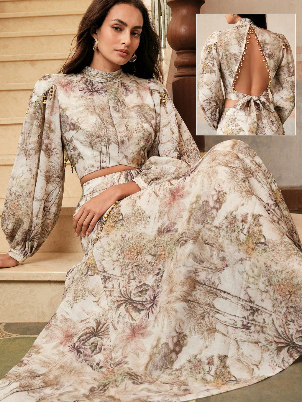MIU Women's Vintage Elegant Lantern Sleeve Backless Tie Floral Print Shirt Top And Ruffle Hem Midi Skirt 2pcs Set, Suitable For Holiday, Festival, Graduation Spring/Summer
