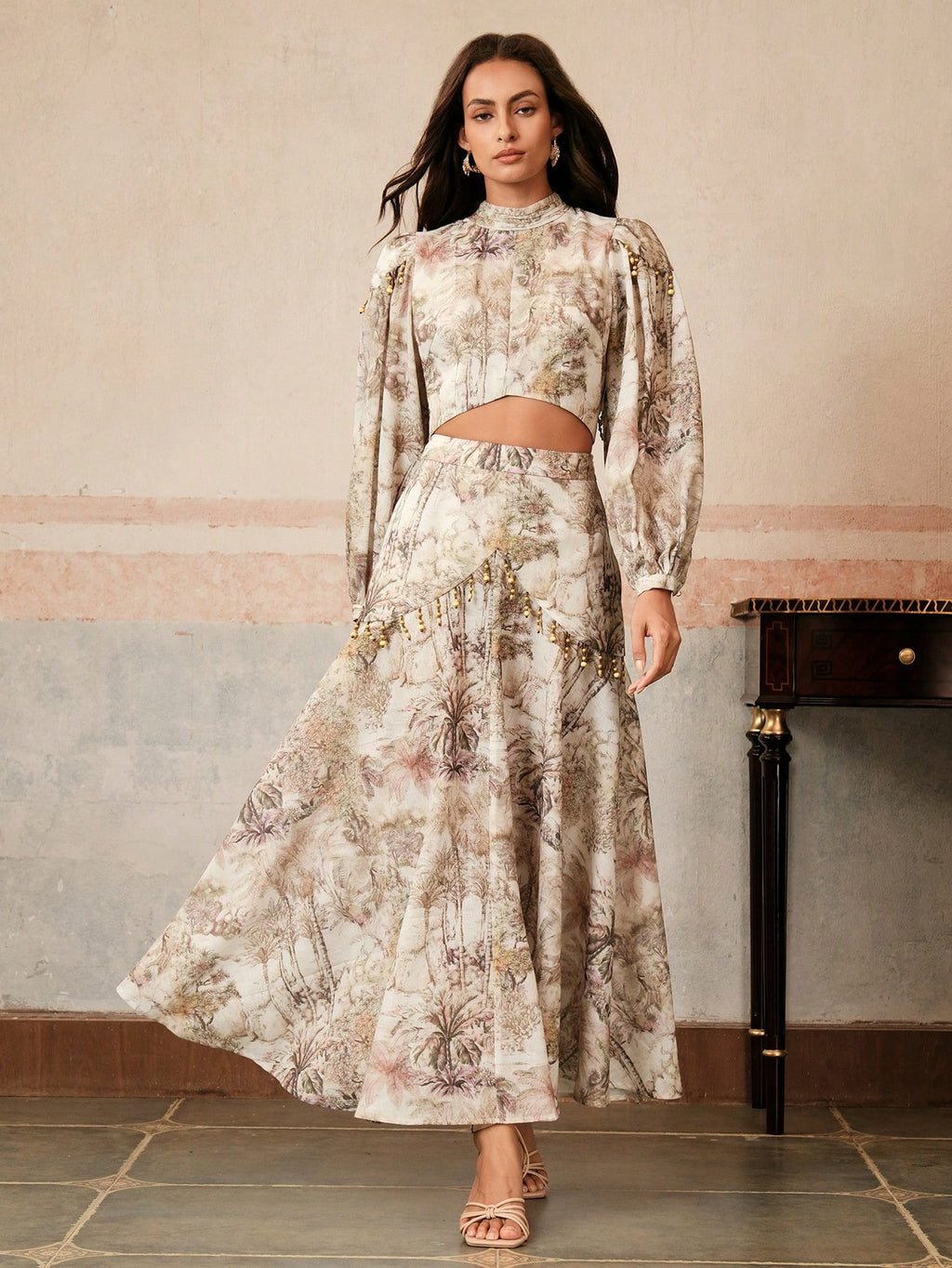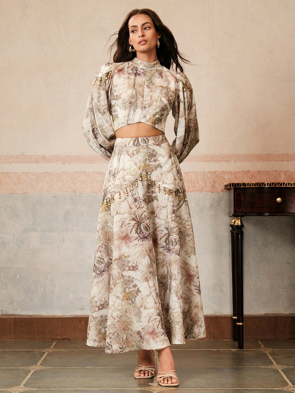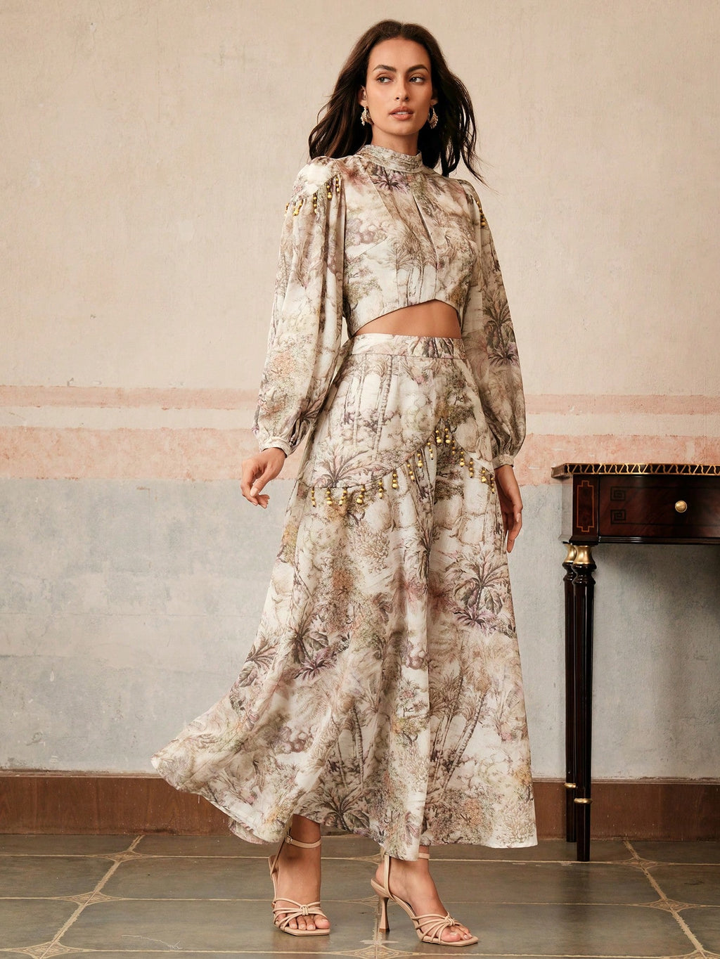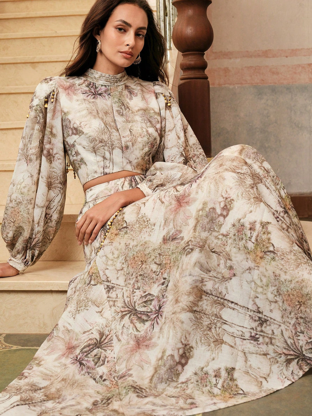MIU Women's Vintage Elegant Lantern Sleeve Backless Tie Floral Print Shirt Top And Ruffle Hem Midi Skirt 2pcs Set, Suitable For Holiday, Festival, Graduation Spring/Summer