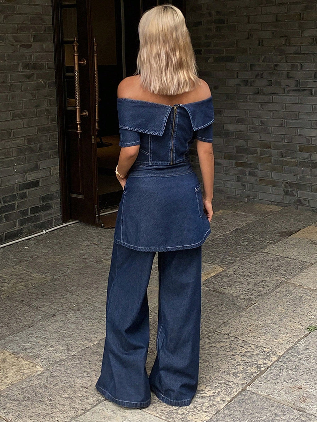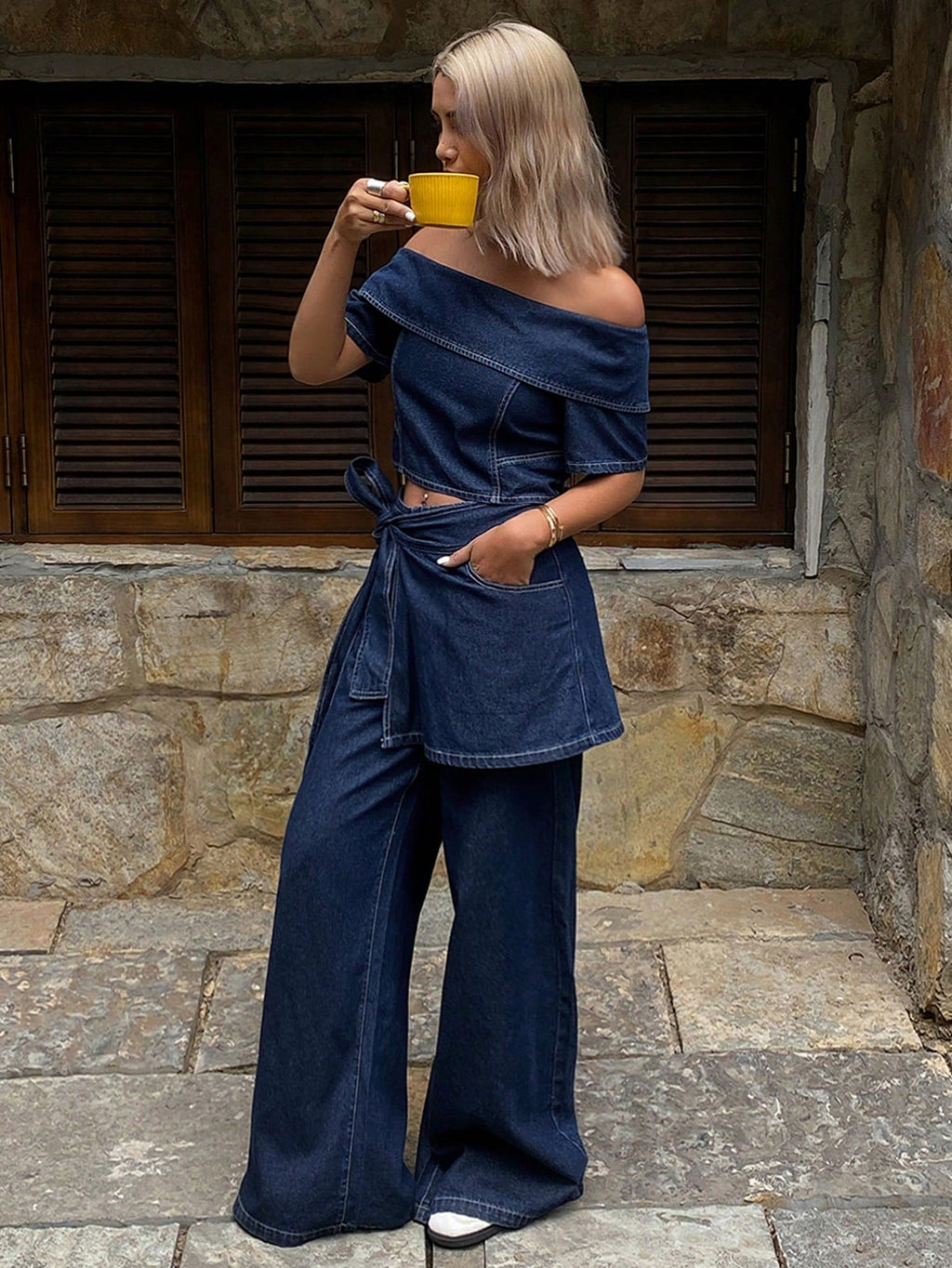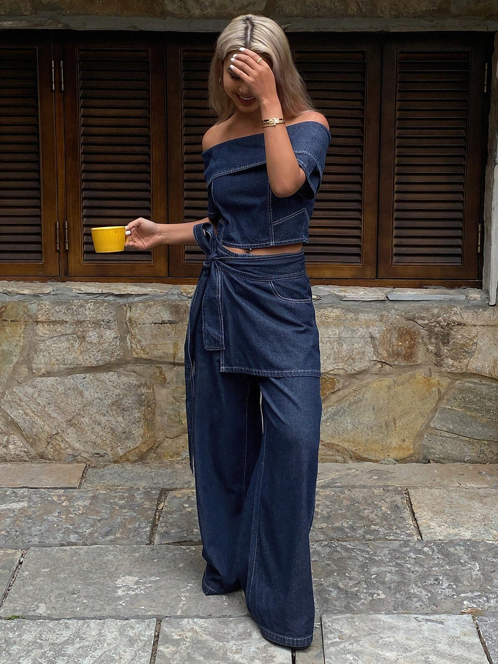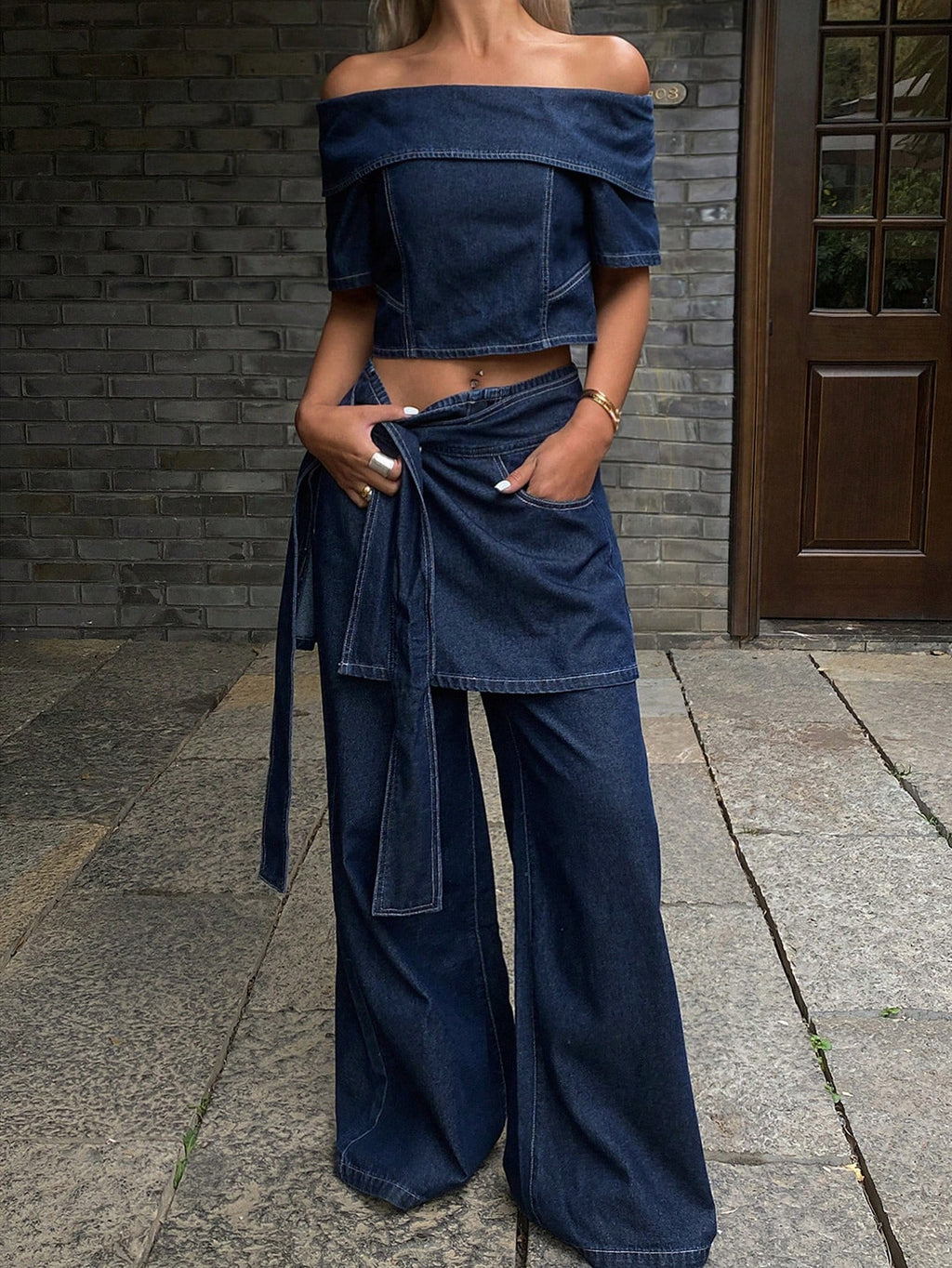 MIU Women's Washed Off-Shoulder Blouse, Loose Pants, Denim Skirt 3 Piece Outfit Set