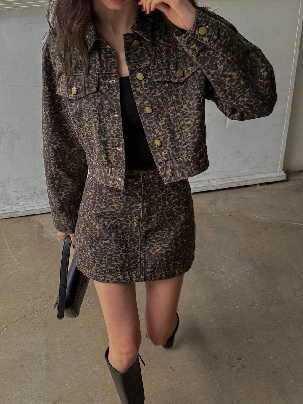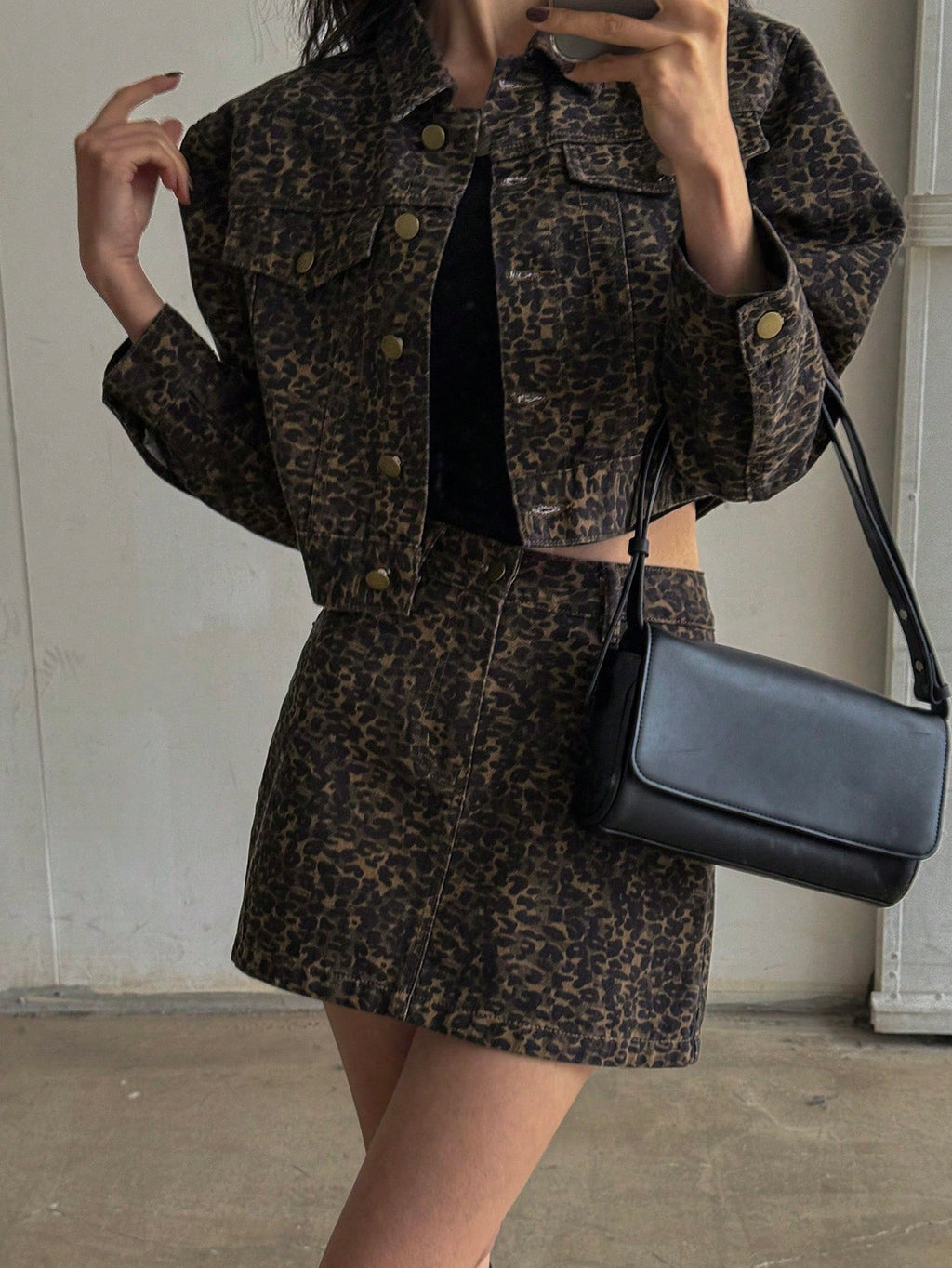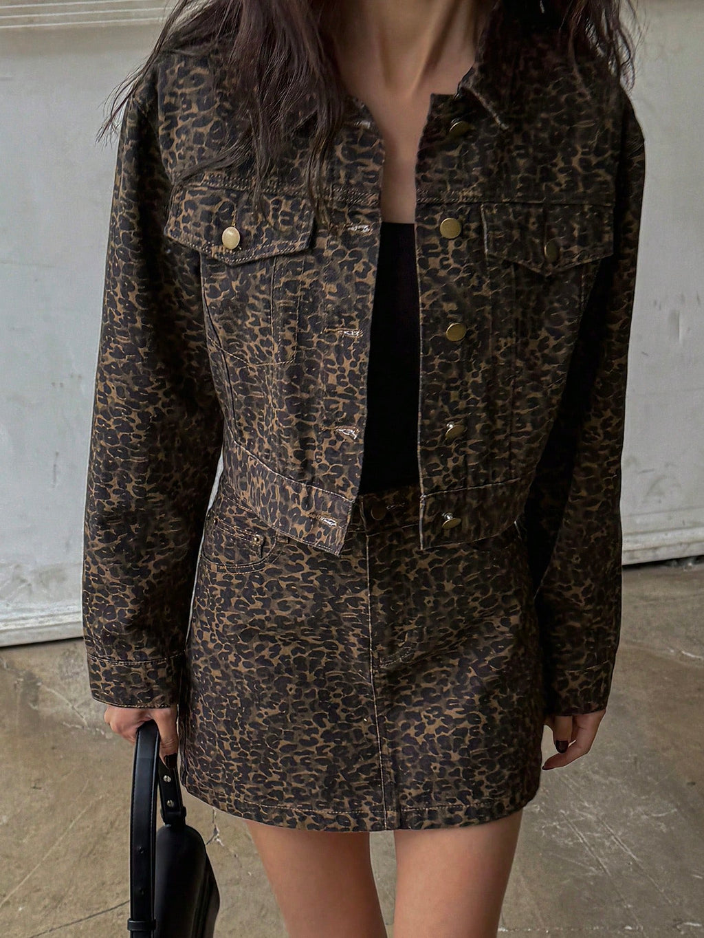 MIU Women's Western Style Denim Set, Full-Body Leopard Print Jacket