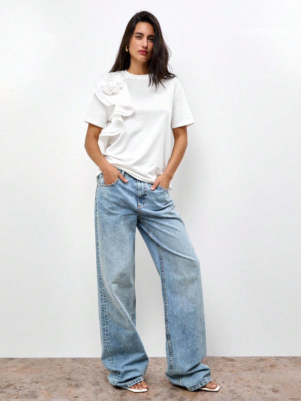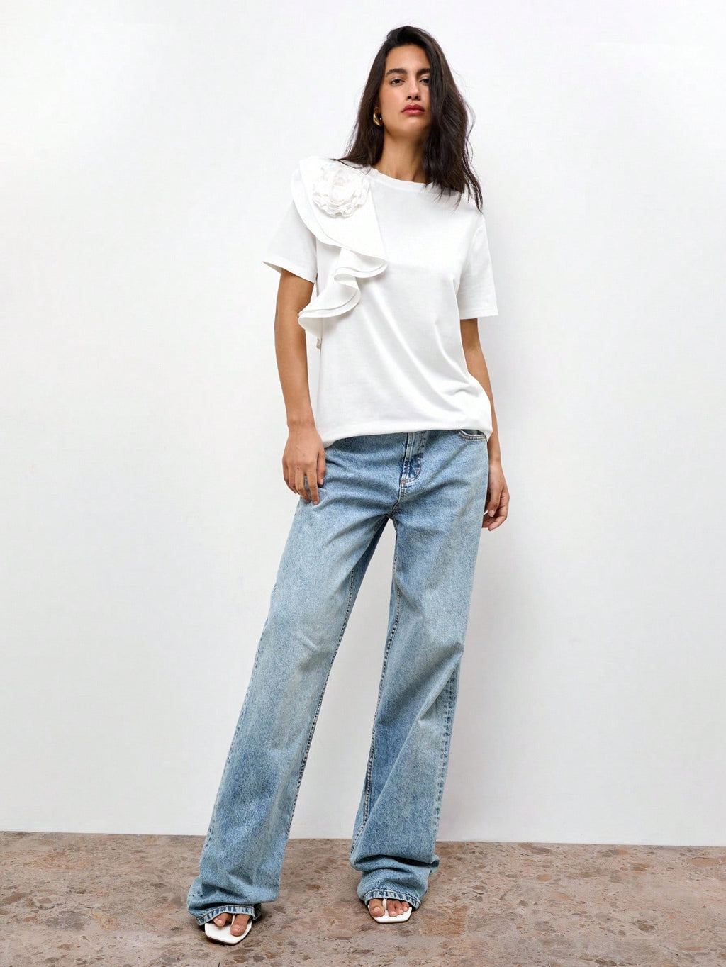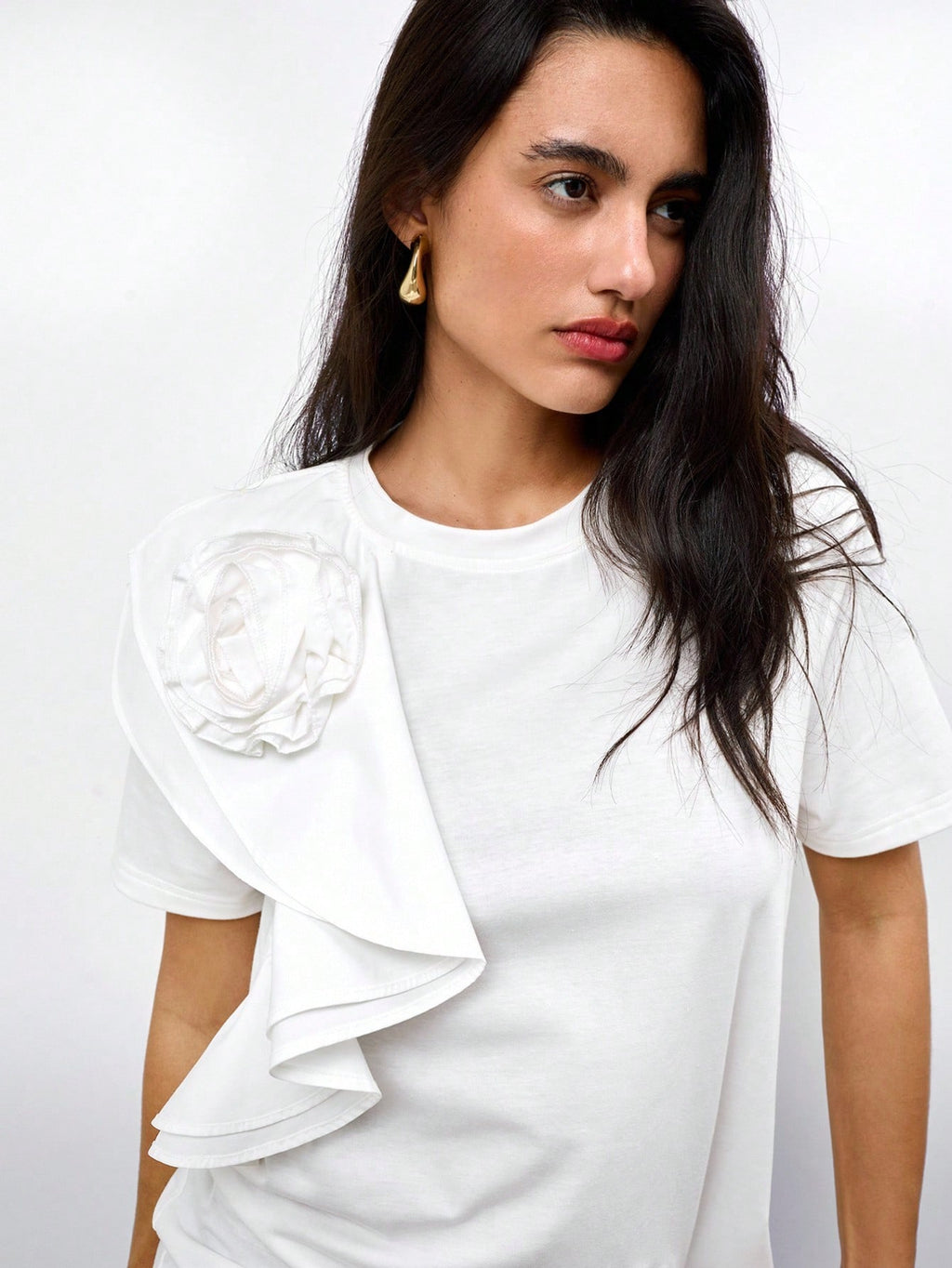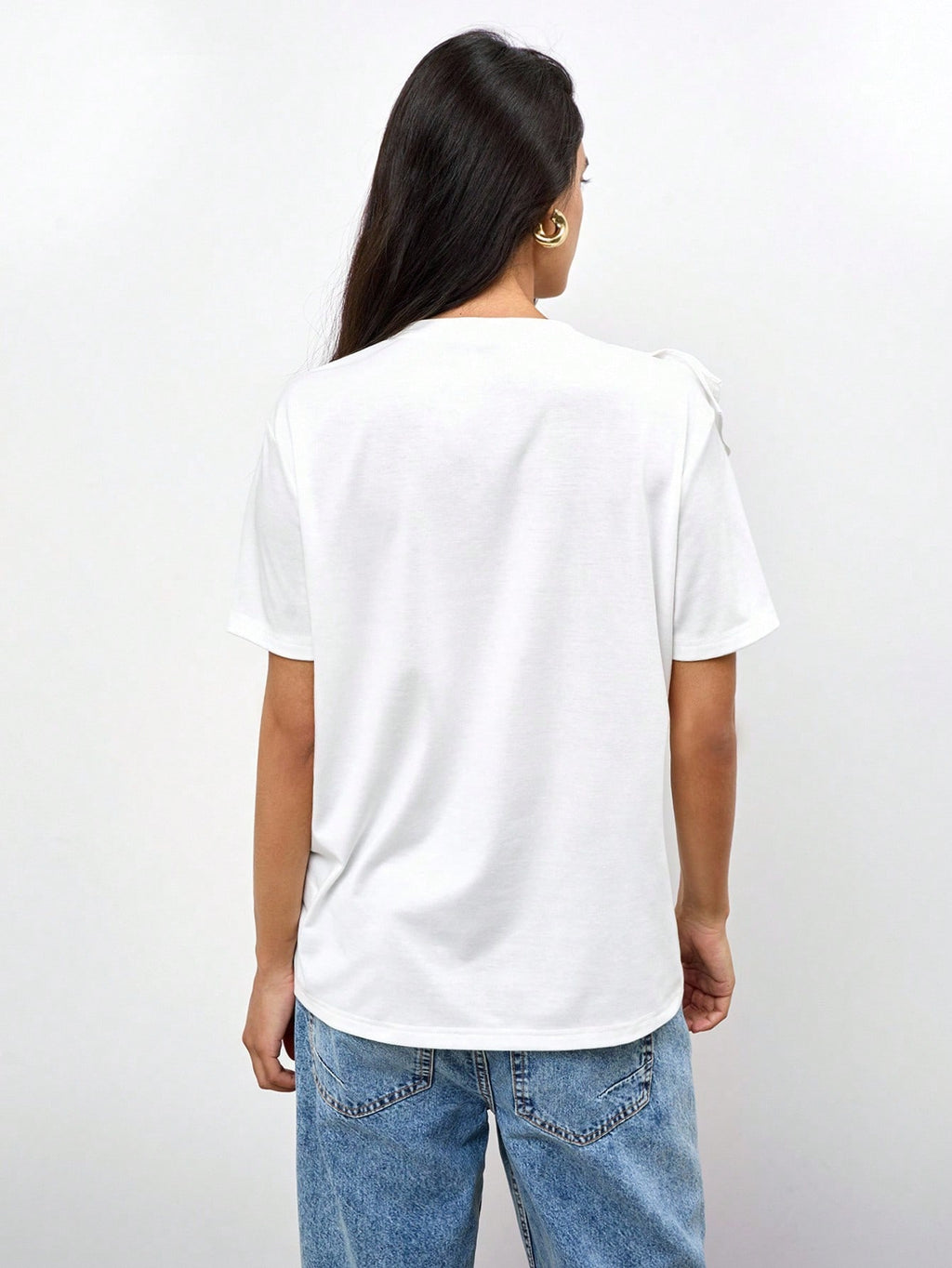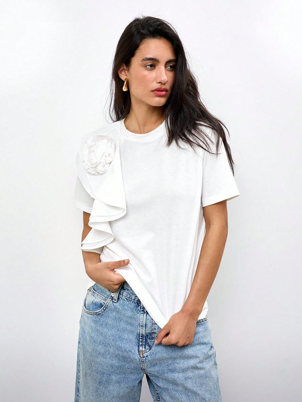 MIU Women's White Floral Decor Crew Neck Simple Casual T-Shirt Top, Elegant Everyday