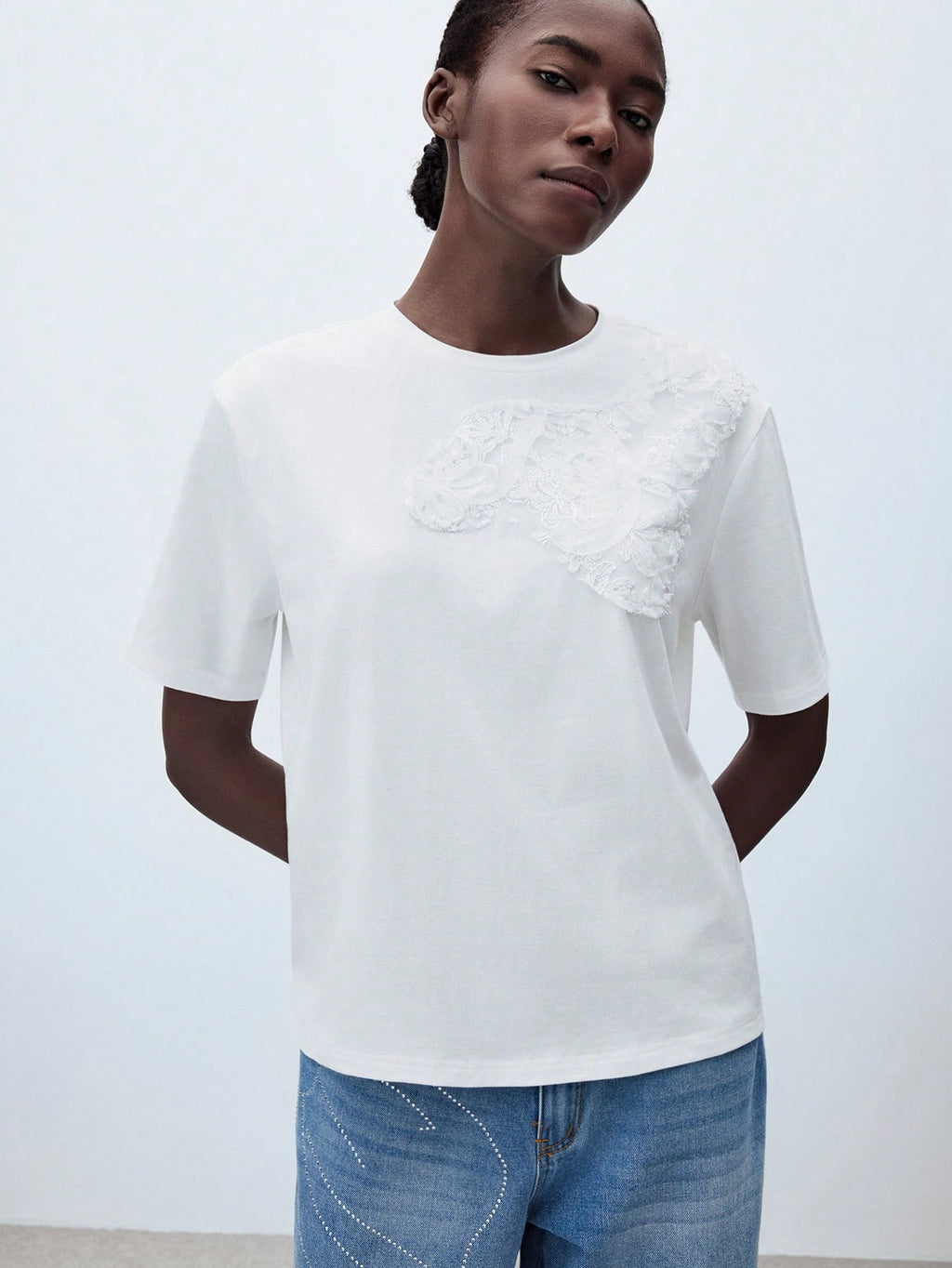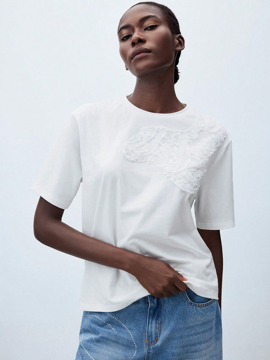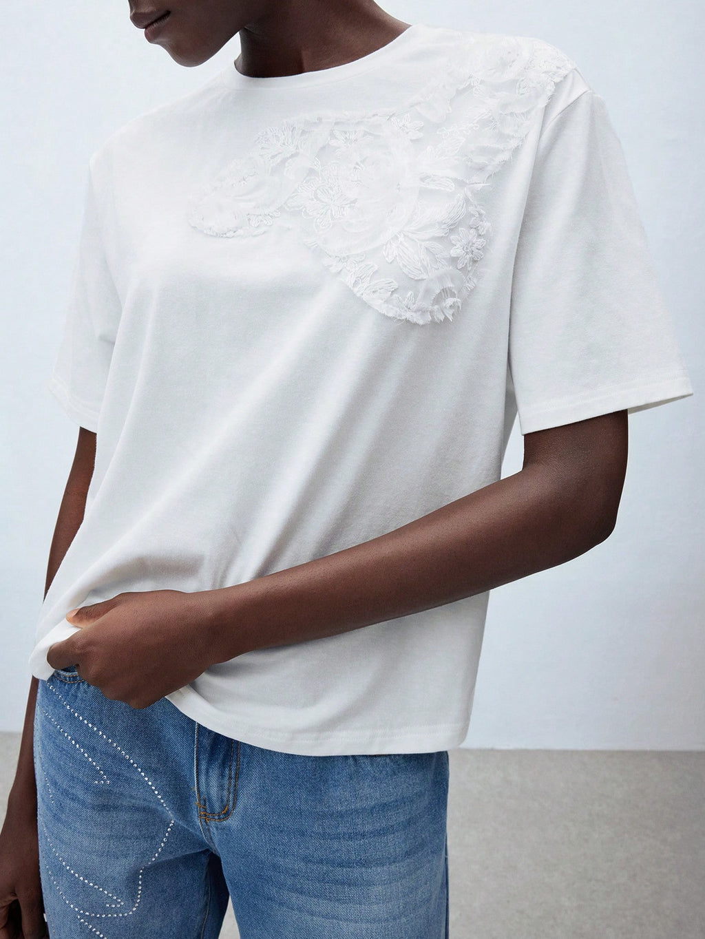 MIU Women's White Floral Patched Loose Casual Crew Neck T-Shirt, Minimalist