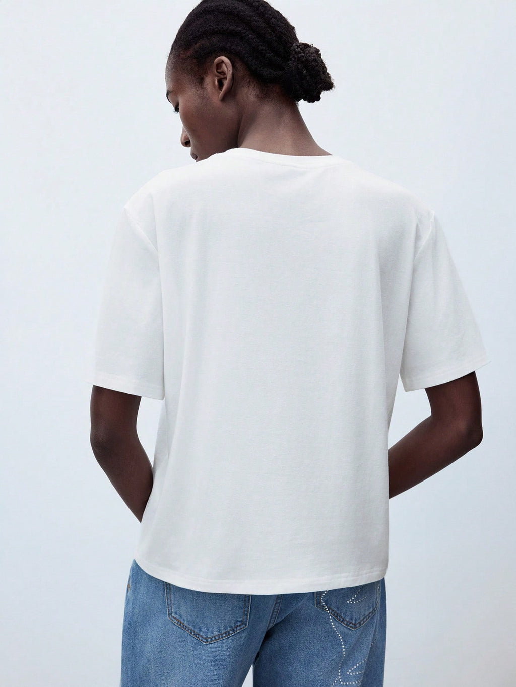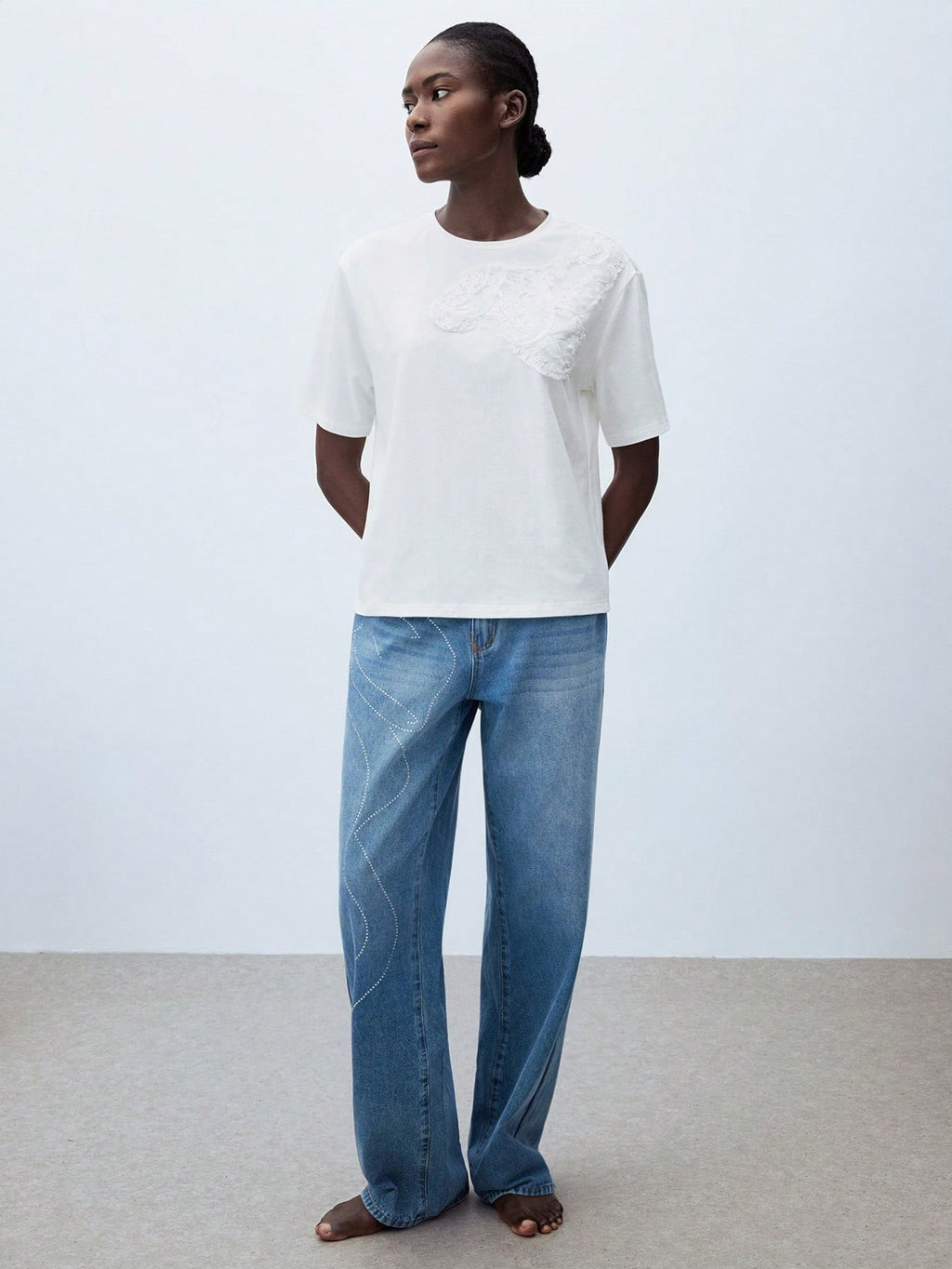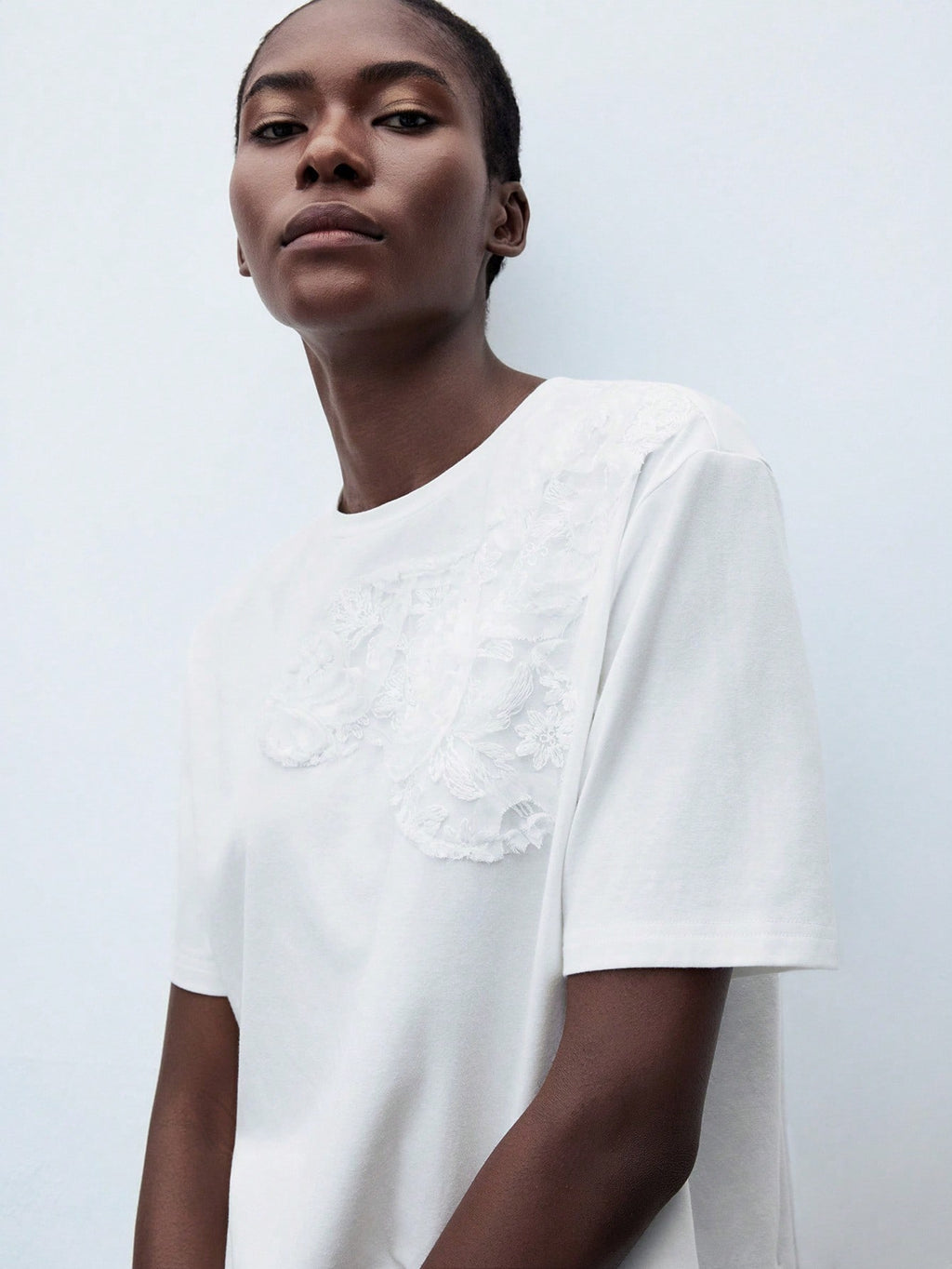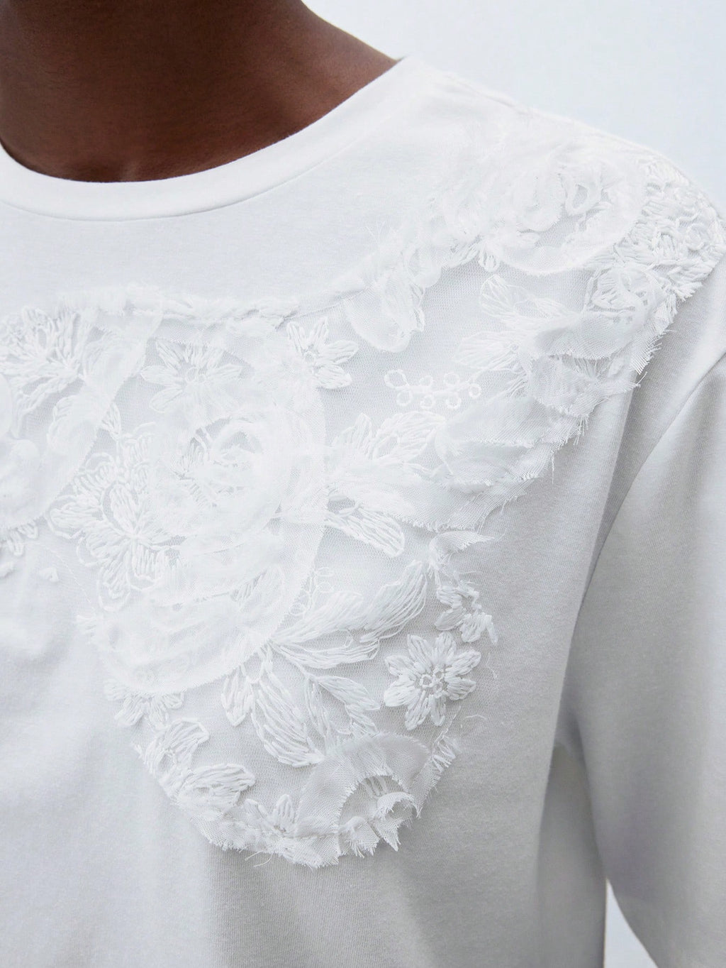 MIU Women's White Floral Patched Loose Casual Crew Neck T-Shirt, Minimalist
