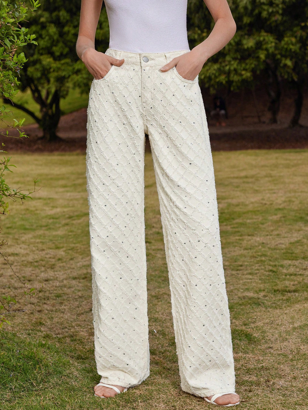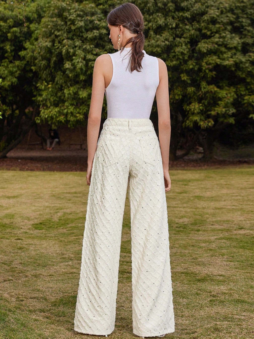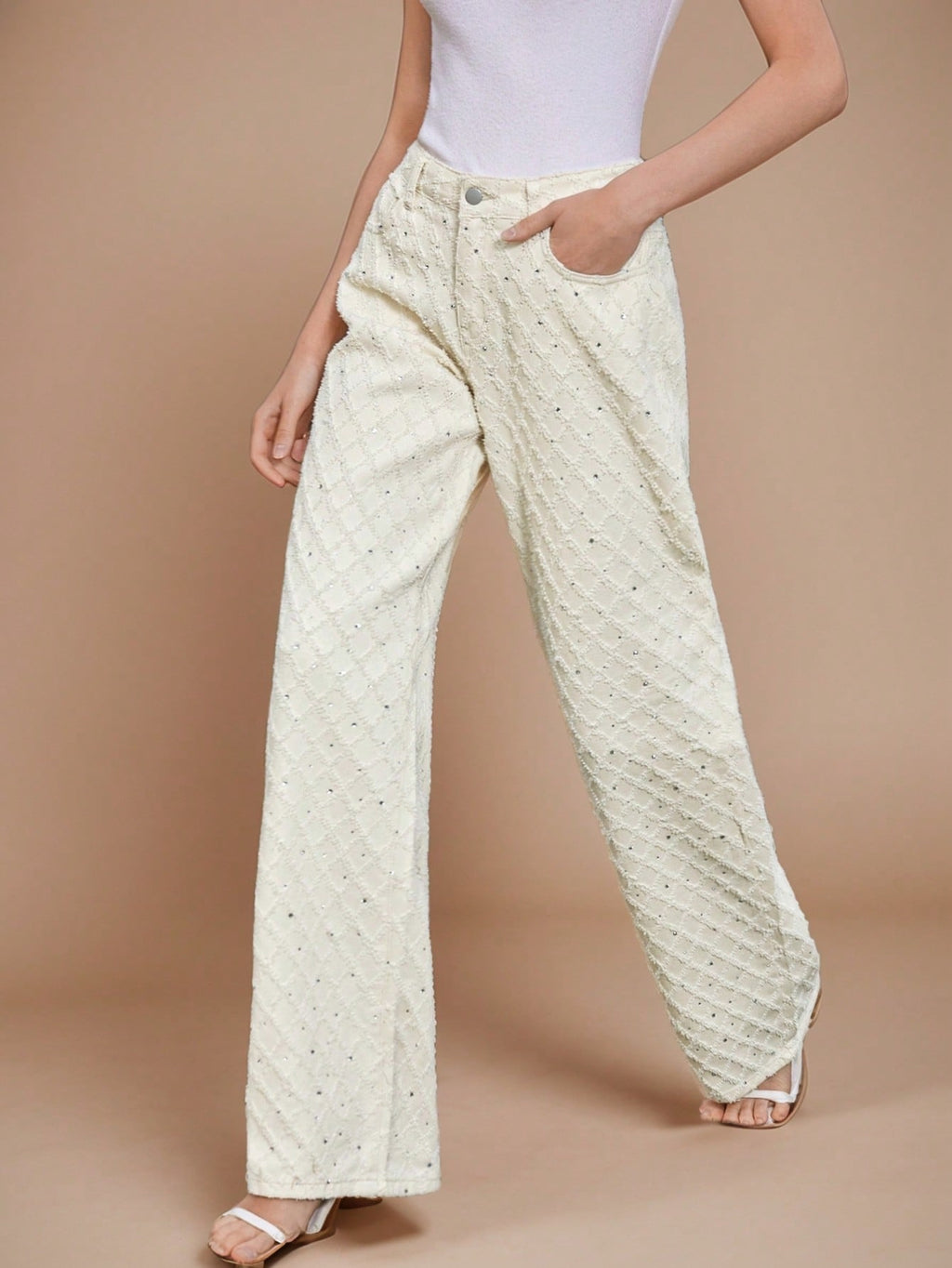 MIU Women's White Wide Leg Textured Fringe Detail Palazzo Pants, Suitable For Festival, Going Out, Vacation Outfits