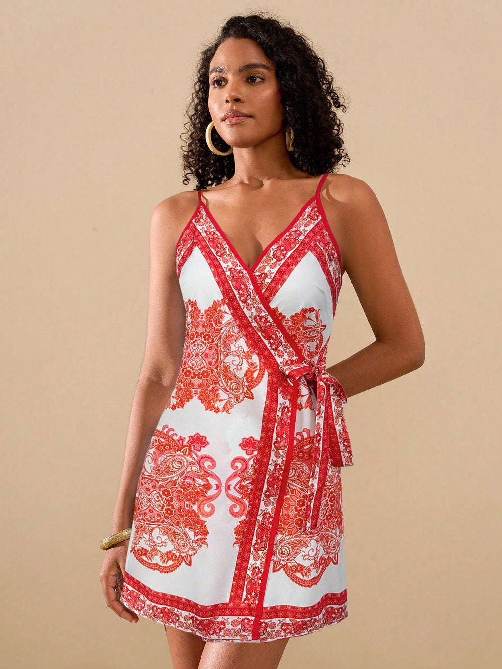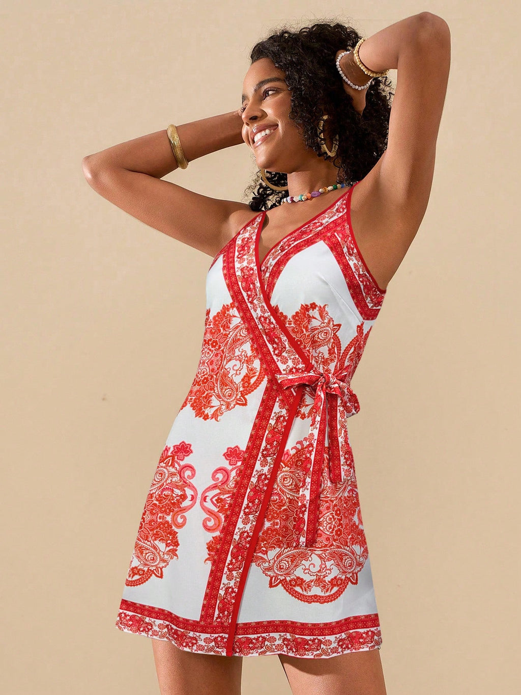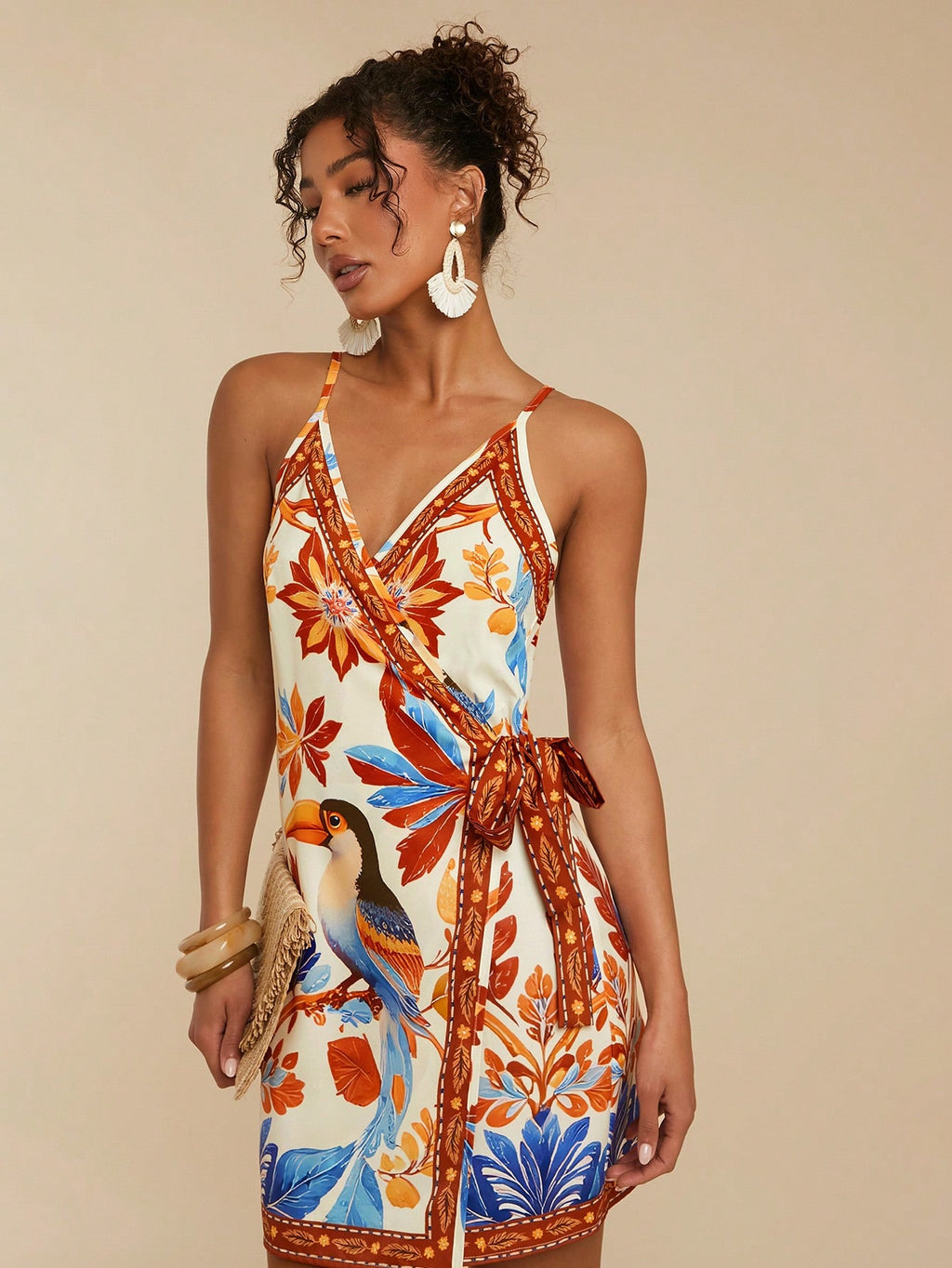 MIU Women's Wrap Tie Side Print Dress, Suitable For Holiday,Summer Dresses For Women,Women Summer Clothing,Vacation Style,For Beach Vacation