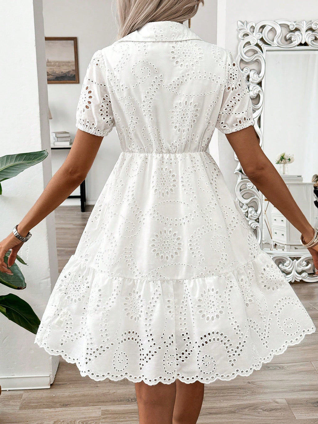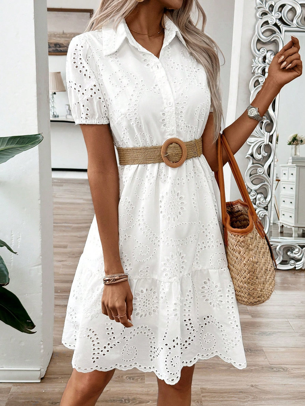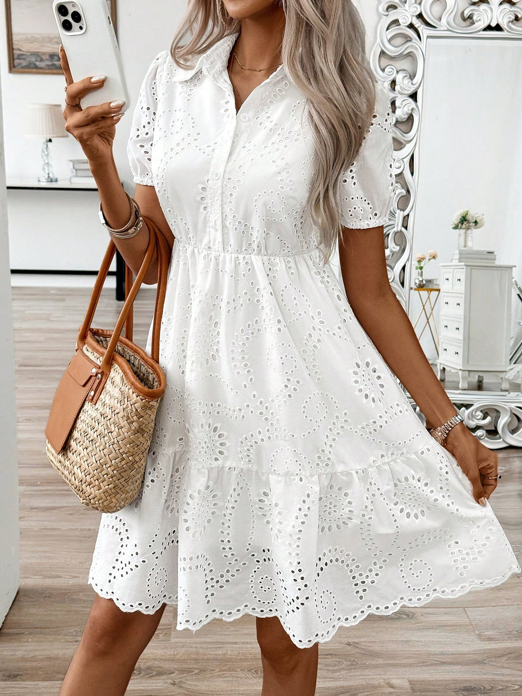 MIU Woven Hollow Shirt Collar, Puff Sleeves, Cute Doll Version Summer White Dress