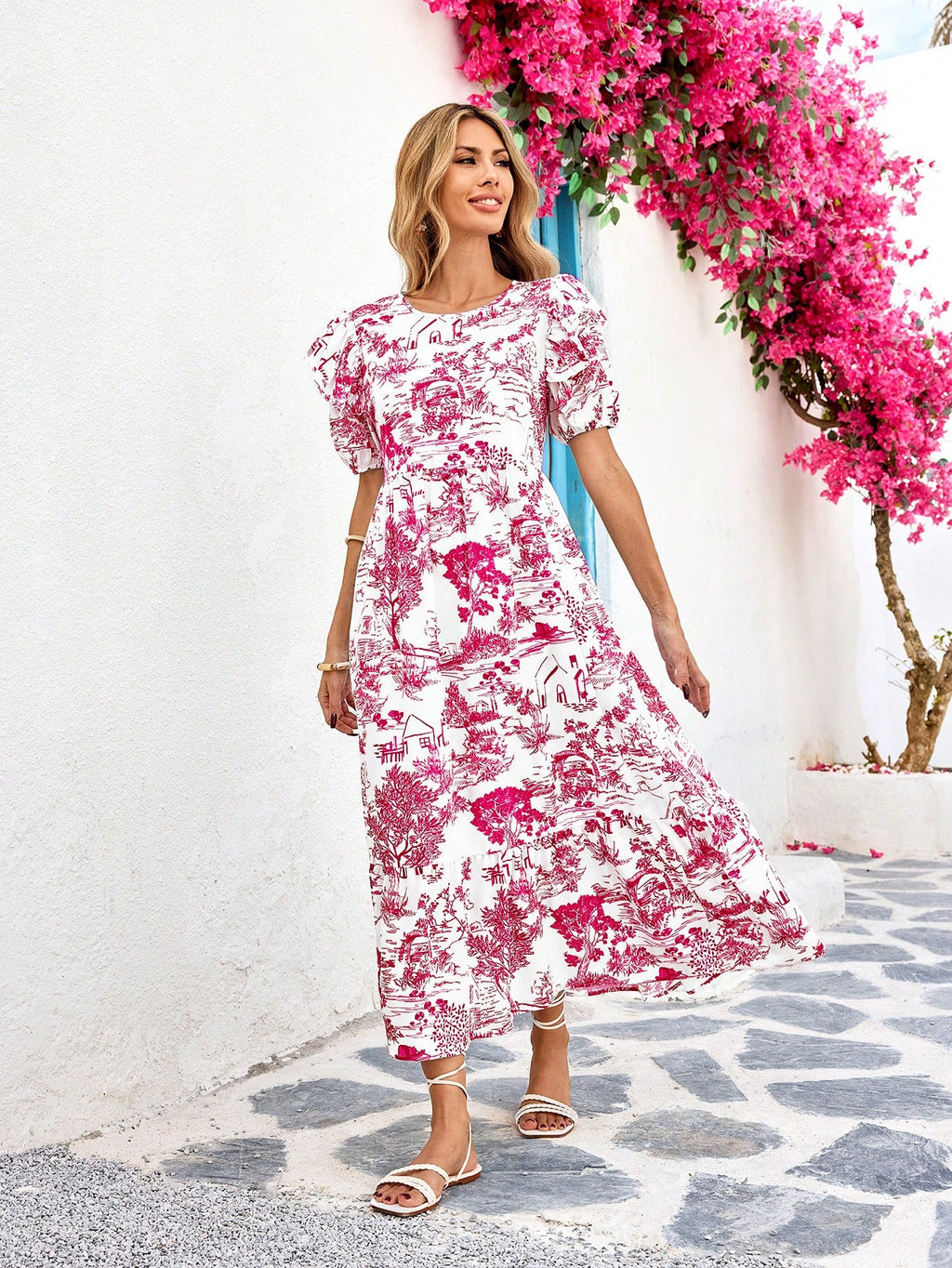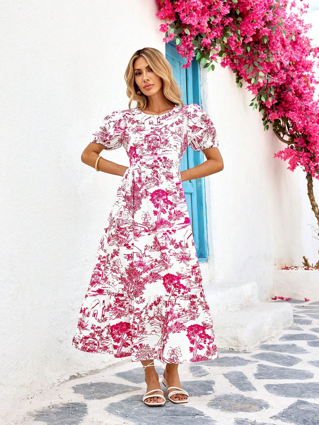MIU Woven Print Short Sleeve Fitted Women's Mid-Calf Dress,Pastel Dresses For Women,Vacation Style
