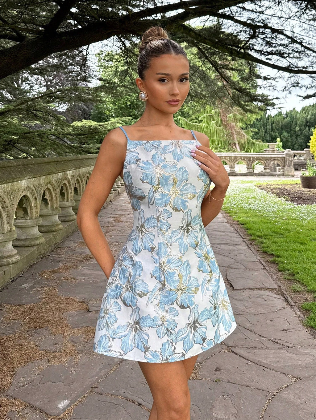 MIU ženska haljina na naramenice od žakarda s 3D cvjetnim ukrasima — luksuzna haljina za bankete i zabave. Francuski kroj bez leđa s izrezima, elegantna princezanski stilizovana haljina, seksi i graciozna, idealna za ljeto, rođendane i svečane prilike.