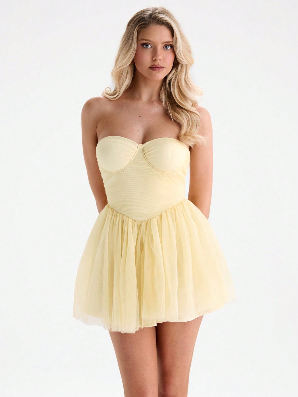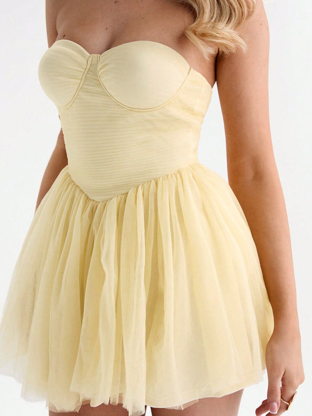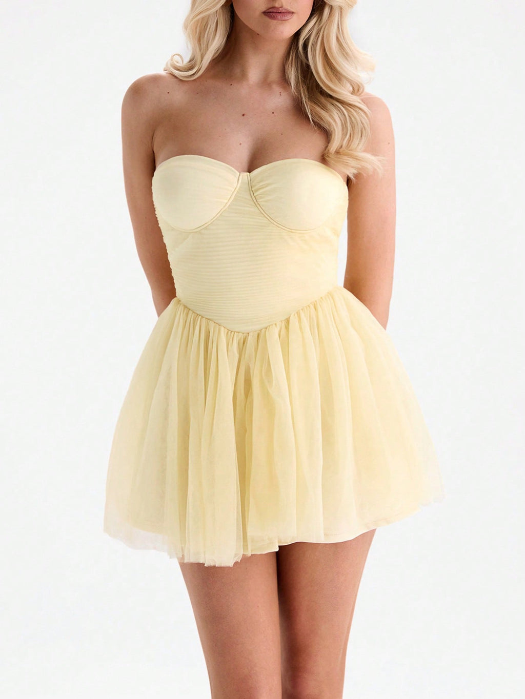MIU ženska ljetna mini haljina u maslačno žutoj boji — uski grudni dio od mrežastog materijala (bustier stil), savršena za koktel zabave i večernje izlaske. Elegantna, ženstvena i moderna, idealna za ljeto i svečane prilike.