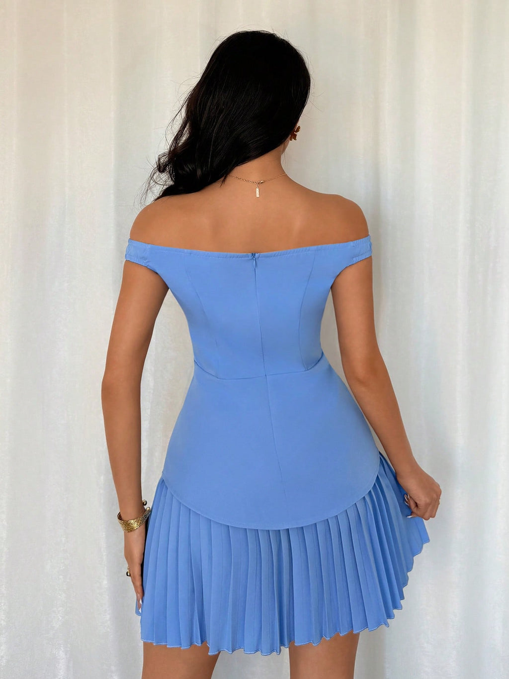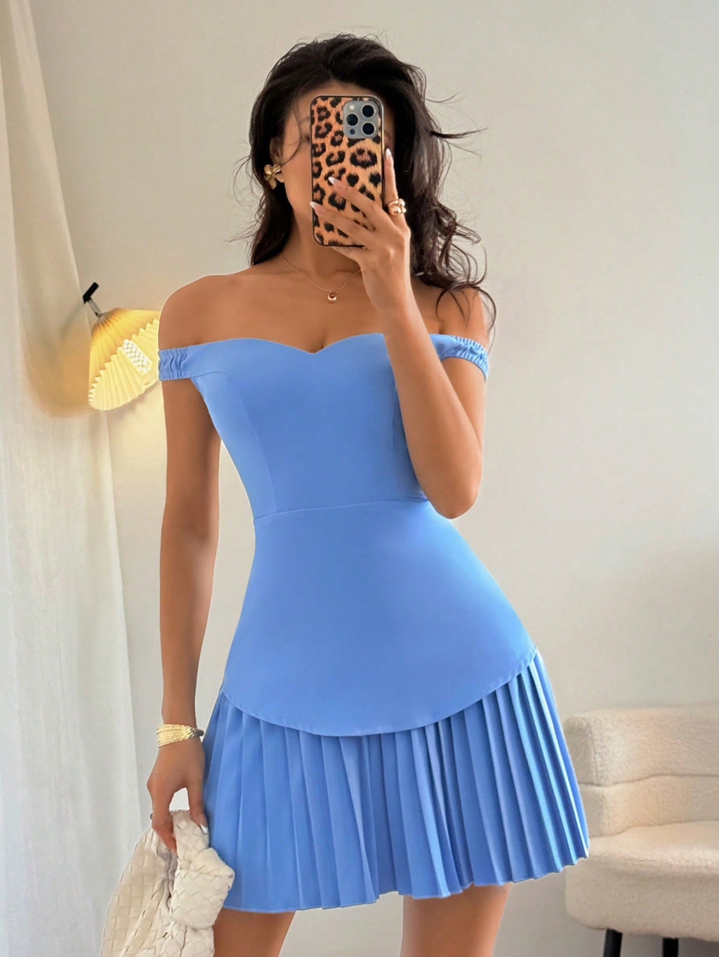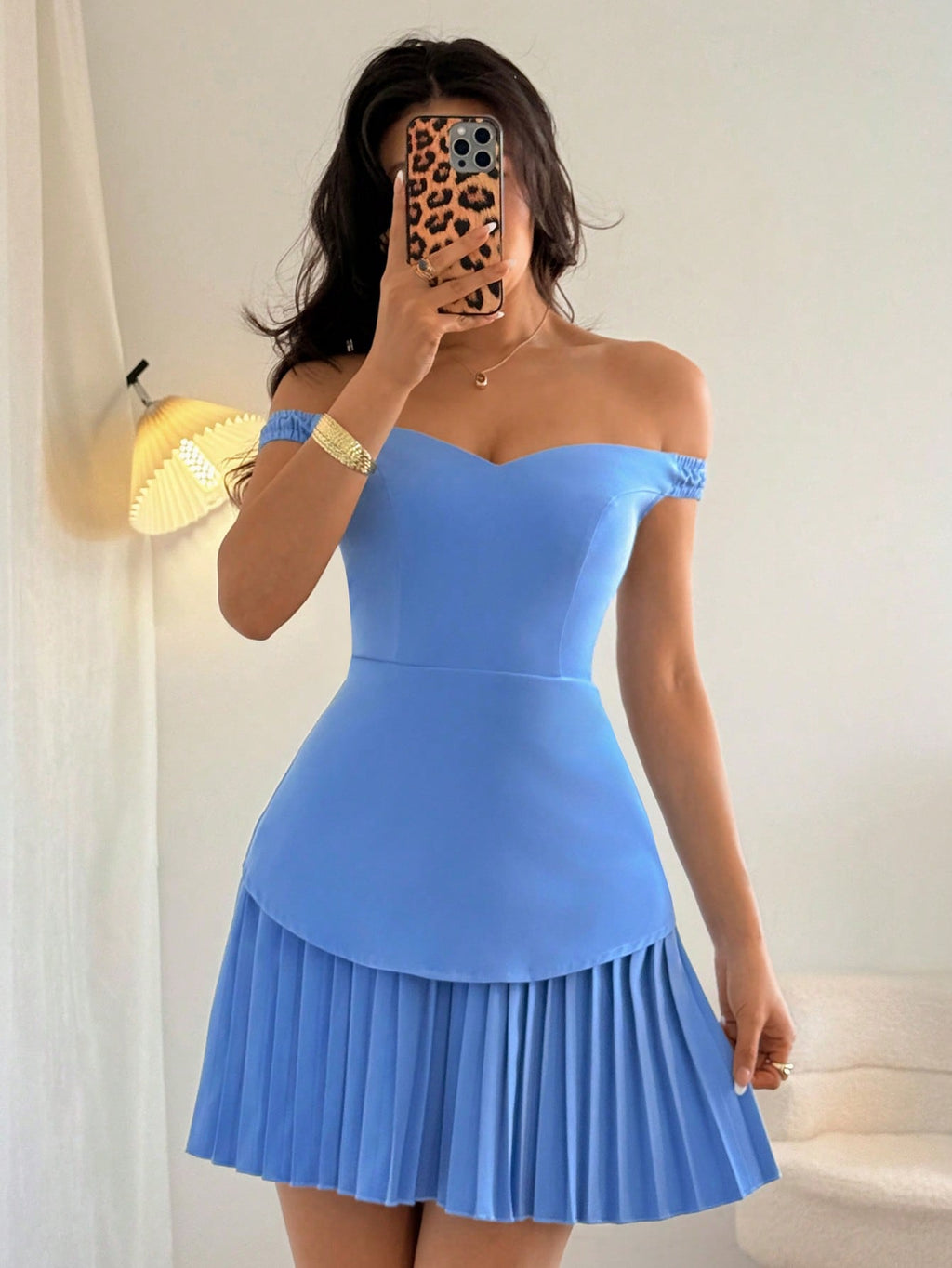 MIU ženska plava haljina s otvorenim ramenima i plisiranim strukom — moderna, elegantna, idealna za kancelariju, putovanja, odmor i romantične sastanke tokom ljeta.