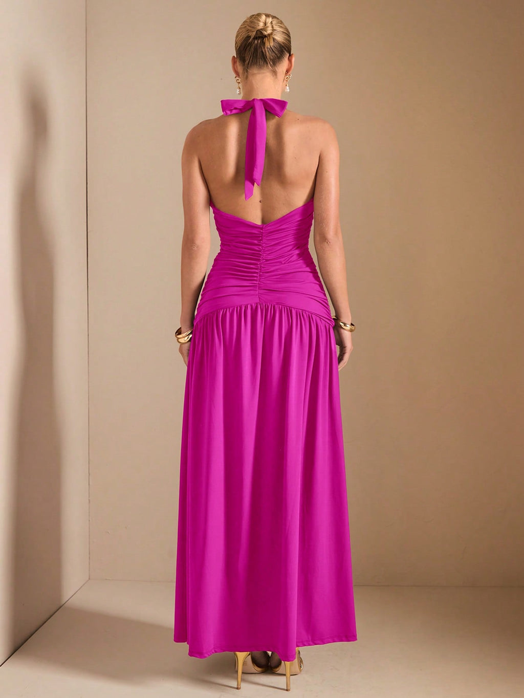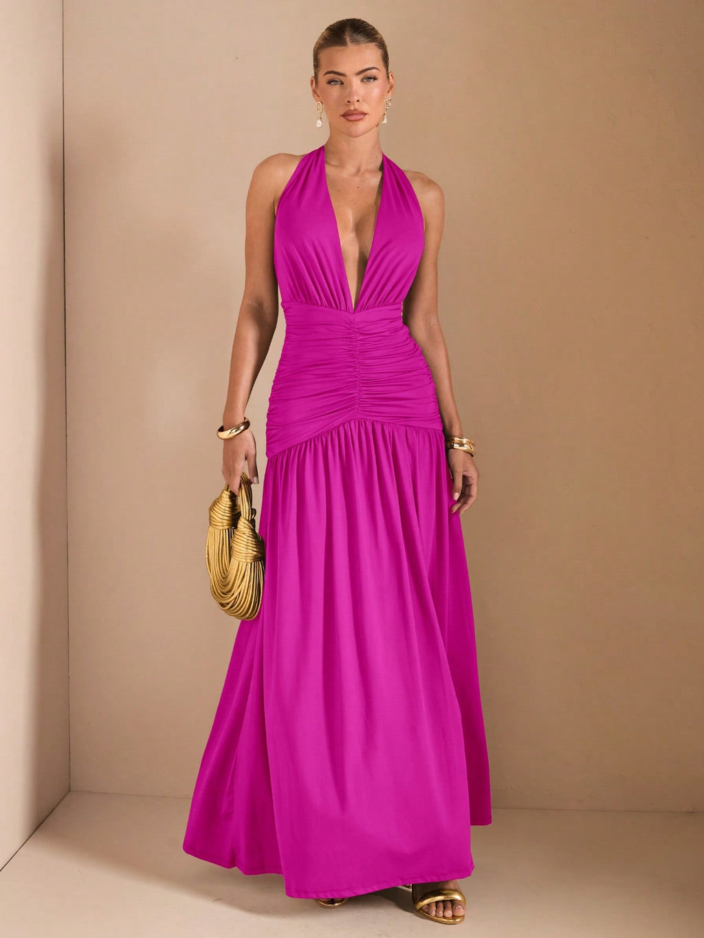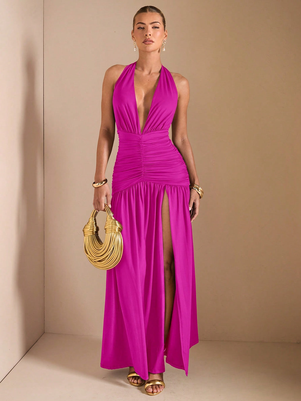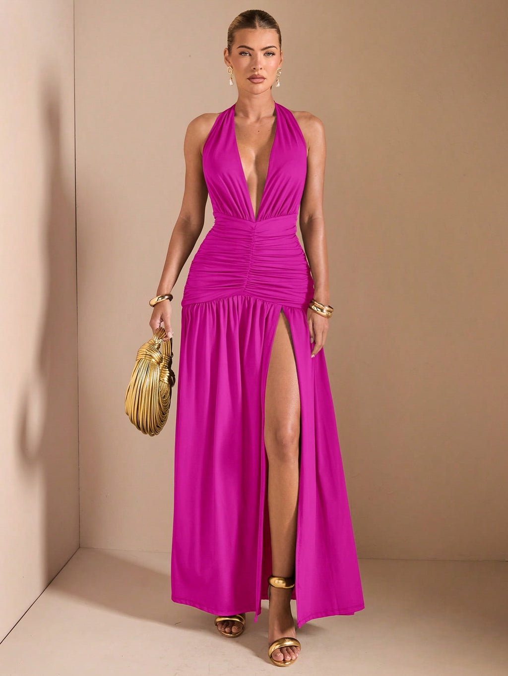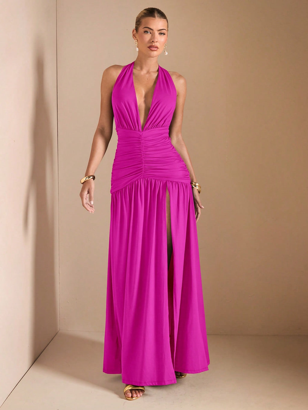 MiuVogue Autumn/Winter Minimalist Elegant Solid Color Coffee Brown Khaki Sexy Plunging V-Neck Backless High Slit Long Dress, Suitable For Party, Cocktail, Wedding Bridesmaid, Night Out