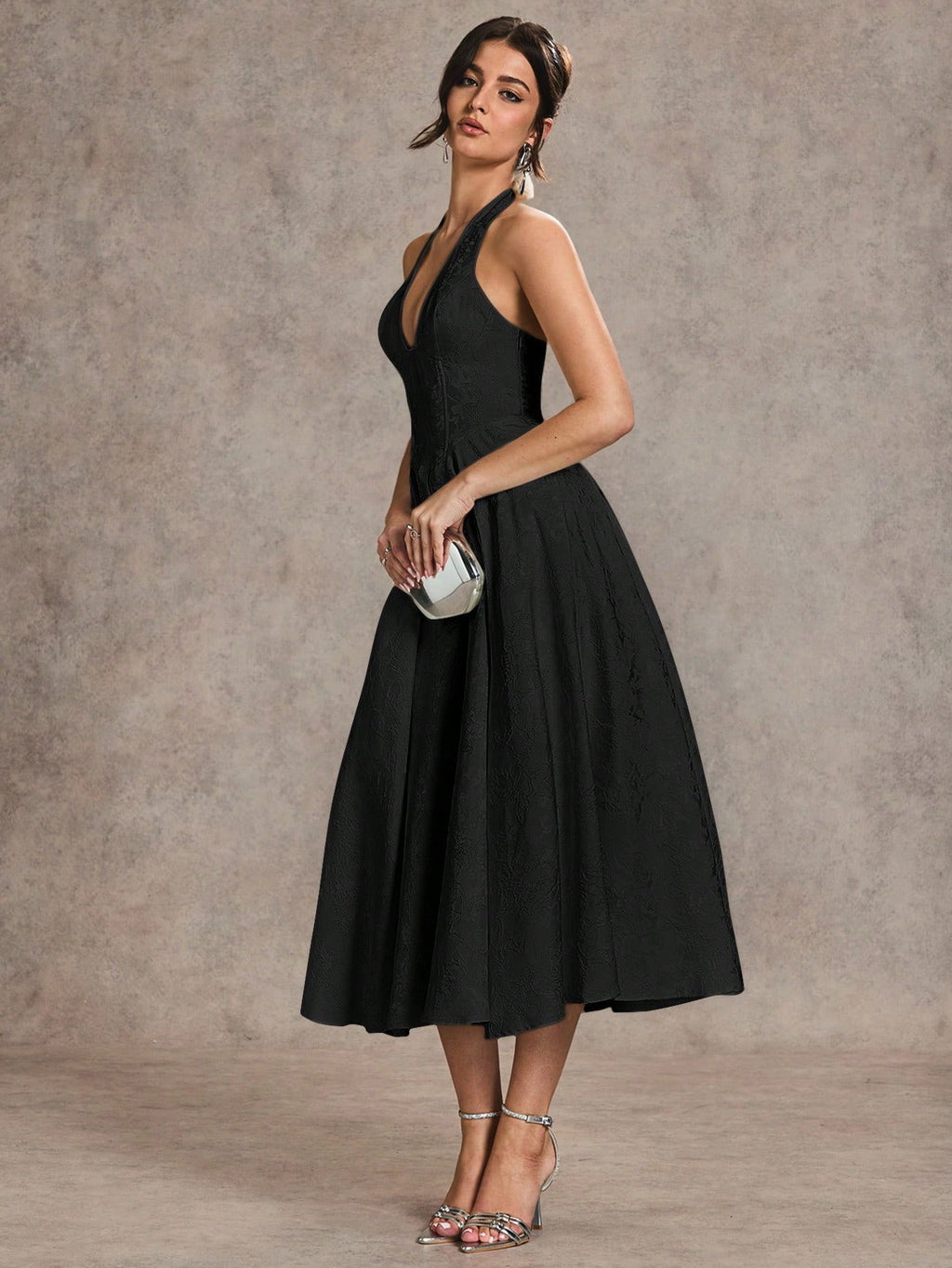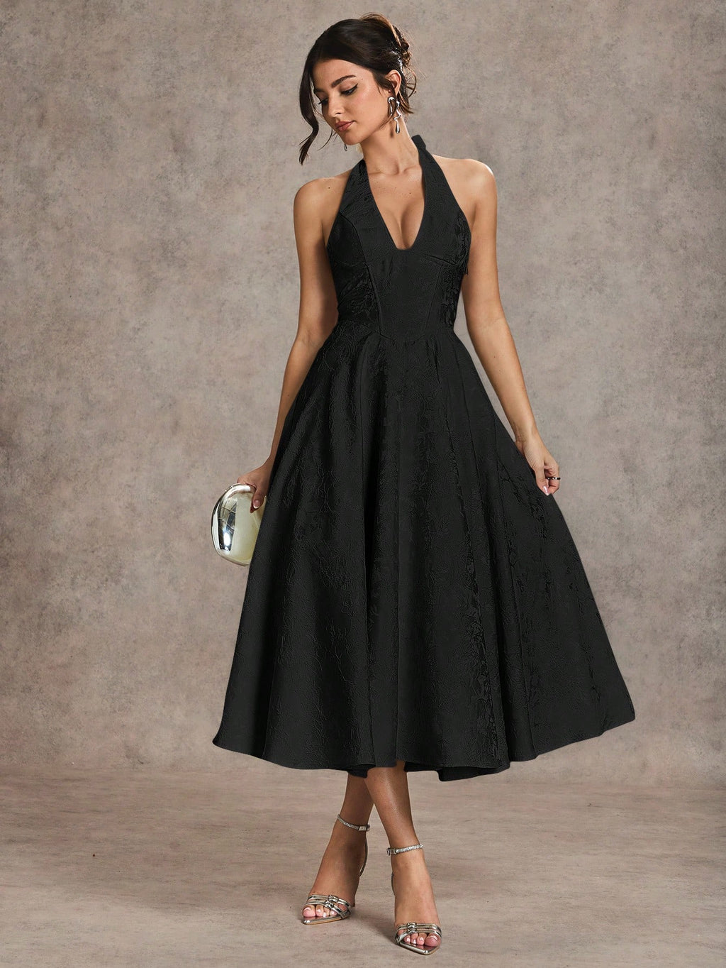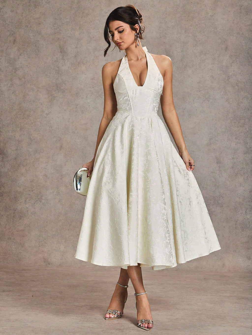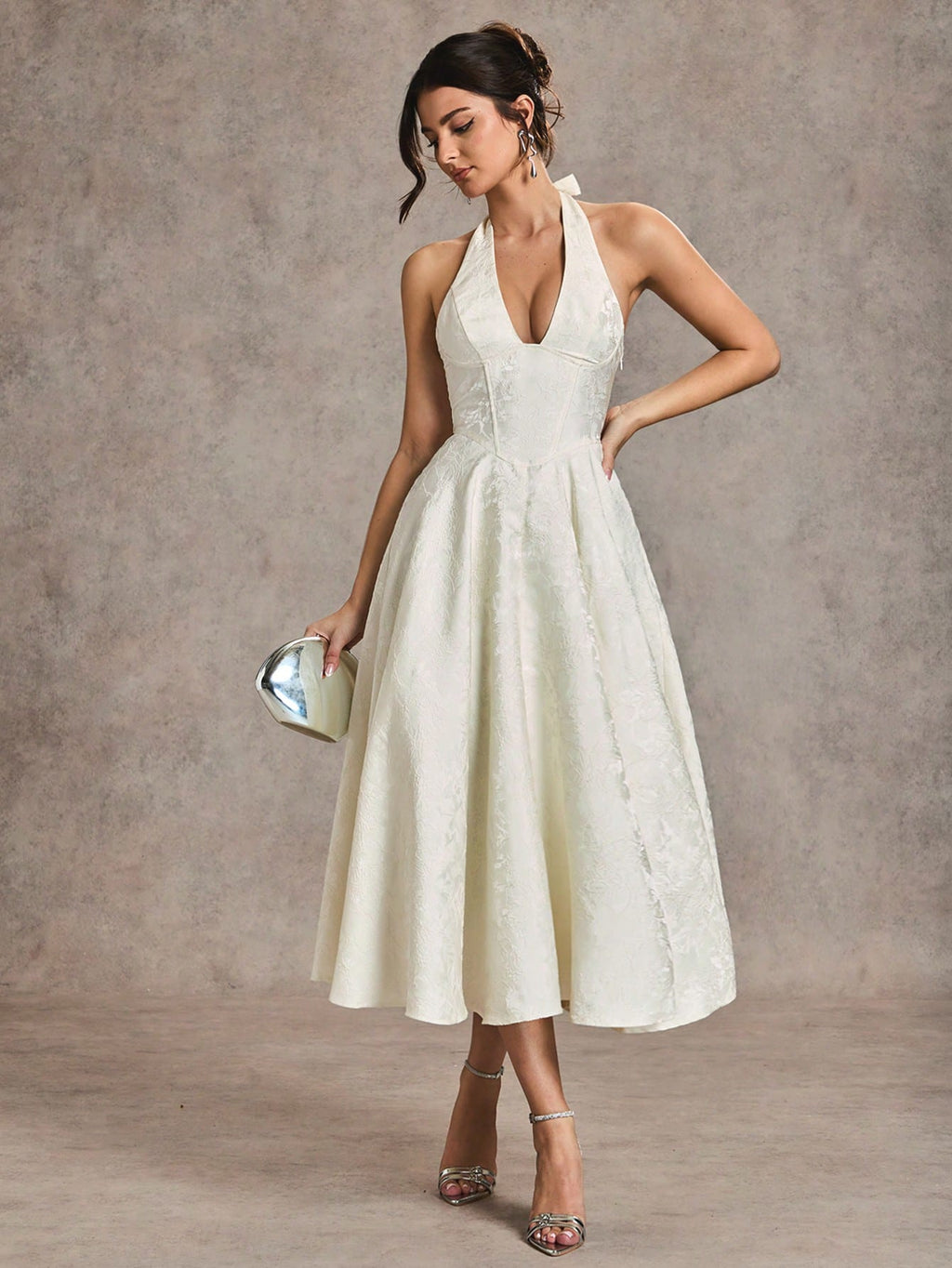 MiuVogue Elegant Women's Jacquard Satin Halter Tie-Up Party Dress, Fit For Daily Wear, Dating, Outing, Nightclub, Party, Princess Style With Bow Accent, Autumn Dress, Halloween Costume,Summer Dresses For Women,White Graduation Dress,Backless Dress