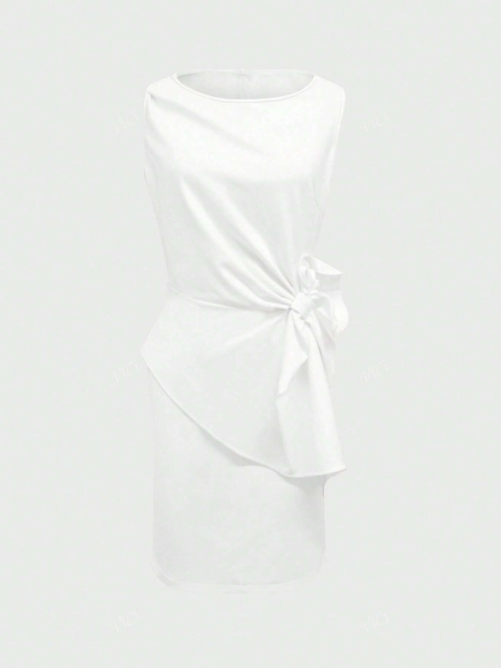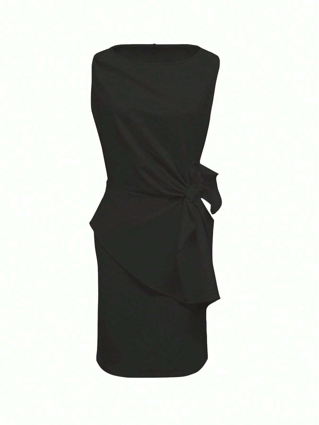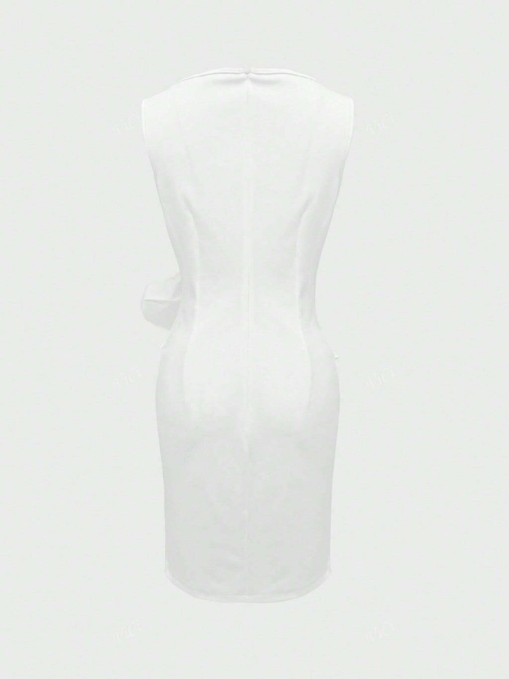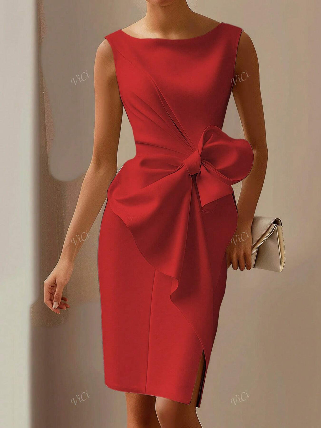MiuVogue New Arrival Women's Solid Color Bow Decor Round Neck Sleeveless Slit Hem Elegant French Style Bodycon Dress